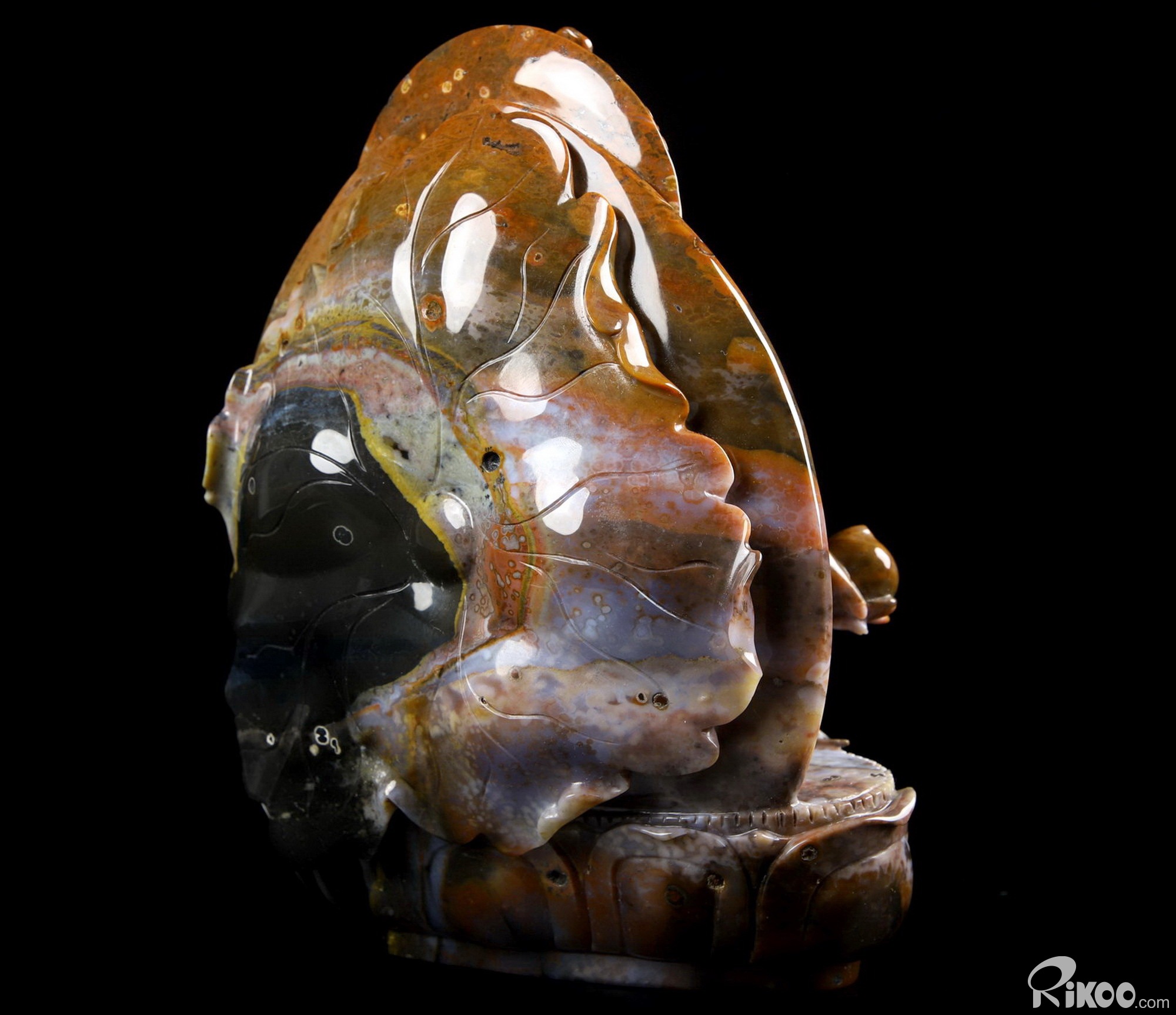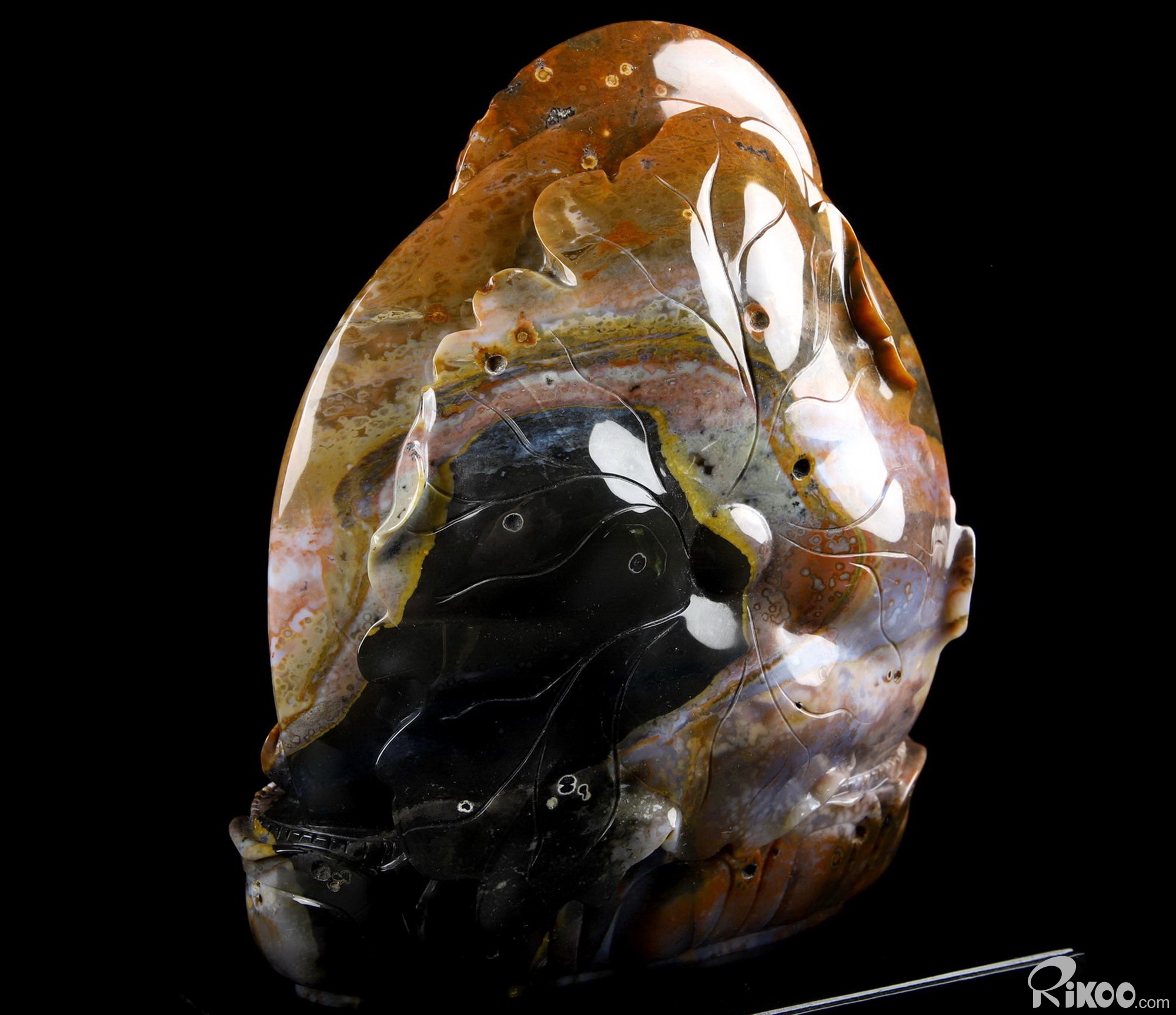 An intricately detailed sculpture crafted from a wonderfully colorful Black Zebra Agate specimen!