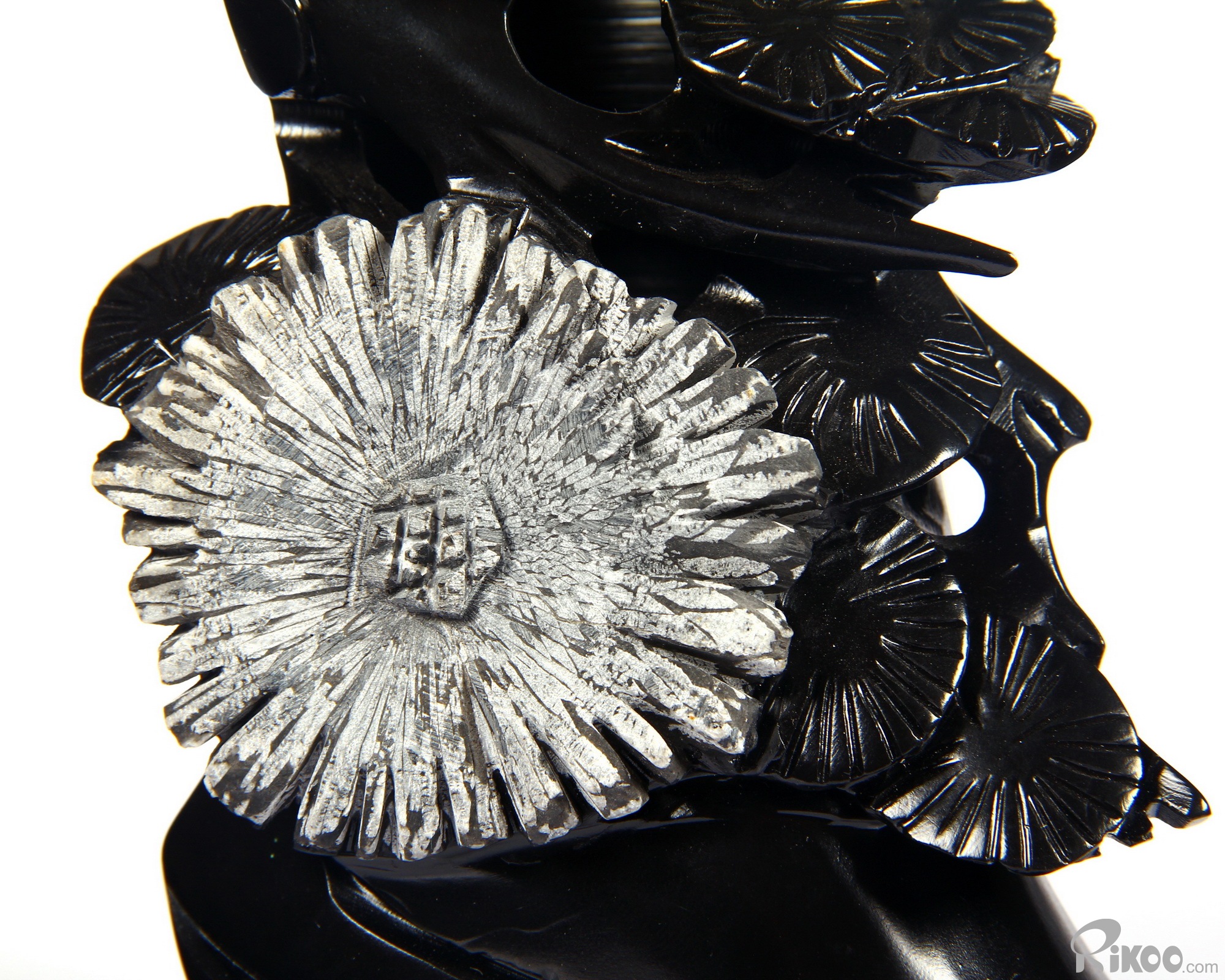 The stone contains patterns exactly like chrysanthemum, so it is called chrysanthemum stone. It is natural, rare and unparalleled. It is unique in the world. Chrysanthemum stone was first excavated and carved in the early of Qing Dynasty. When people built a dam, they found that the stone used for the dam contained patterns like chrysanthemum, thus different propitious shapes were carved out of the stone. Because of their lively appearance and unique shape, later the carvings were listed in the tributes to the king.