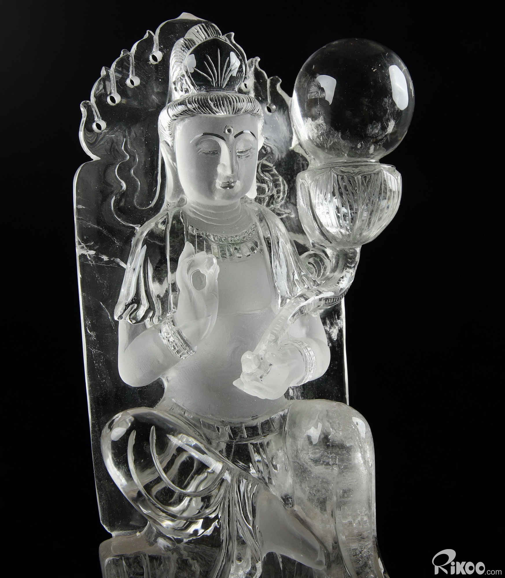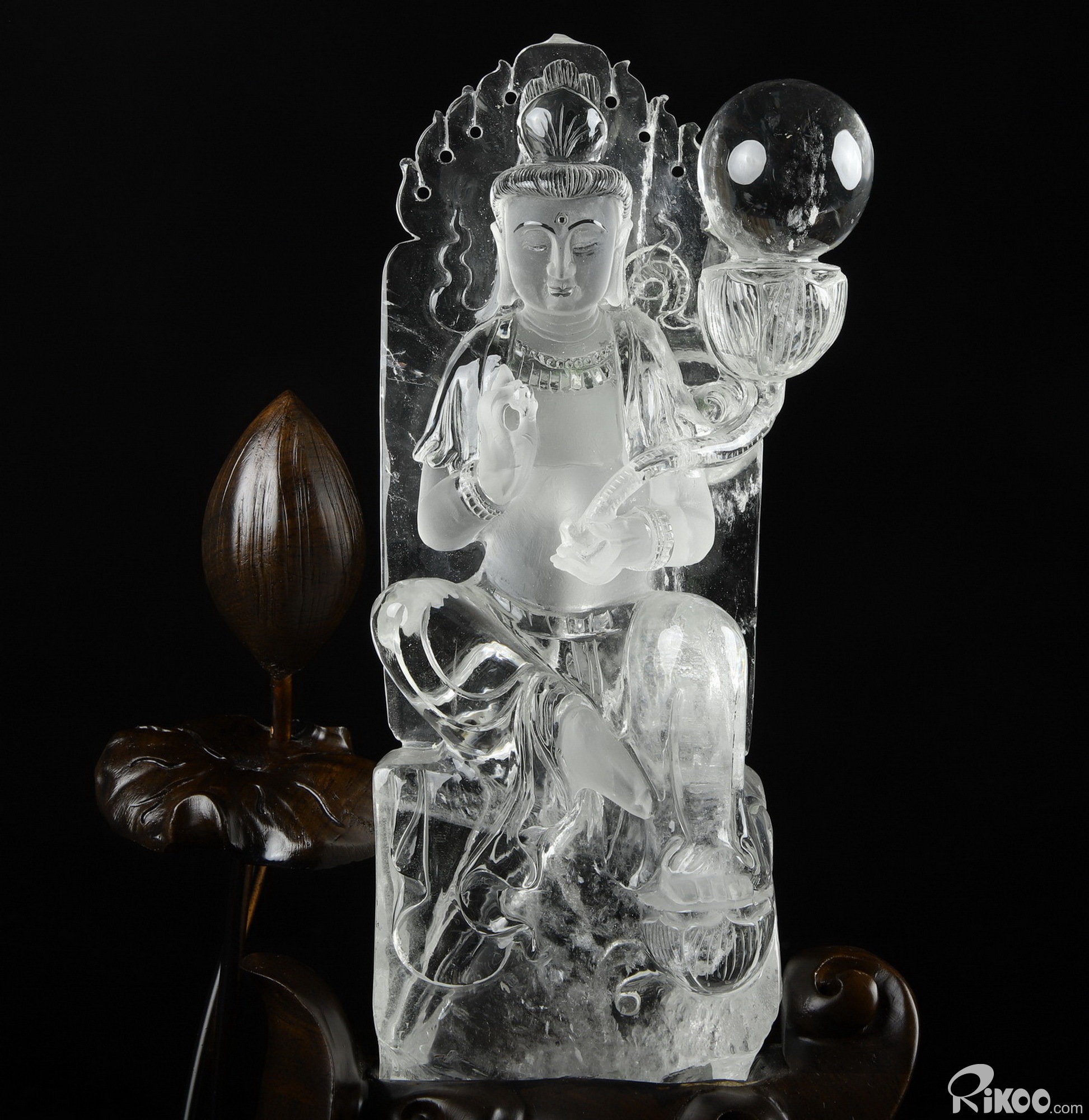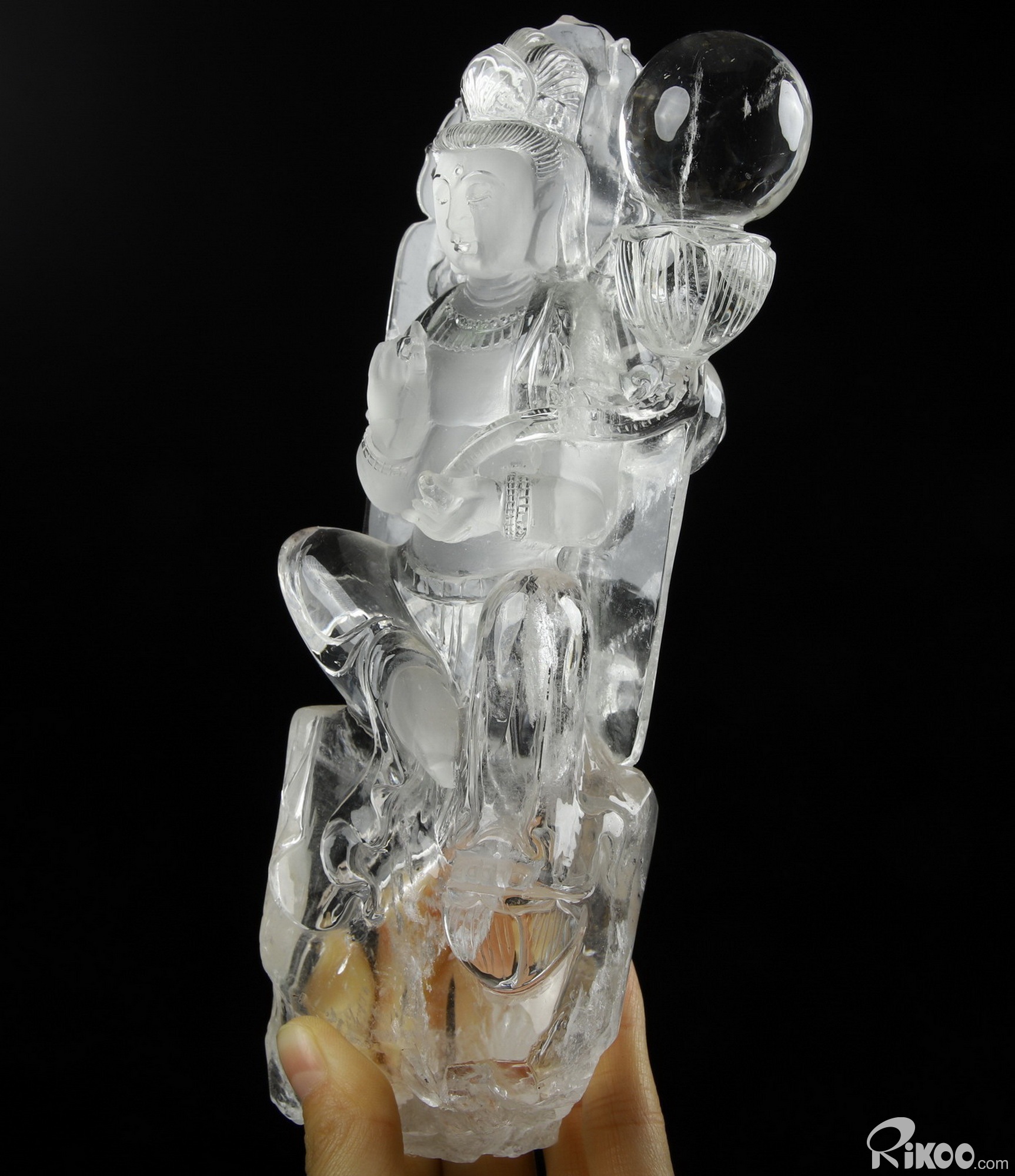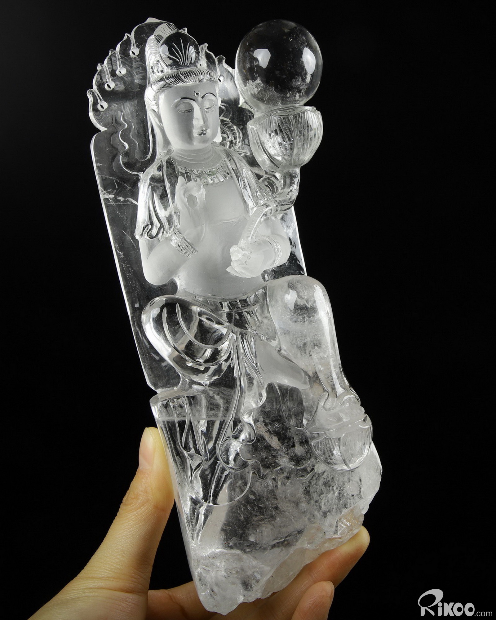 Clear 12.2" Quartz Rock Crystal Carved Crystal Kwan-yin Guanyin Sculpture & Stand, Crystal Healing