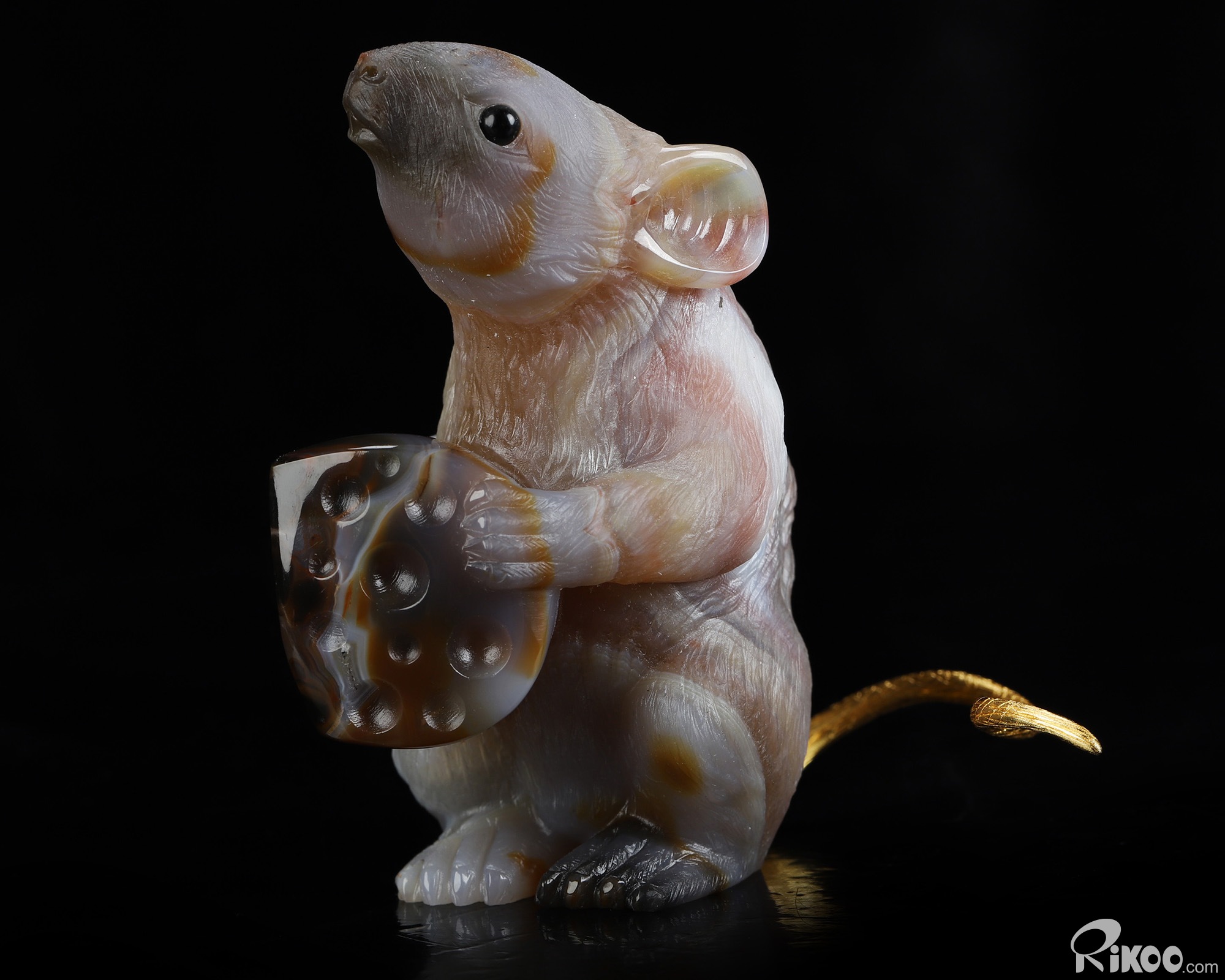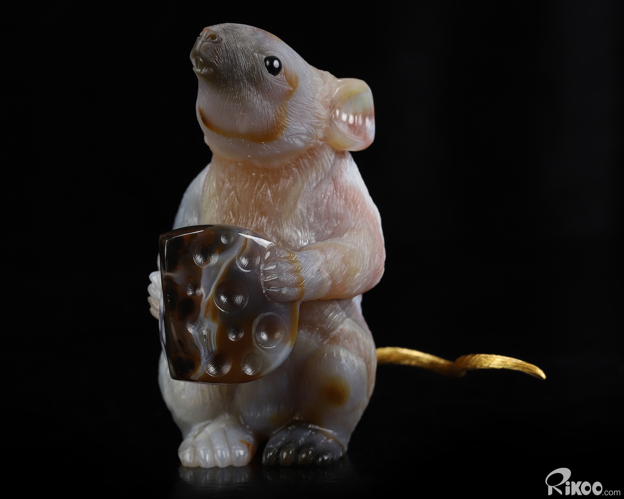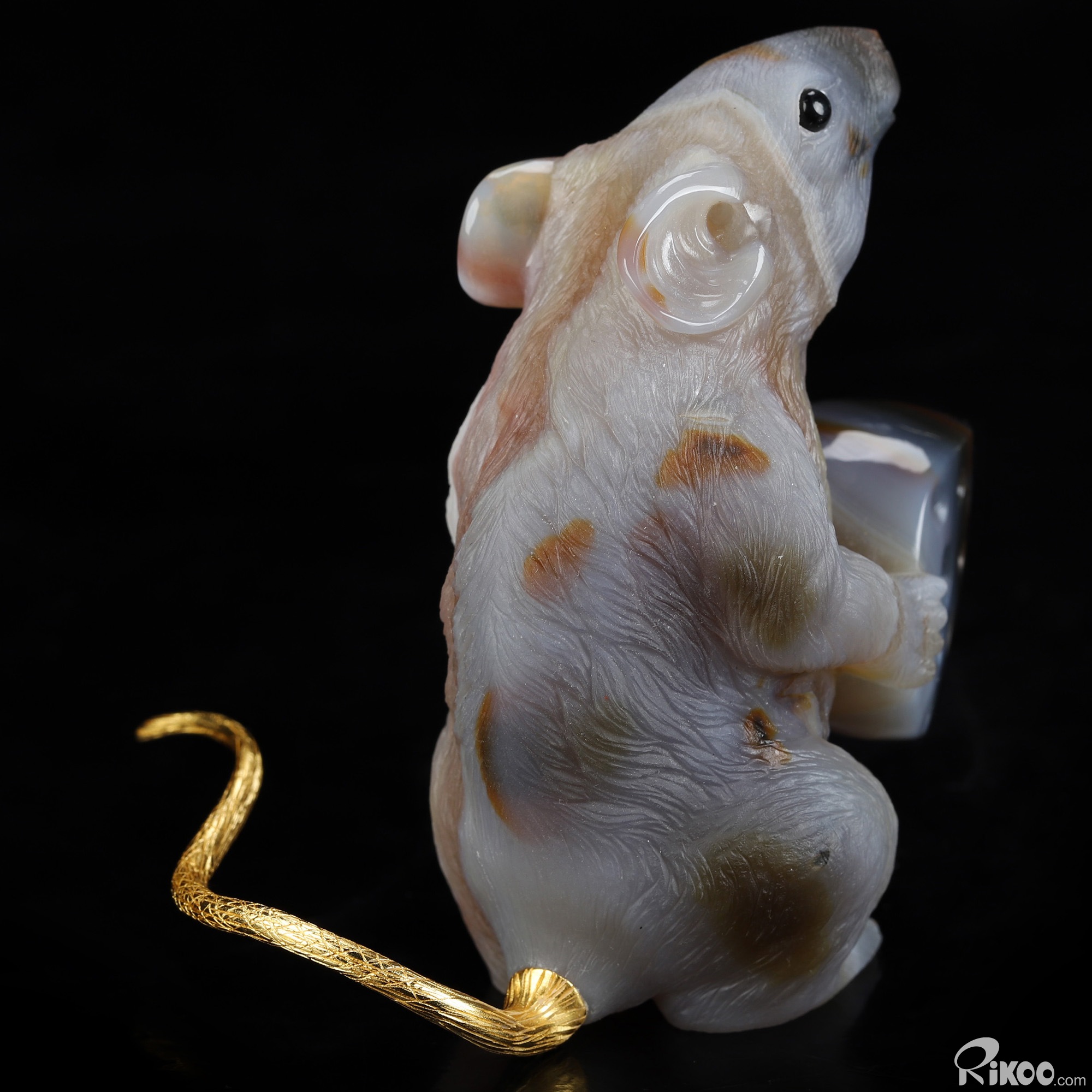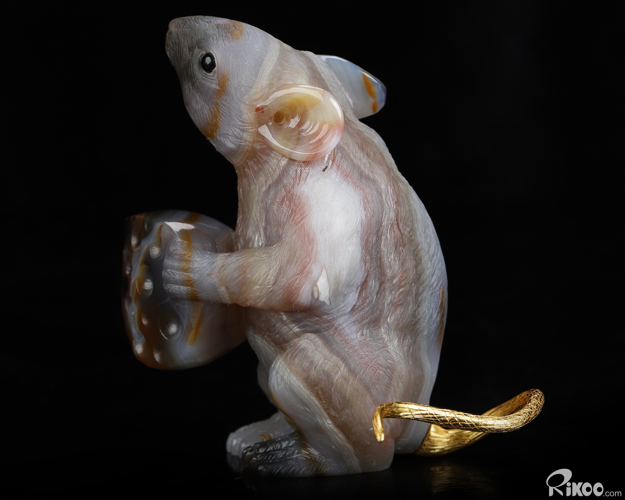 Cuddle of Cheesy Curdle - 3.5" Premium Brazilian Agate Hand Carved Crystal Mouse and 18K Gold Plated 925 Silver Tail, Crystal Healing