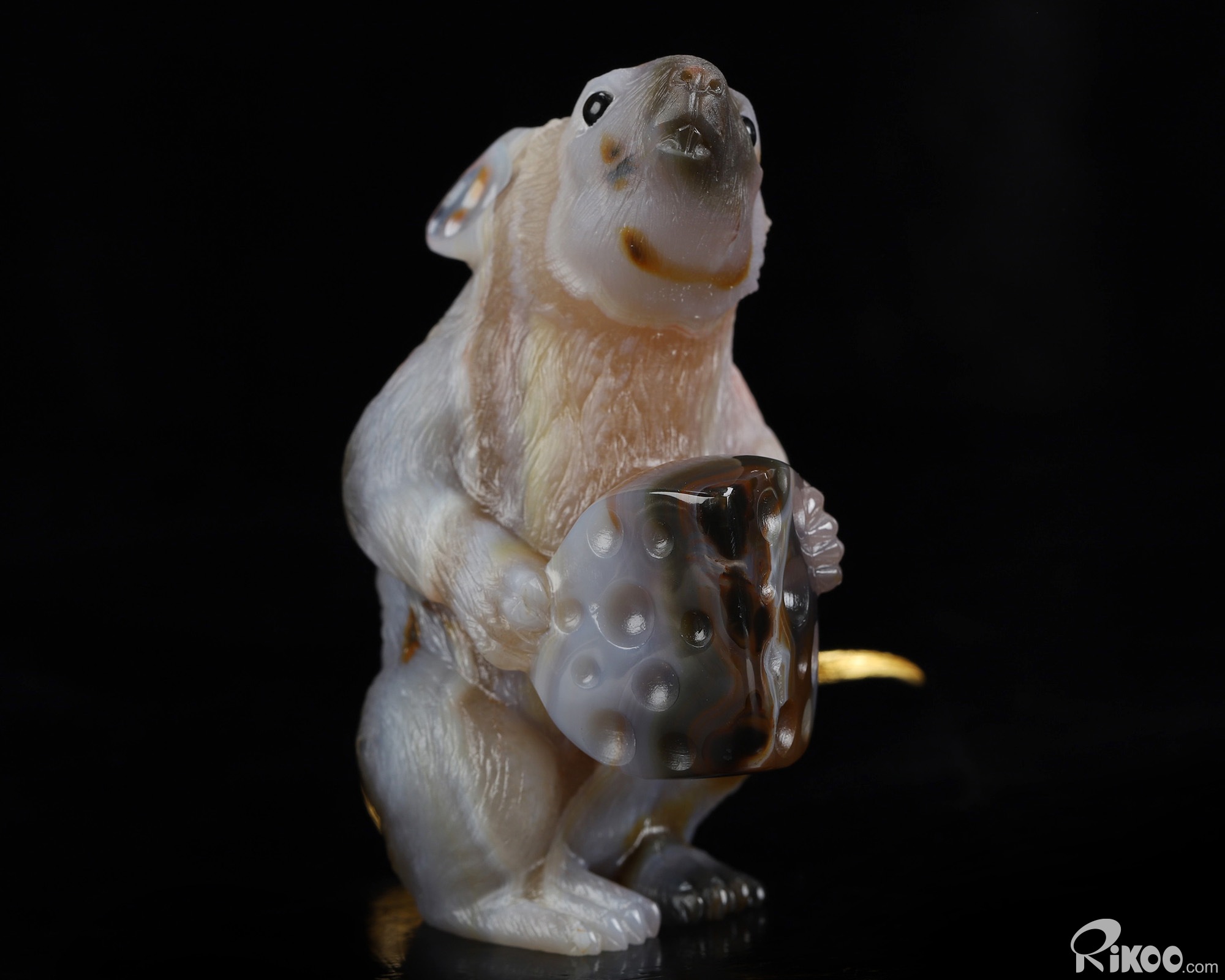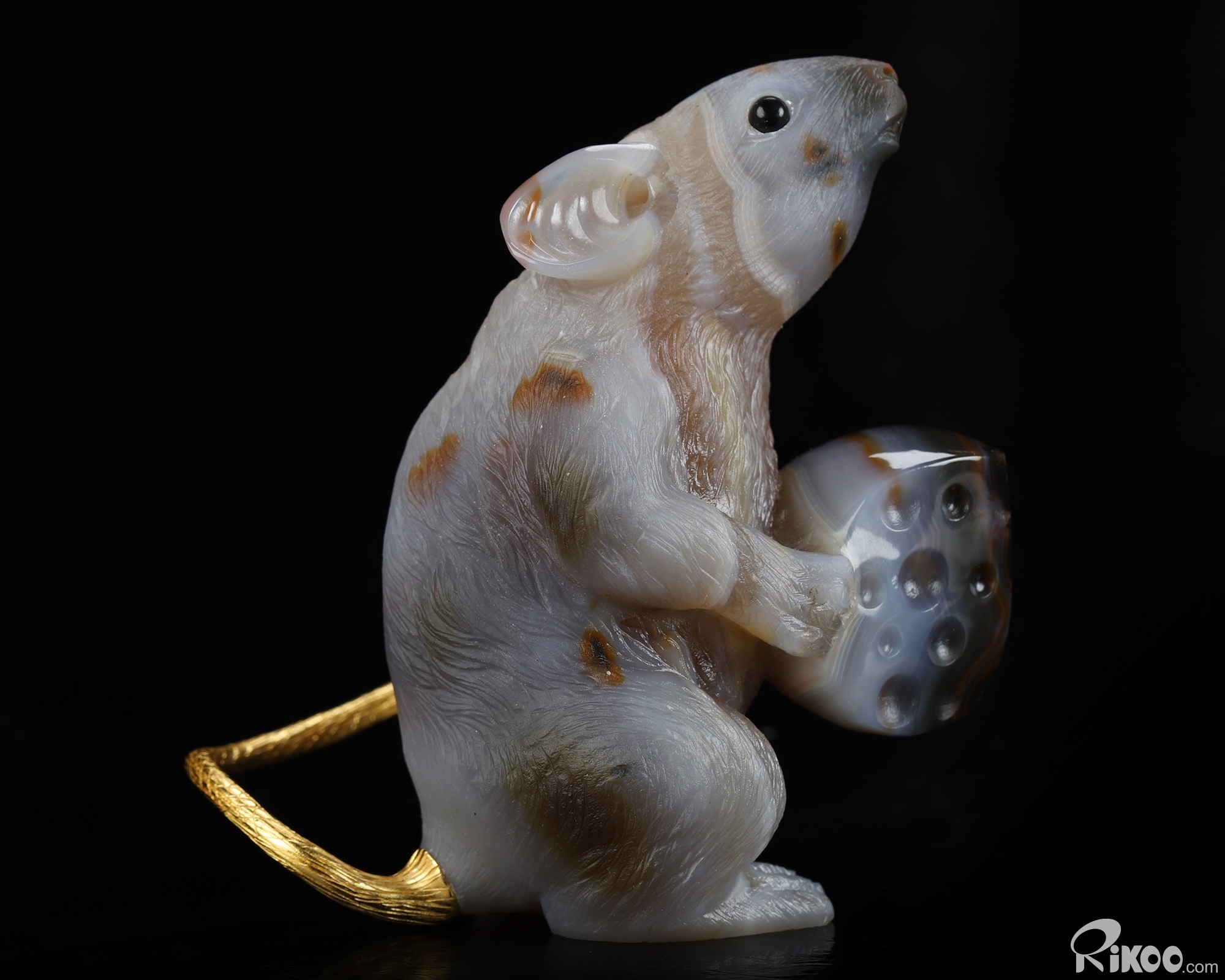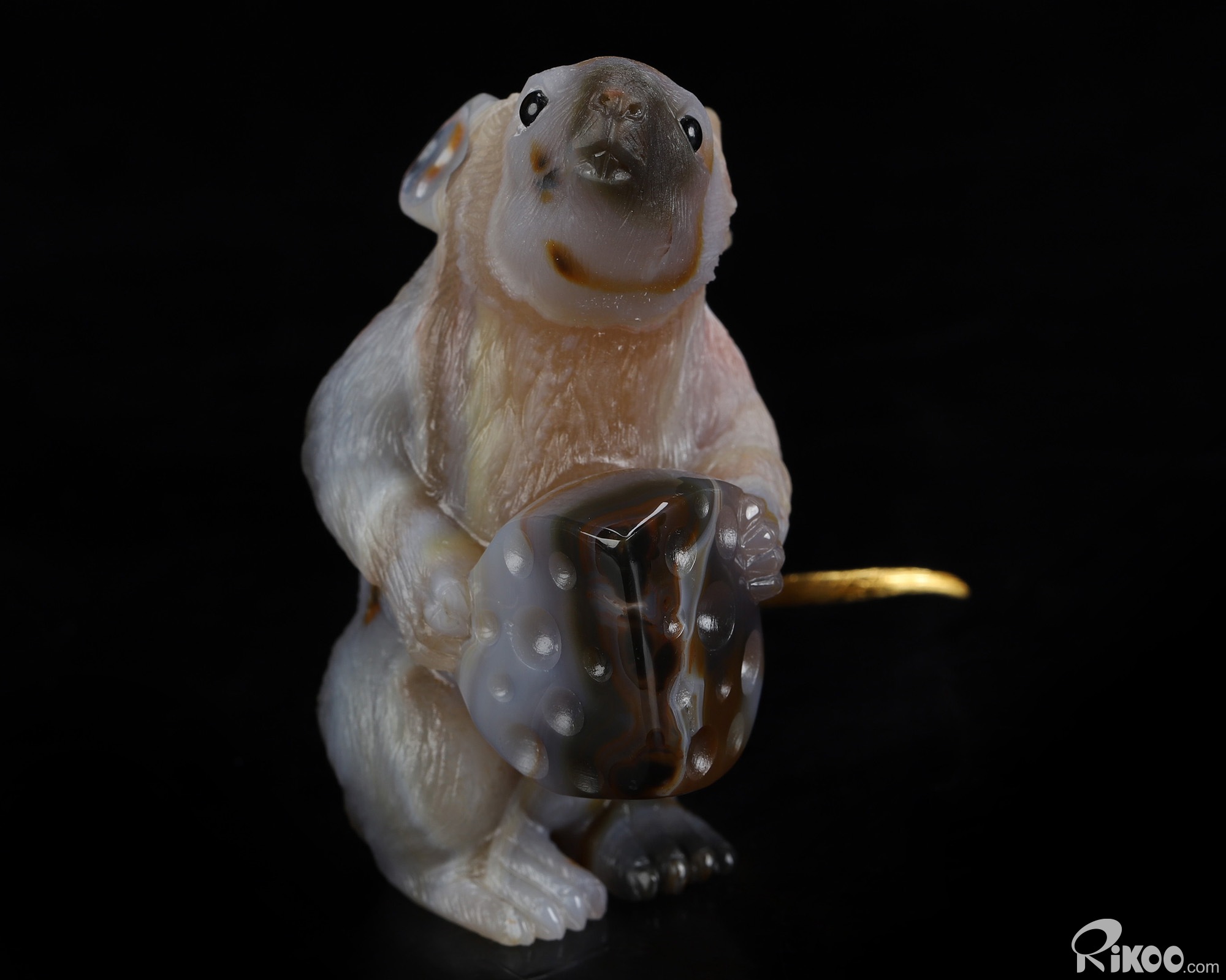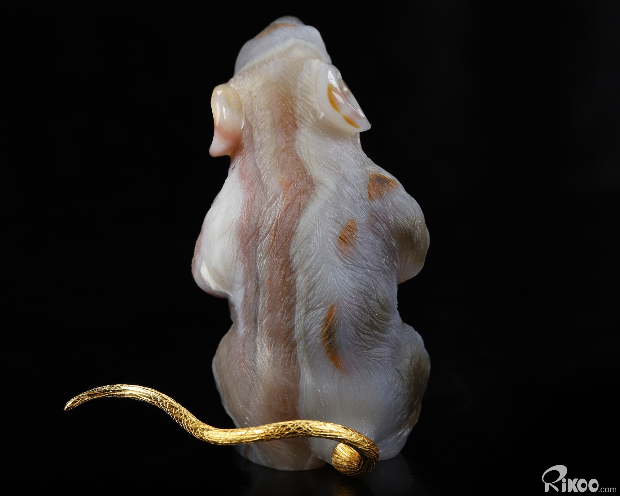 Cuddle of Cheesy Curdle - 3.5" Premium Brazilian Agate Hand Carved Crystal Mouse and 18K Gold Plated 925 Silver Tail, Crystal Healing