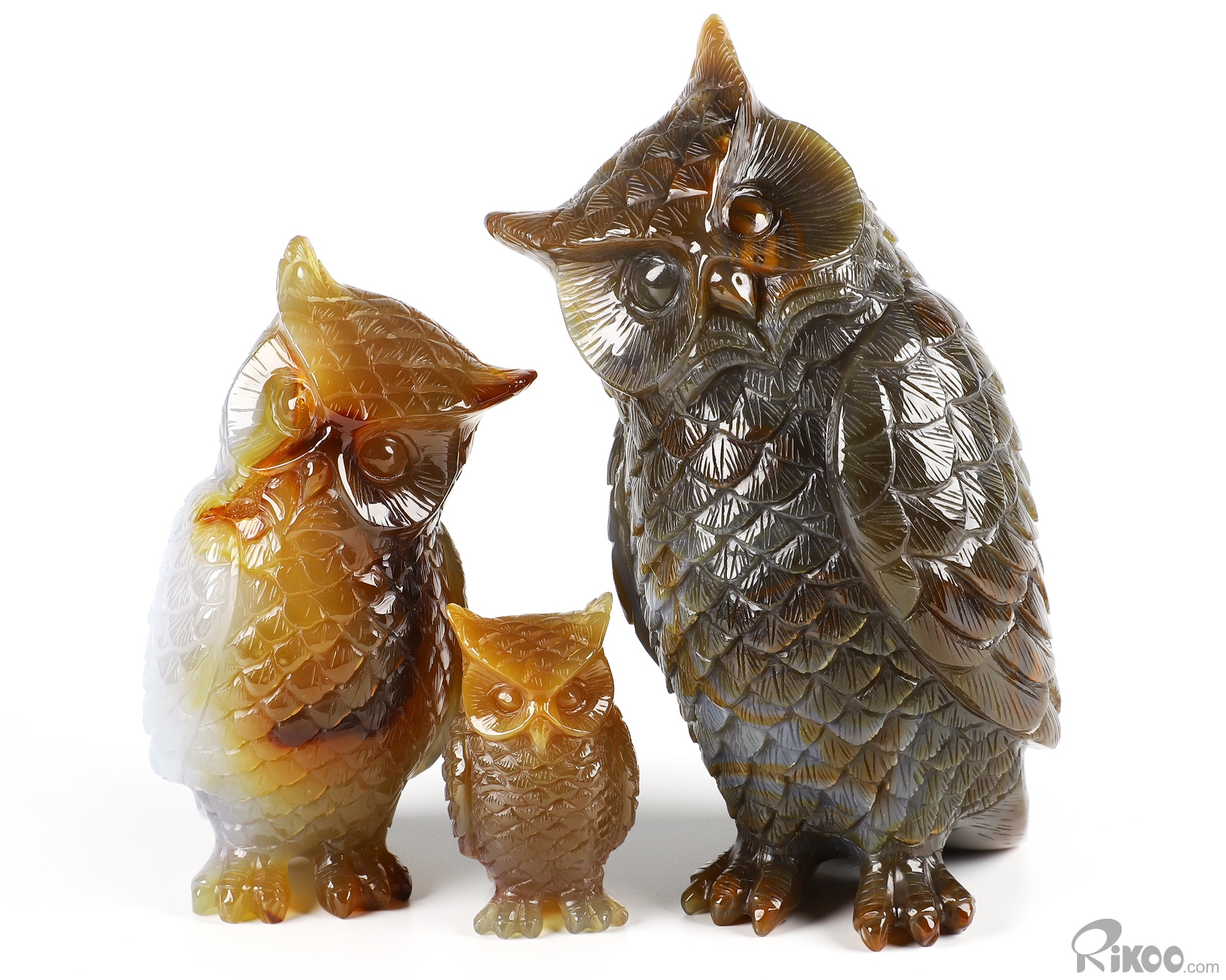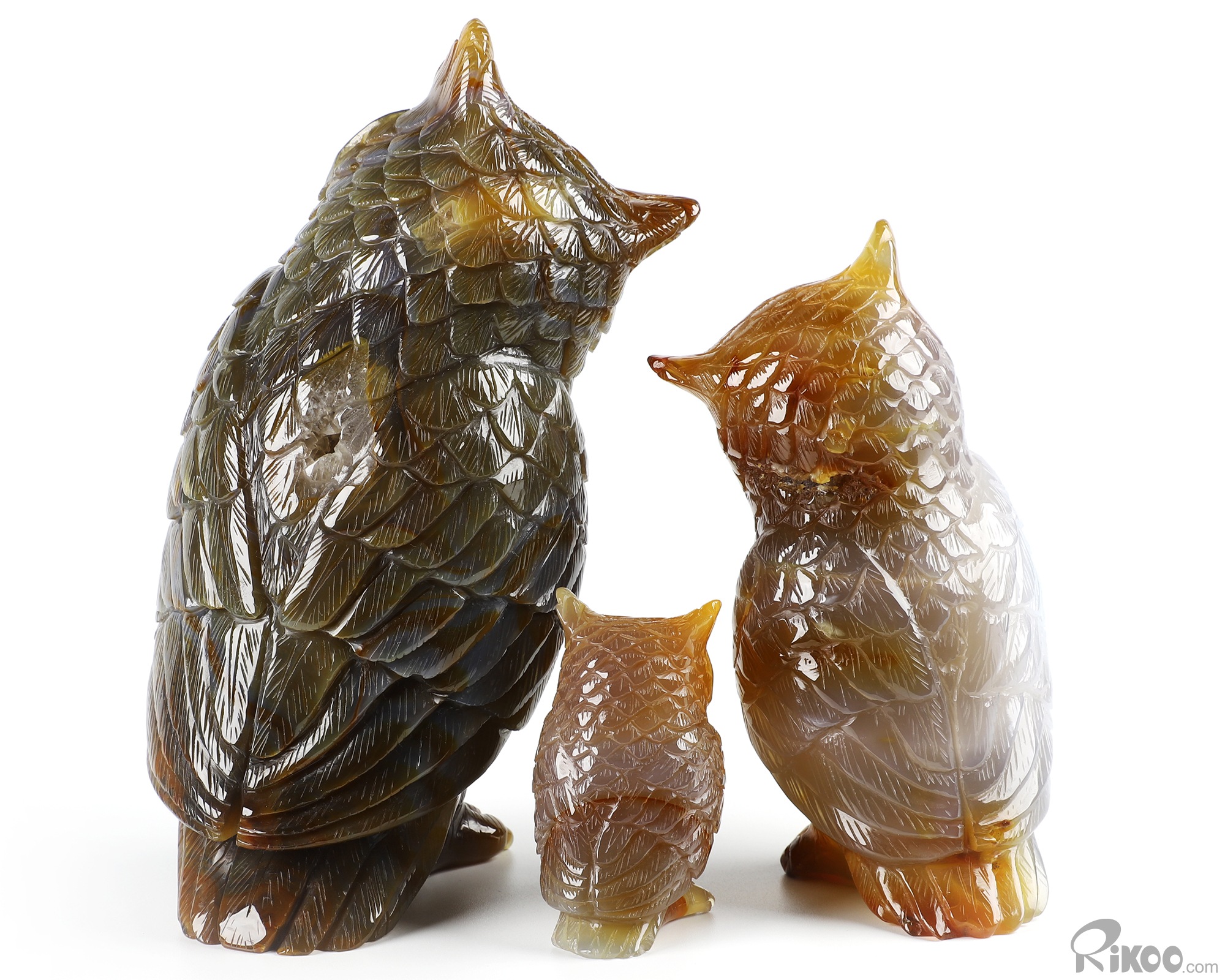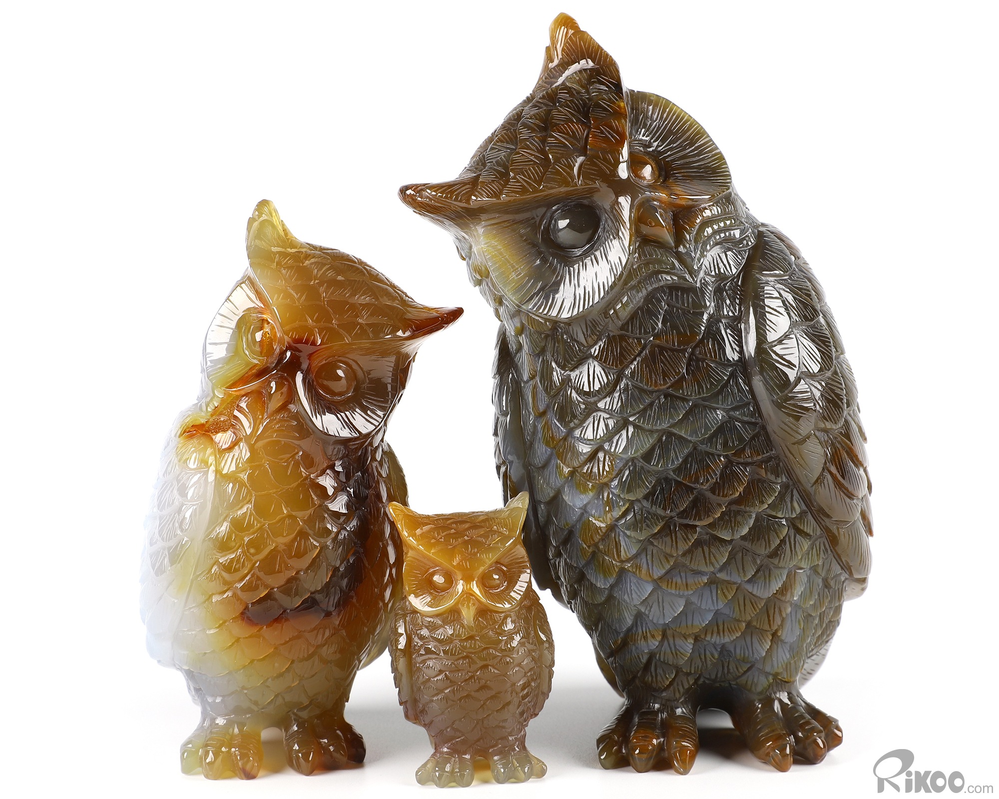 Cute 5.7" Agate Carved Crystal Owl family Sculpture, Realistic, Crystal Healing
