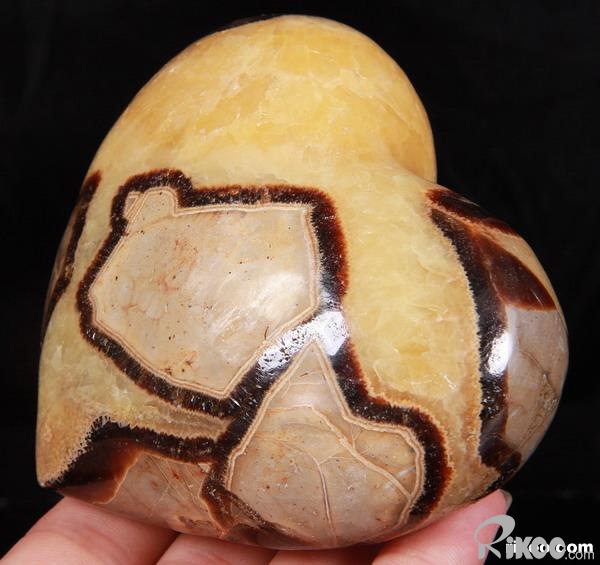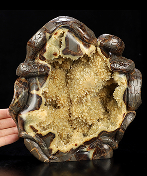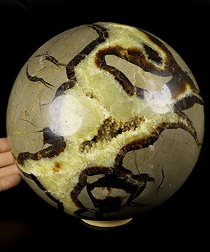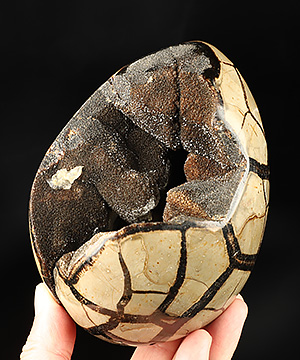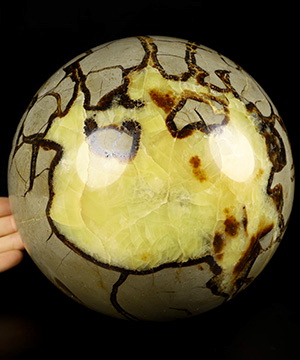 Septarian is a geode that is a combination of yellow calcite, brown aragonite, grey limestone and white/clear barite, thus it has properties of each of its component minerals. Septarian is brings calming energies which have a nurturing feel to them, and can bring feelings of joy and spiritual uplifting. Septarian is used to enhance and nurture communication with groups, making it much easier to speak clearly and kindly in group settings.Septarian is also used to assist with communication with Mother Earth. It is said to bring unconscious foreknowledge needed by the user to help him or her always be prepared for what is coming up. In crystal healing folklore, Septarian is used for healing of the blood and kidneys. Septarian is related to the lower chakras, root, sacral and solar plexus.