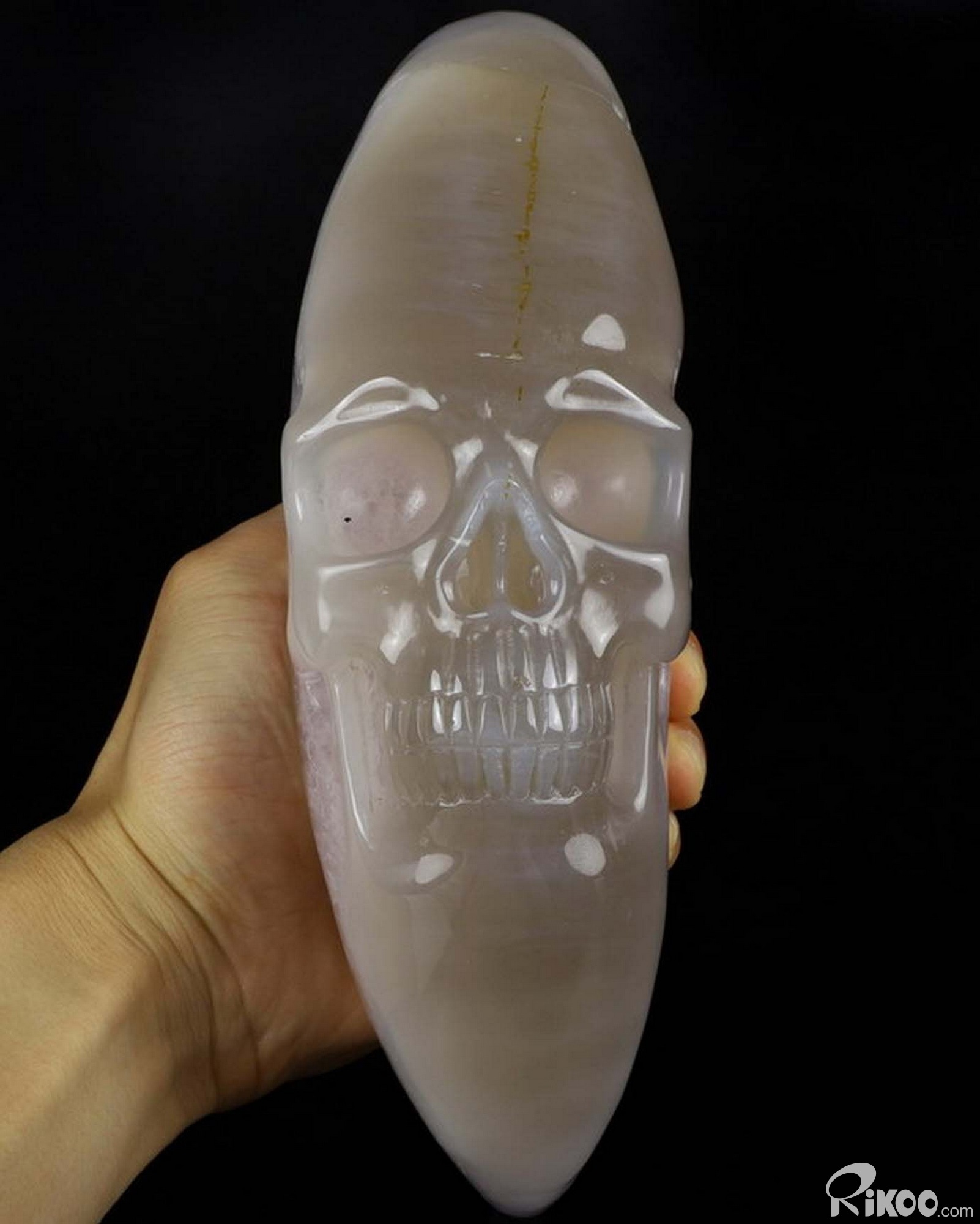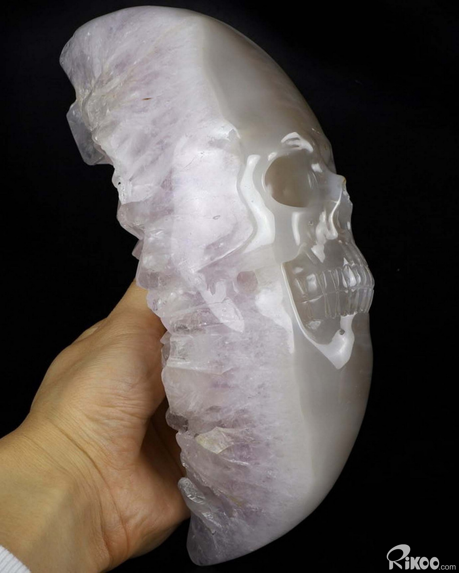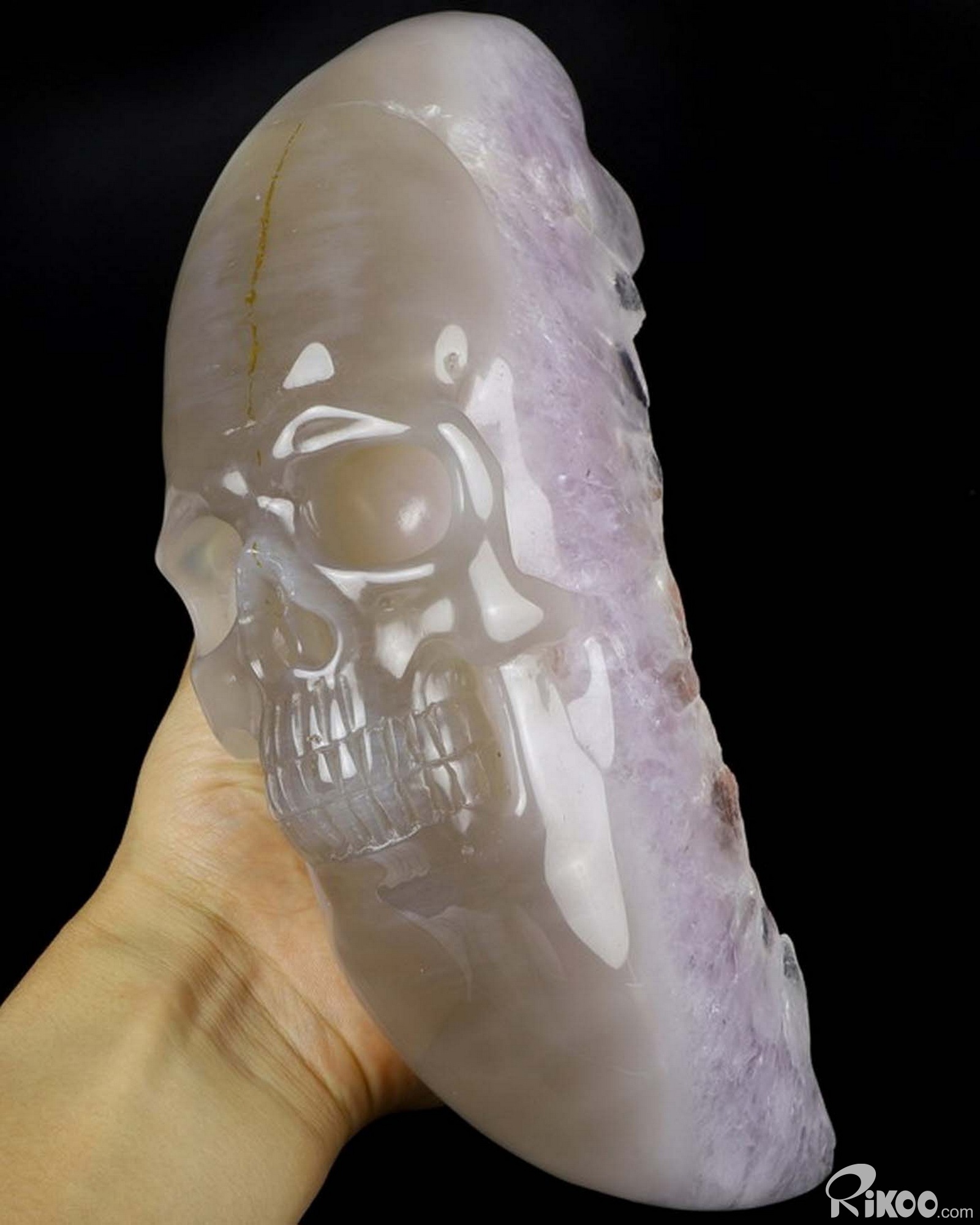 You are looking at a Amethyst & Agate skull. The skull is 9.3 inches long from front to back.