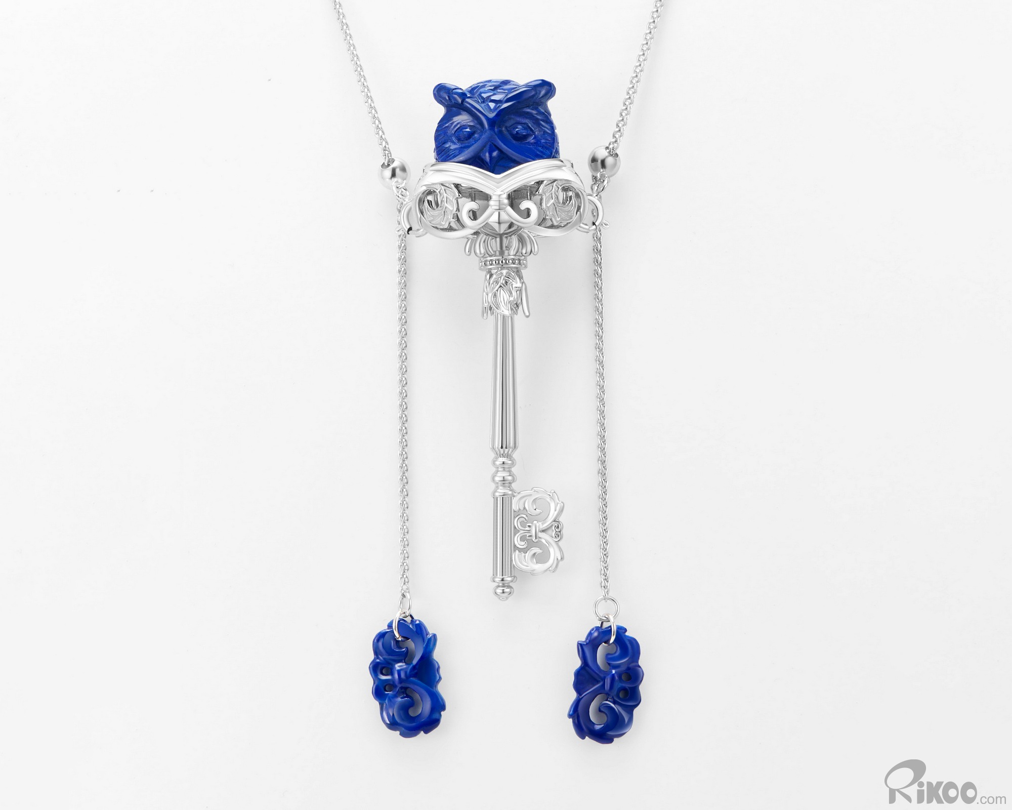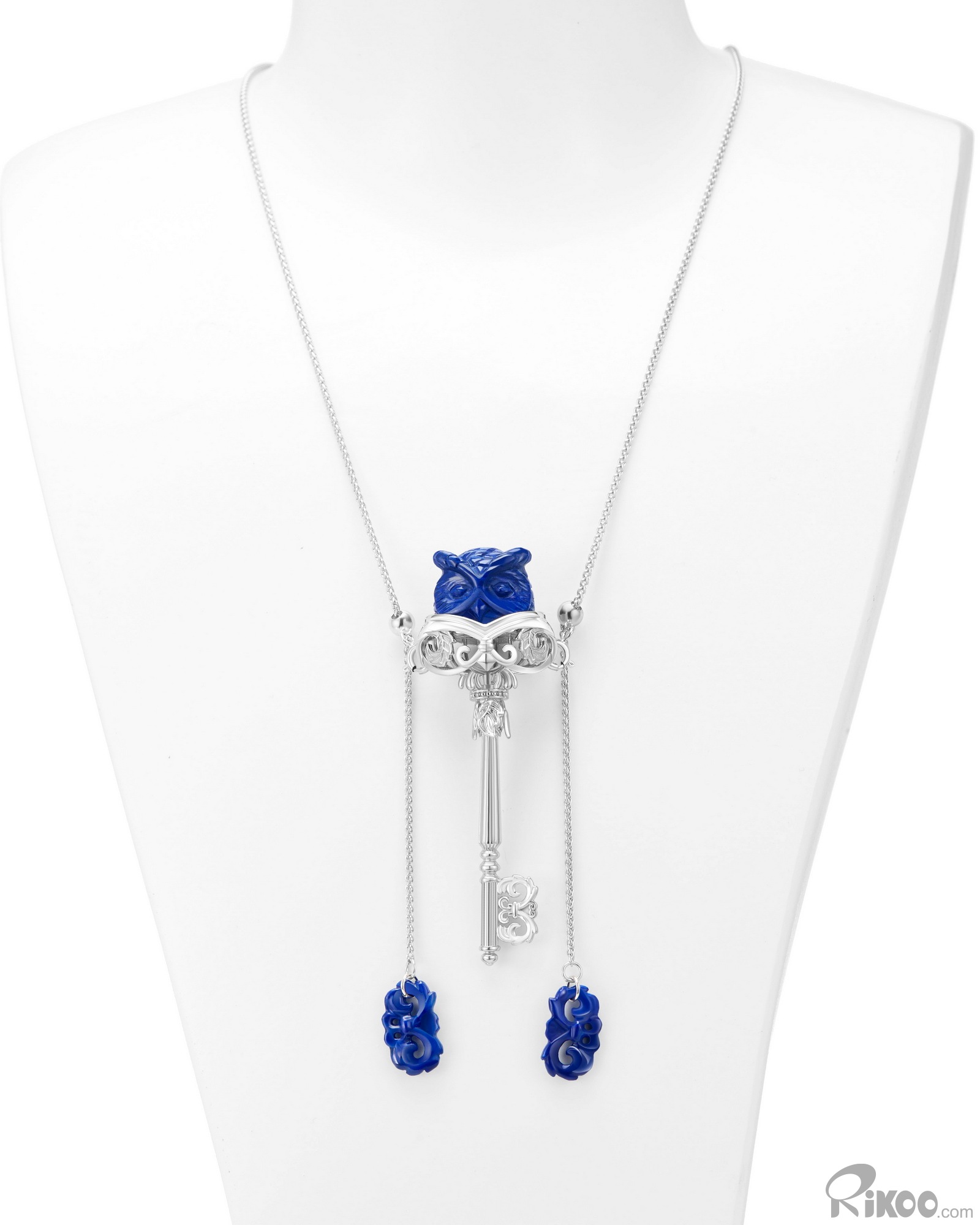 Gem Owl Pendant Necklace of Lapis Lazuli Carved Owl in 925 Silver