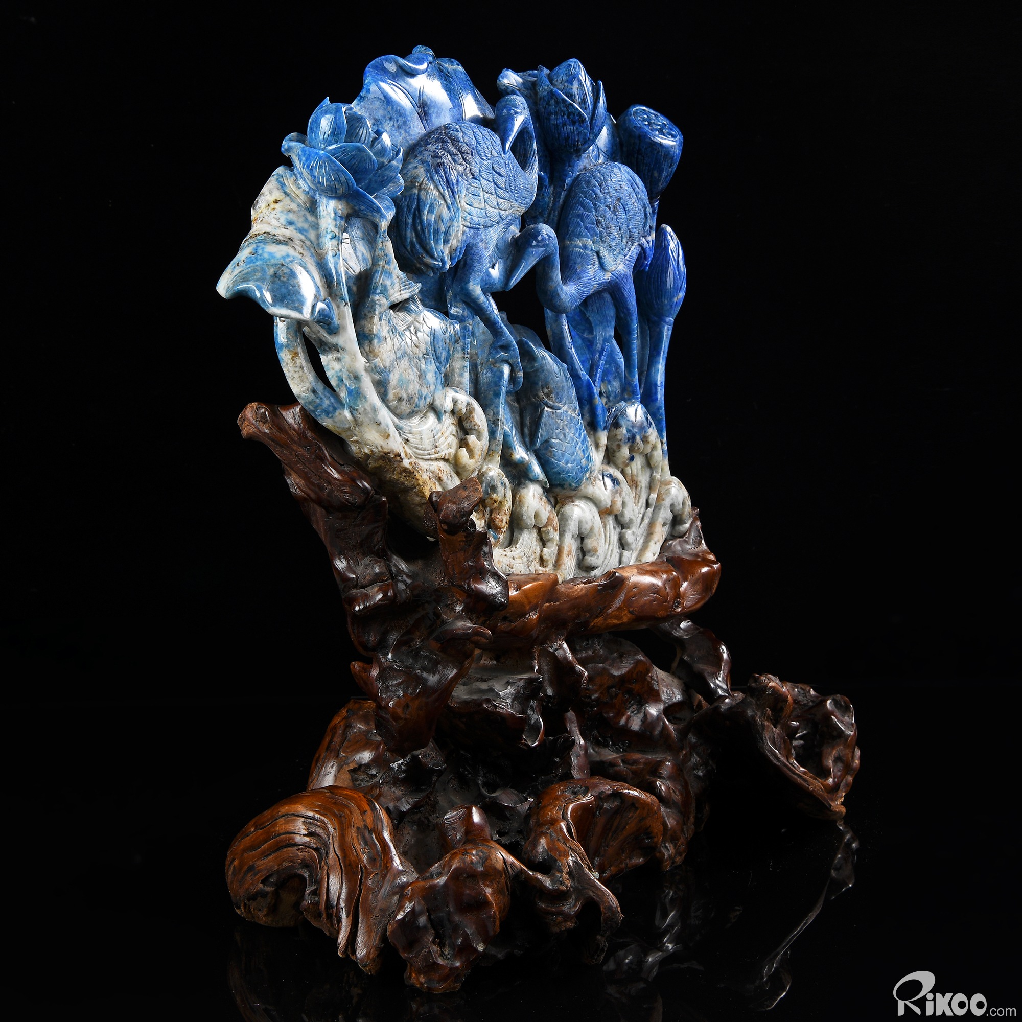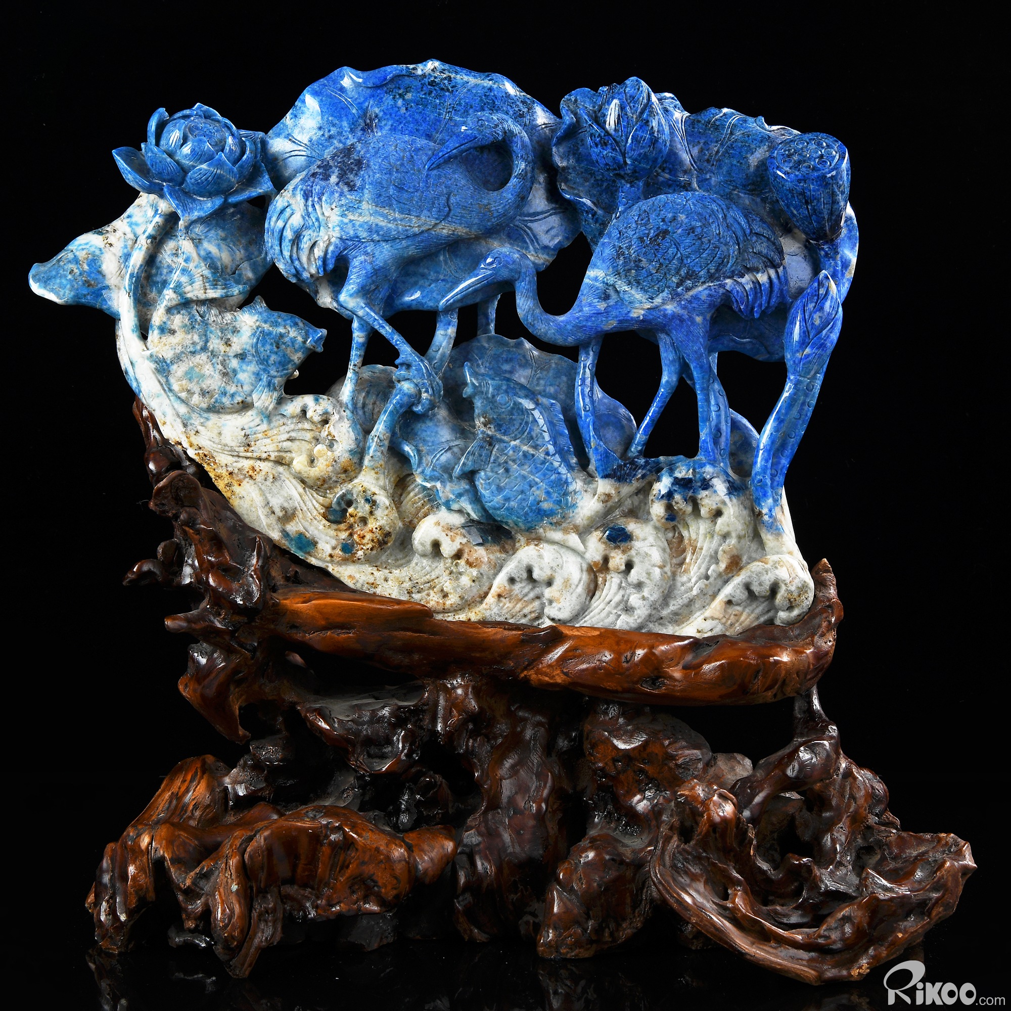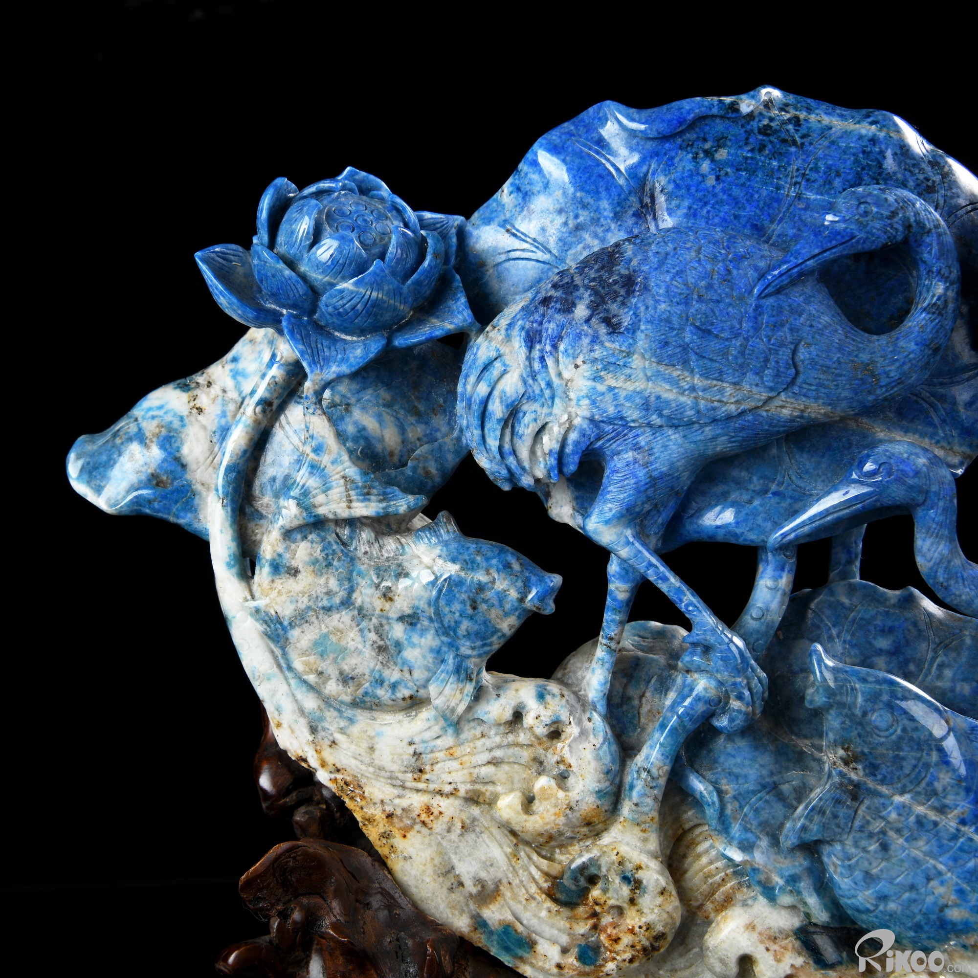 Gemstone 13.4" Lapis Lazuli Hand Carved Crystal Crane& Lotus& Fish Sculpture, Crystal Healing