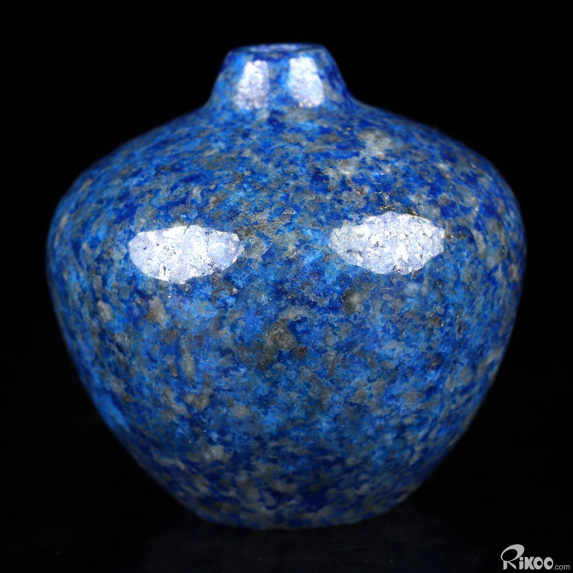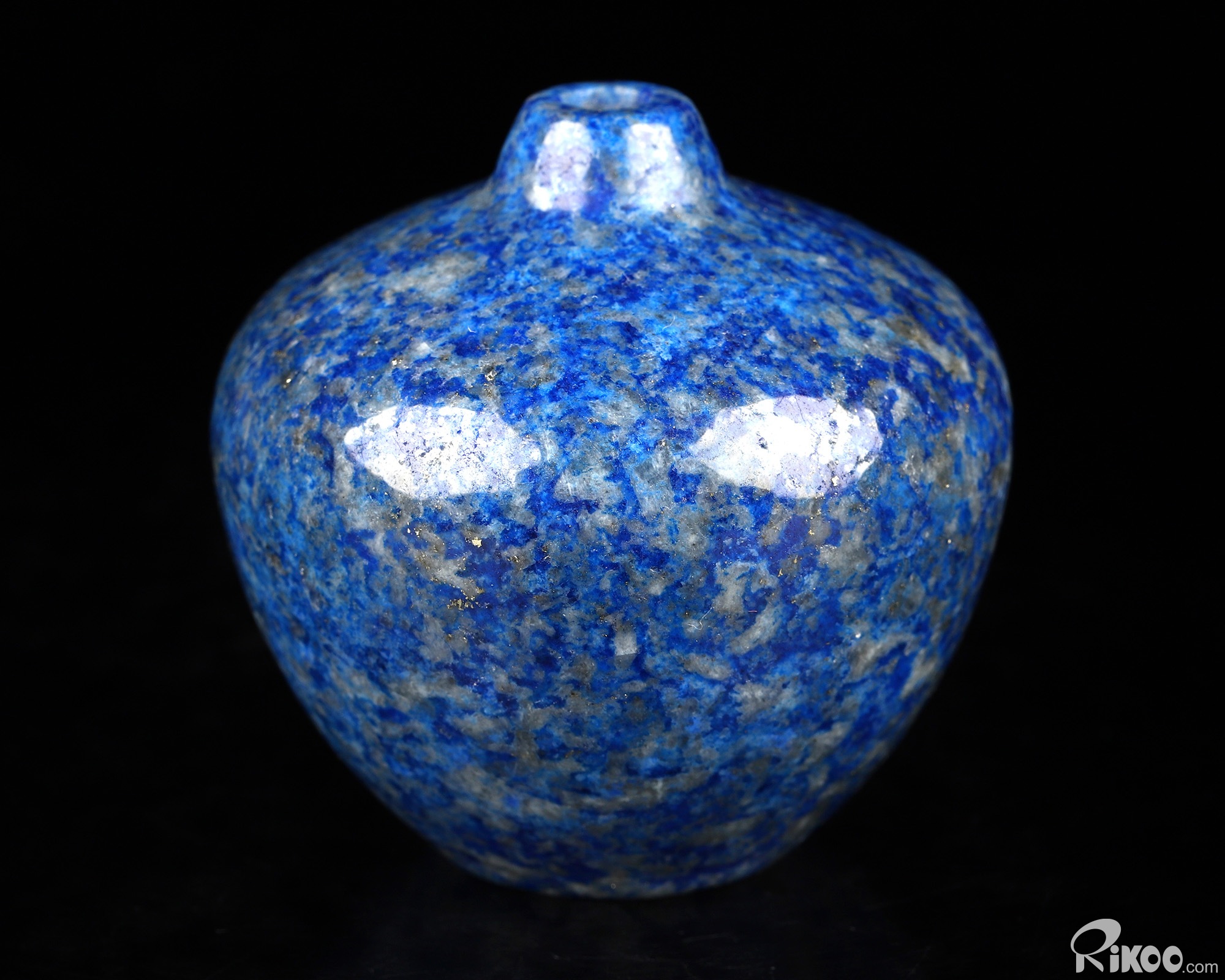This vase with limited functionality is mainly for display.Solid, med. to dk. blue. In meditation, opens Brow Chakra: higher guidance, intuition, connection to higher self, overview, decisions for good of all. Organizes, quiets mind. Opens Throat/Thyroid Chakra: Self-expression, writing, creativity, dream insight, allows total awareness...Anxiety, restlessness, insomnia, autism, shyness, nervous system, depression, serenity, self-acceptance; MS, speech, hearing, pituitary, DNA, lymph, inflammation, pain (especially head), protection stone. Shelters the wearer like a shield. . Extraordinarily deep blue stone often flecked with Pyrite. Can also be mottled with white Calcite. Most is currently mined in the USSR and Afghanistan. Beneficial to the respiratory system, especially the throat and lungs, the cleansing organs, and the nervous system. A good stone for blood purification and for boosting the immune system. A powerful thought-amplifier and is helpful in aligning all the elements of the body and mind. Can increase psychic abilities and will open the third eye. Can guide you in teh direction of mental and spiritual purity. It should be worn as close to the throat as possible or at least above the diaphragm so that the energy of the wearer is drawn upward.