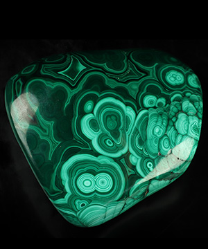 Steady pulsing electromagnetic energy. (High copper content) Malachite and azurite are the same chemical, practically, Copper Carbonate. The only difference is the ordering of the elements in the molecule. On brow: Stimulates physical and psychic vision, concentration. For heart and solar plexus centers: Stomach, liver, kidney stones, lungs, immune system, radiation, MS, circulation. Powerful healer with azurite or chrysocolla for healing: Releases and draws out pain, inflammation, depression, anger; heals blocks. Protects well by powerfully cleaning the auric field, rapidly absorbing undesirable energies, including: computer, TV, and other radiation, etc. Place in the 4 corners of a room to cleanse carpet toxins/gases. Clean very frequently -- daily if possible! . Often variegated and is one of the basic ores of Copper. Should be used with extreme care because it can amplify negative qualities. Caution must always be used when wearing it as jewelry. However, Malachite also magnifies the positive, and so it is useful if your mood is definitely on the upswing. It should not be used in healing without careful consideration of who is doing the healing. It is useful for relaxation and neurological disorders as well as tissue regeneration. It is said to awaken healing qualities and useful in fighting mental illnesses. Said to stimulate the optic nerve, help the pancreas, spleen, parathyroid, and help dyslexia. People living near nuclear power plants should keep pieces of Malachite in their homes, since Malachite may expel plutonium. A warning: Malachite in raw form has dust particles that are highly toxic and their ingestion should be avoided.