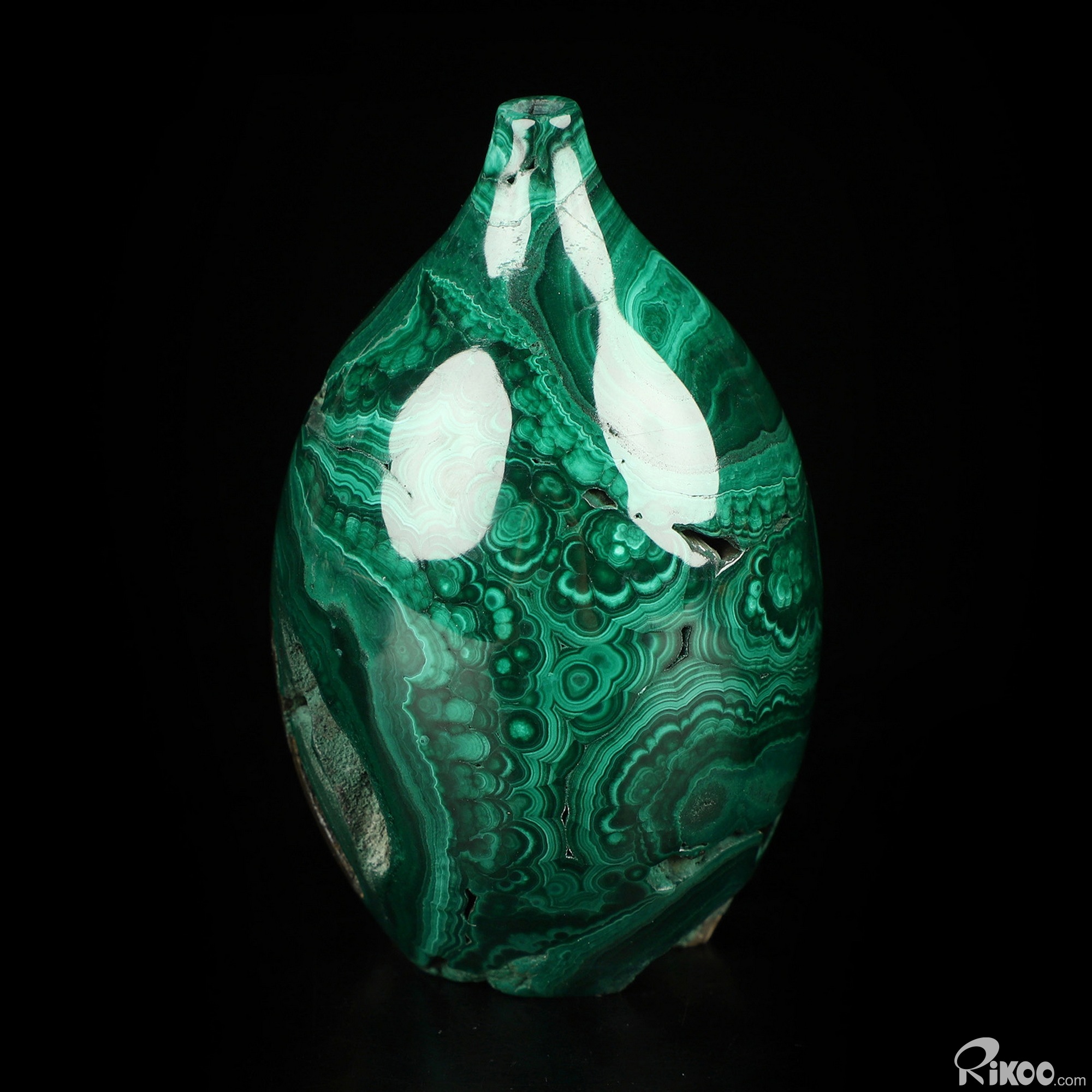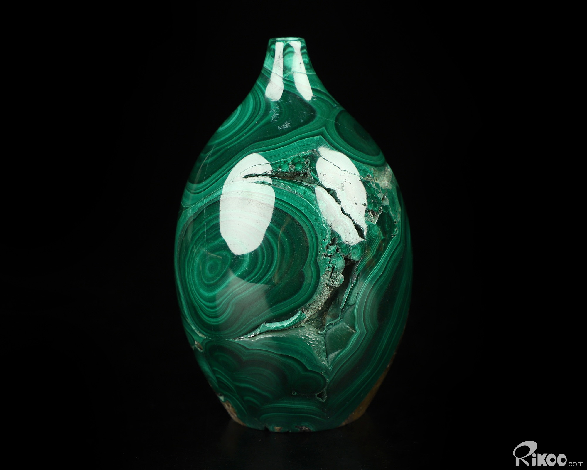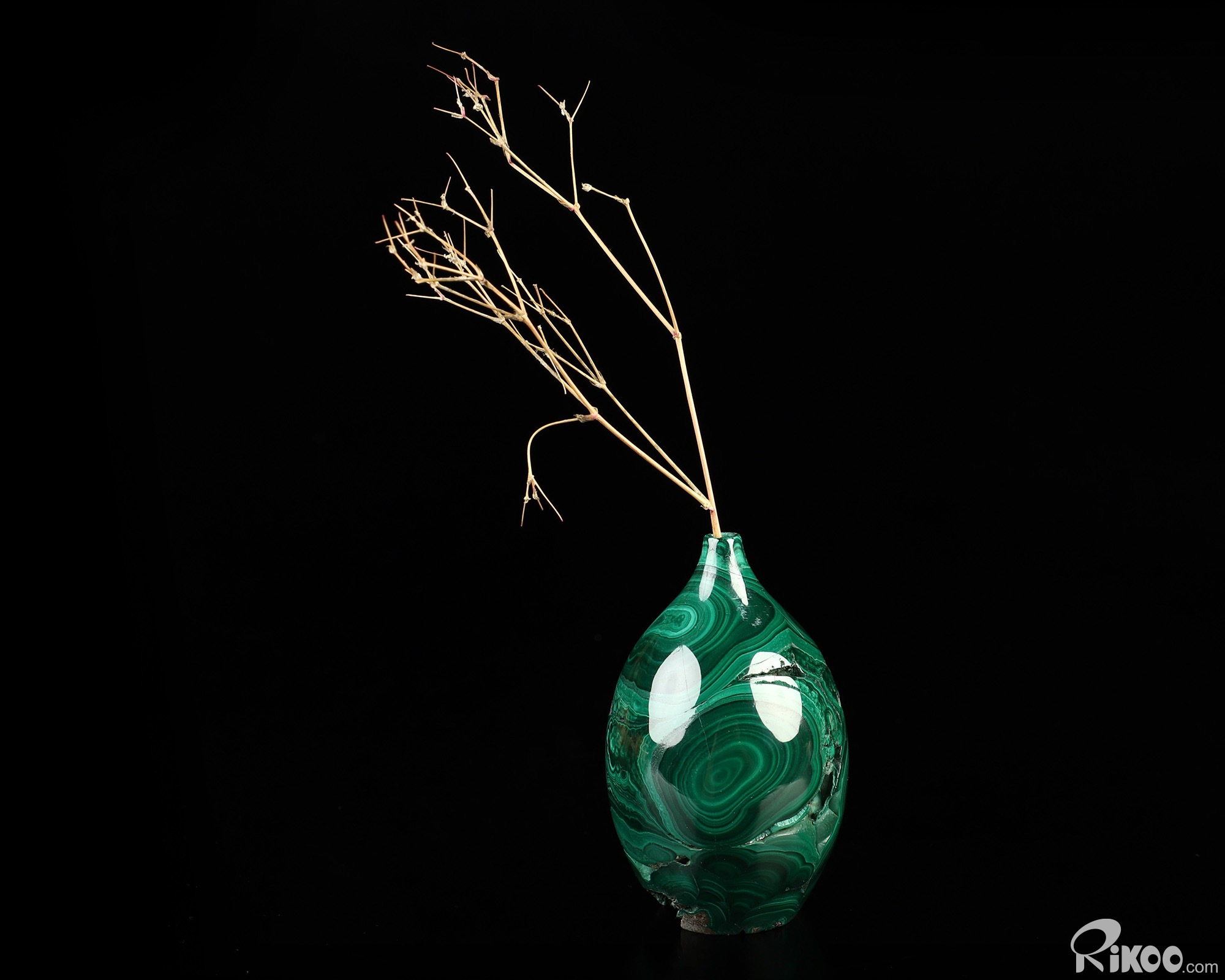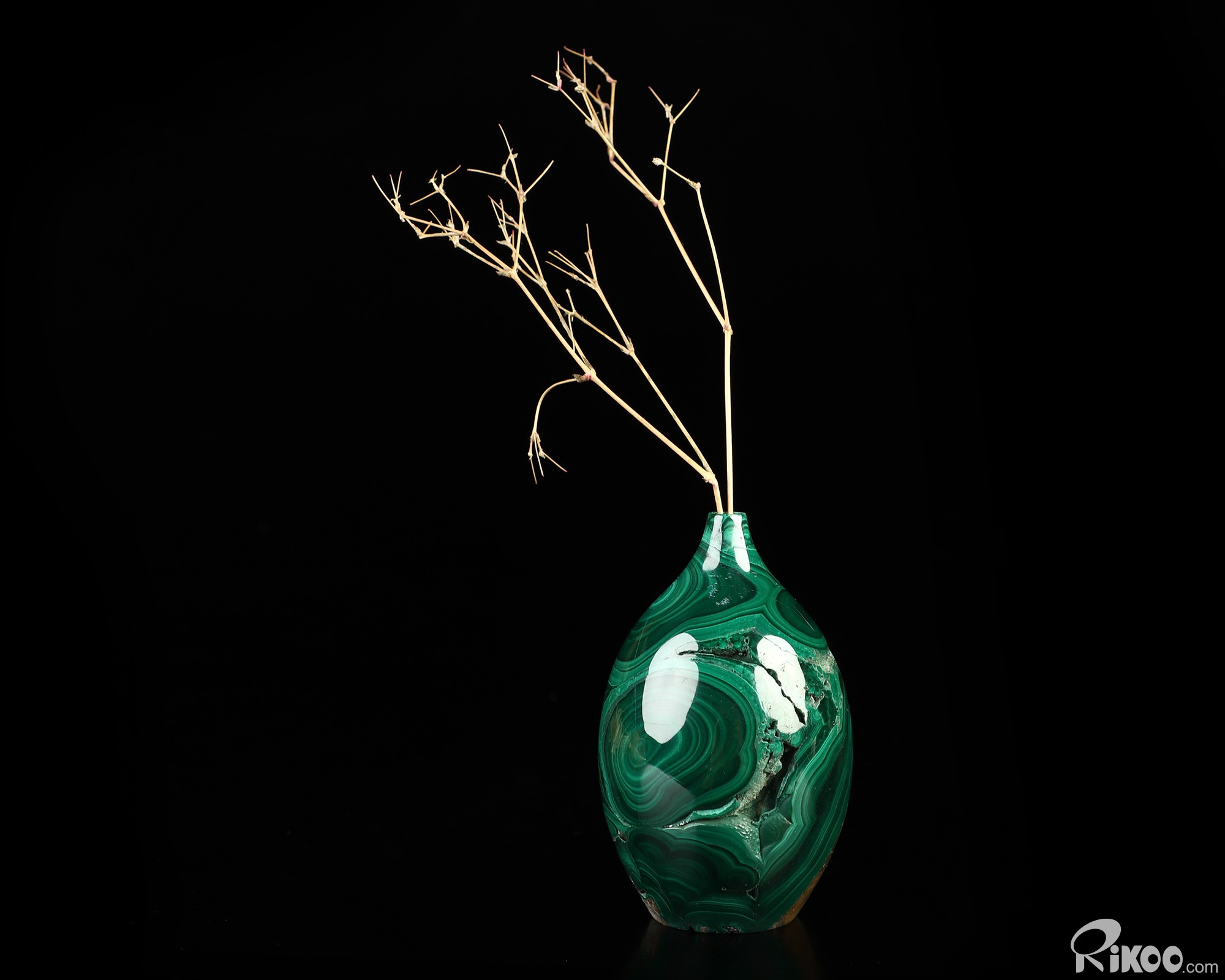 This vase with limited functionality is mainly for display.Steady pulsing electromagnetic energy. (High copper content) Malachite and azurite are the same chemical, practically, Copper Carbonate. The only difference is the ordering of the elements in the molecule. On brow: Stimulates physical and psychic vision, concentration. For heart and solar plexus centers: Stomach, liver, kidney stones, lungs, immune system, radiation, MS, circulation. Powerful healer with azurite or chrysocolla for healing: Releases and draws out pain, inflammation, depression, anger; heals blocks. Protects well by powerfully cleaning the auric field, rapidly absorbing undesirable energies, including: computer, TV, and other radiation, etc. Place in the 4 corners of a room to cleanse carpet toxins/gases. Clean very frequently -- daily if possible! . Often variegated and is one of the basic ores of Copper. Should be used with extreme care because it can amplify negative qualities. Caution must always be used when wearing it as jewelry. However, Malachite also magnifies the positive, and so it is useful if your mood is definitely on the upswing. It should not be used in healing without careful consideration of who is doing the healing. It is useful for relaxation and neurological disorders as well as tissue regeneration. It is said to awaken healing qualities and useful in fighting mental illnesses. Said to stimulate the optic nerve, help the pancreas, spleen, parathyroid, and help dyslexia. People living near nuclear power plants should keep pieces of Malachite in their homes, since Malachite may expel plutonium. A warning: Malachite in raw form has dust particles that are highly toxic and their ingestion should be avoided.