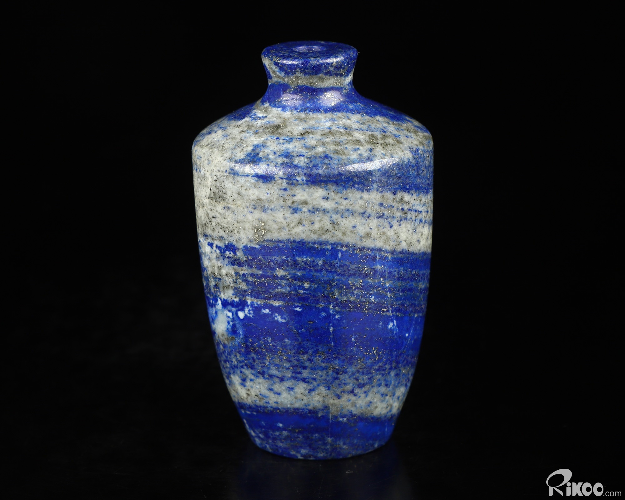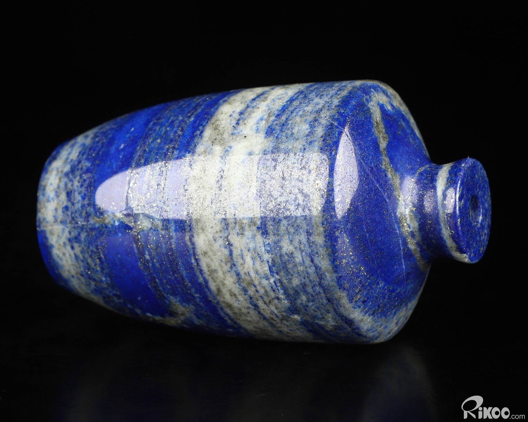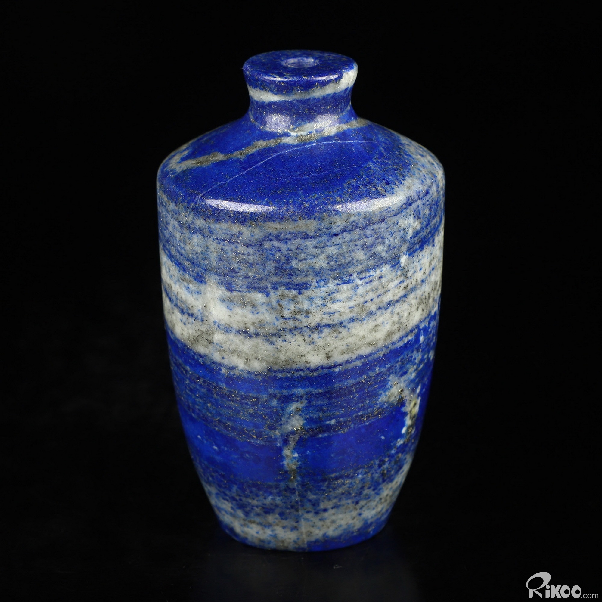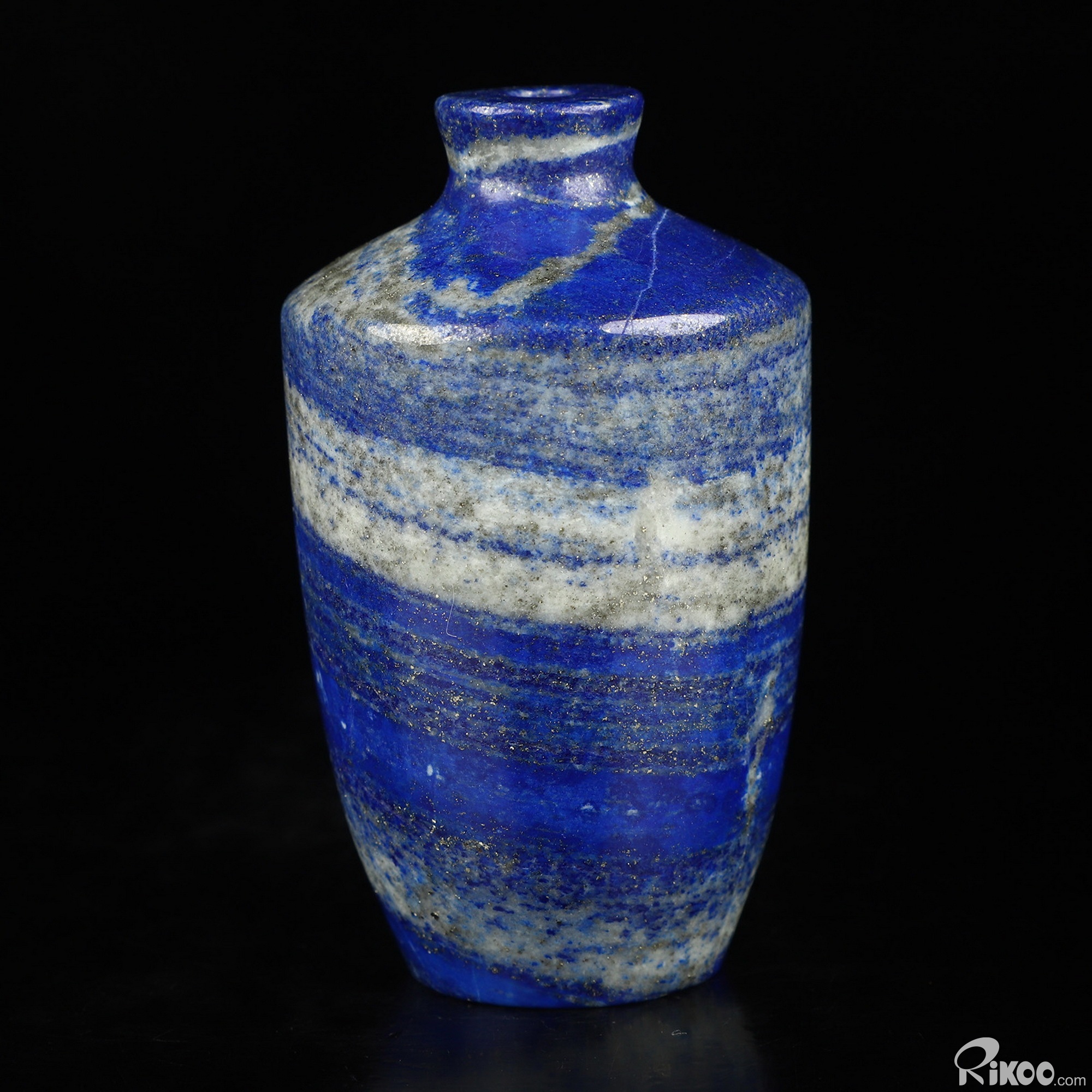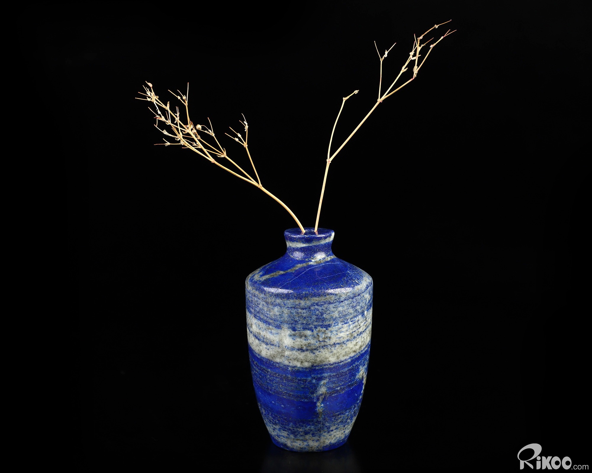 This vase with limited functionality is mainly for display.Solid, med. to dk. blue. In meditation, opens Brow Chakra: higher guidance, intuition, connection to higher self, overview, decisions for good of all. Organizes, quiets mind. Opens Throat/Thyroid Chakra: Self-expression, writing, creativity, dream insight, allows total awareness...Anxiety, restlessness, insomnia, autism, shyness, nervous system, depression, serenity, self-acceptance; MS, speech, hearing, pituitary, DNA, lymph, inflammation, pain (especially head), protection stone. Shelters the wearer like a shield. . Extraordinarily deep blue stone often flecked with Pyrite. Can also be mottled with white Calcite. Most is currently mined in the USSR and Afghanistan. Beneficial to the respiratory system, especially the throat and lungs, the cleansing organs, and the nervous system. A good stone for blood purification and for boosting the immune system. A powerful thought-amplifier and is helpful in aligning all the elements of the body and mind. Can increase psychic abilities and will open the third eye. Can guide you in teh direction of mental and spiritual purity. It should be worn as close to the throat as possible or at least above the diaphragm so that the energy of the wearer is drawn upward.
