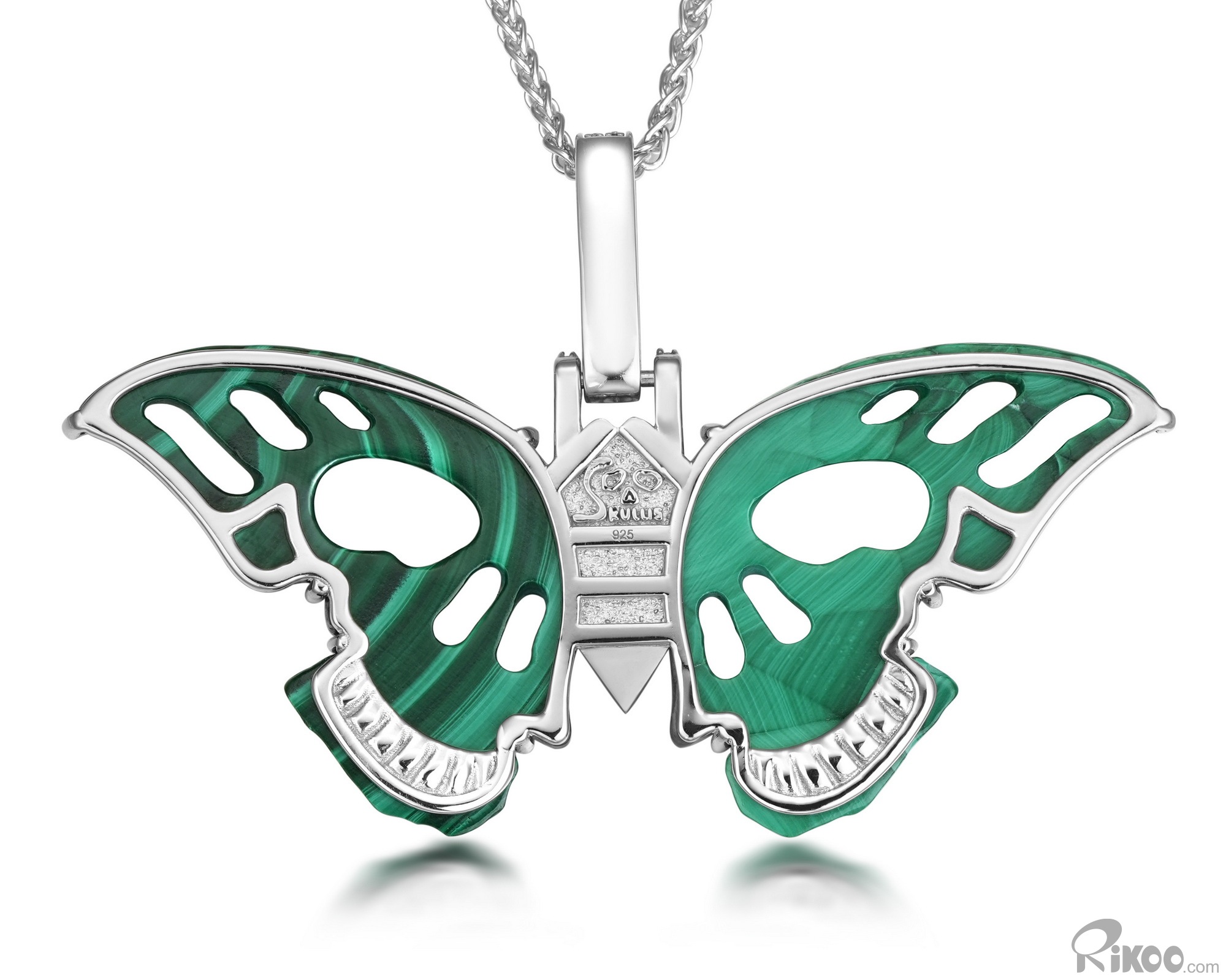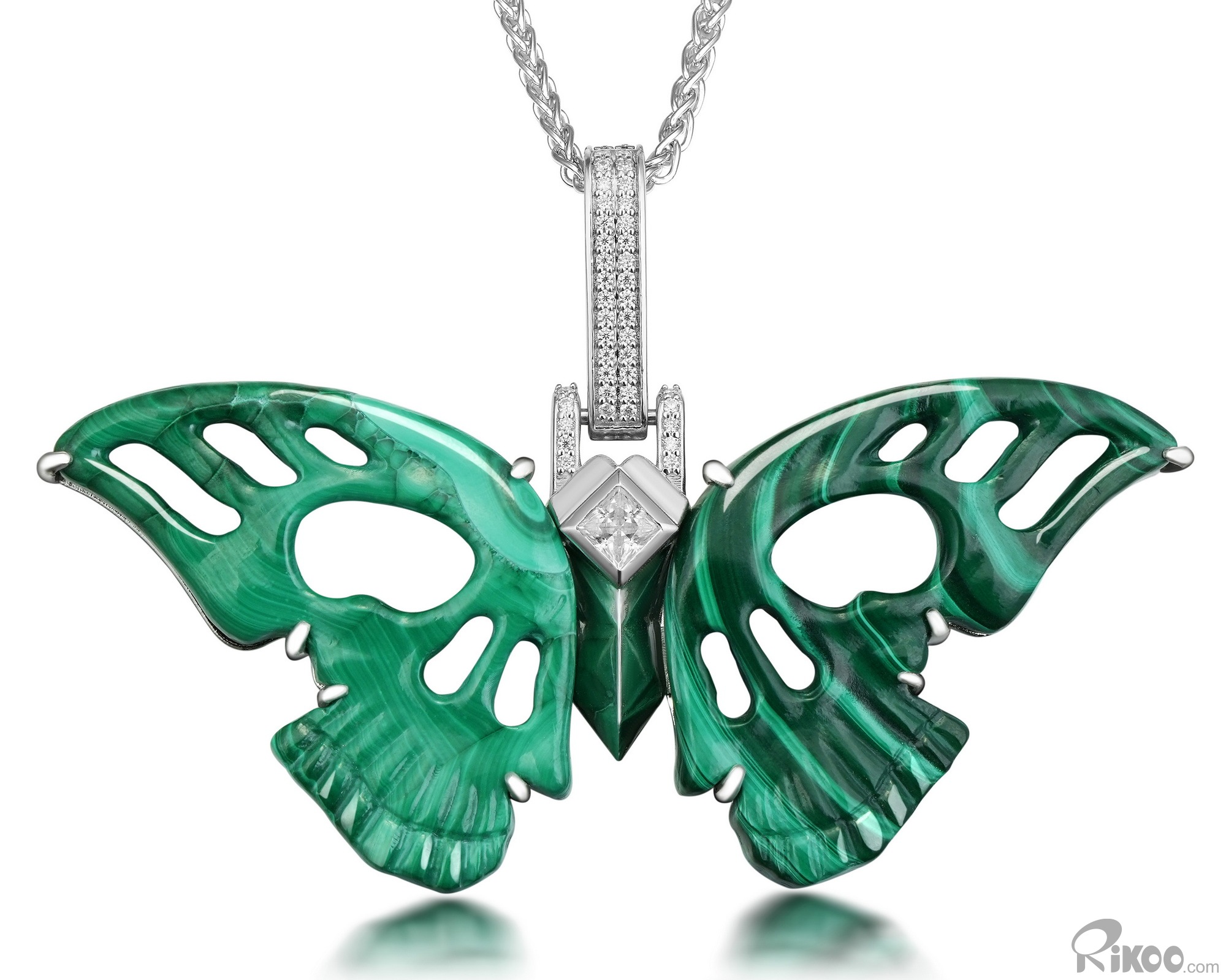 Gemstone 3.3" Malachite Hand Carved Crystal Skull Butterfly Necklace, Crystal Healing
