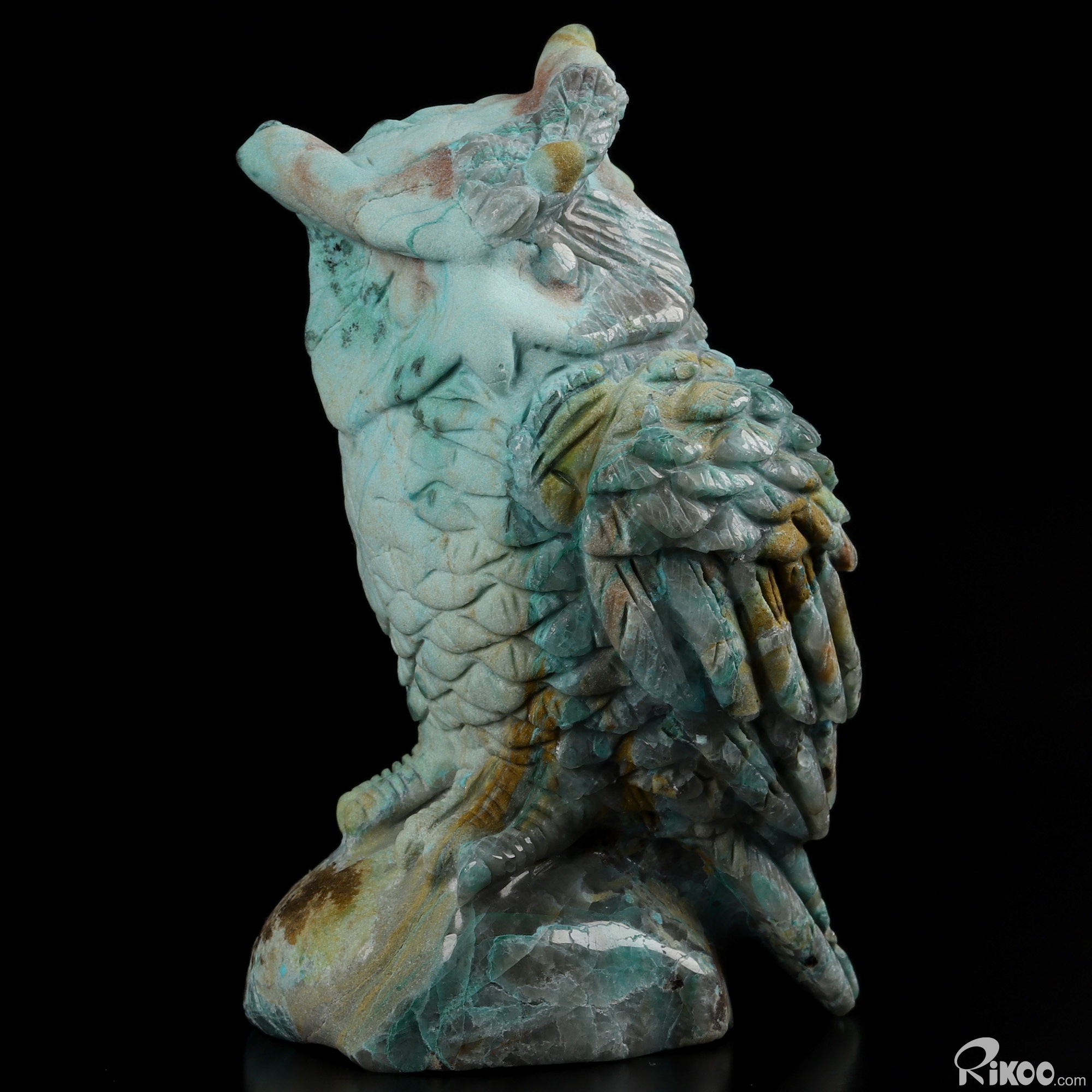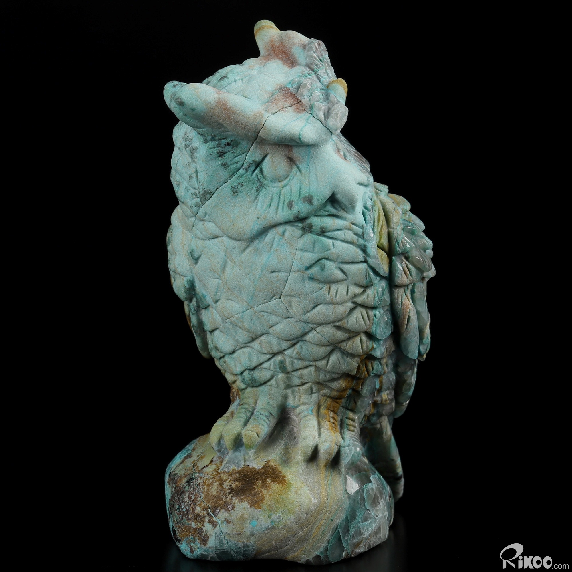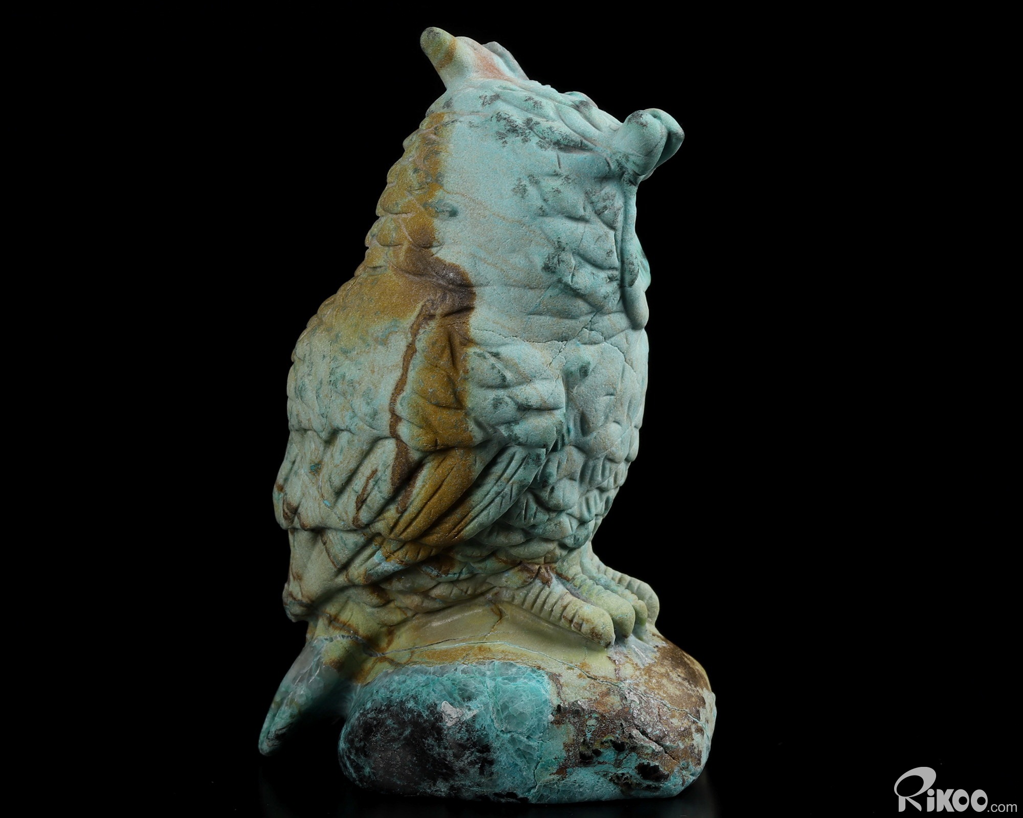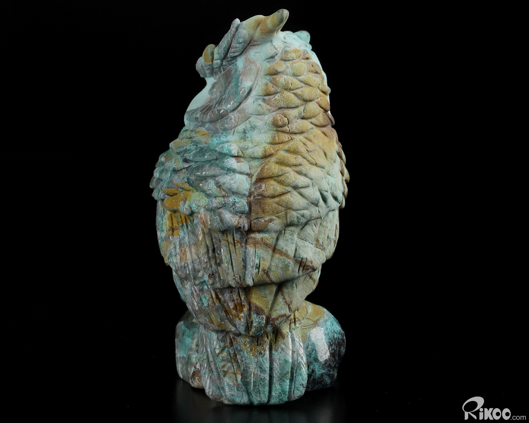 You are looking at a American Chrysocolla owl. The owl is 3.8 inches long from top to bottom.