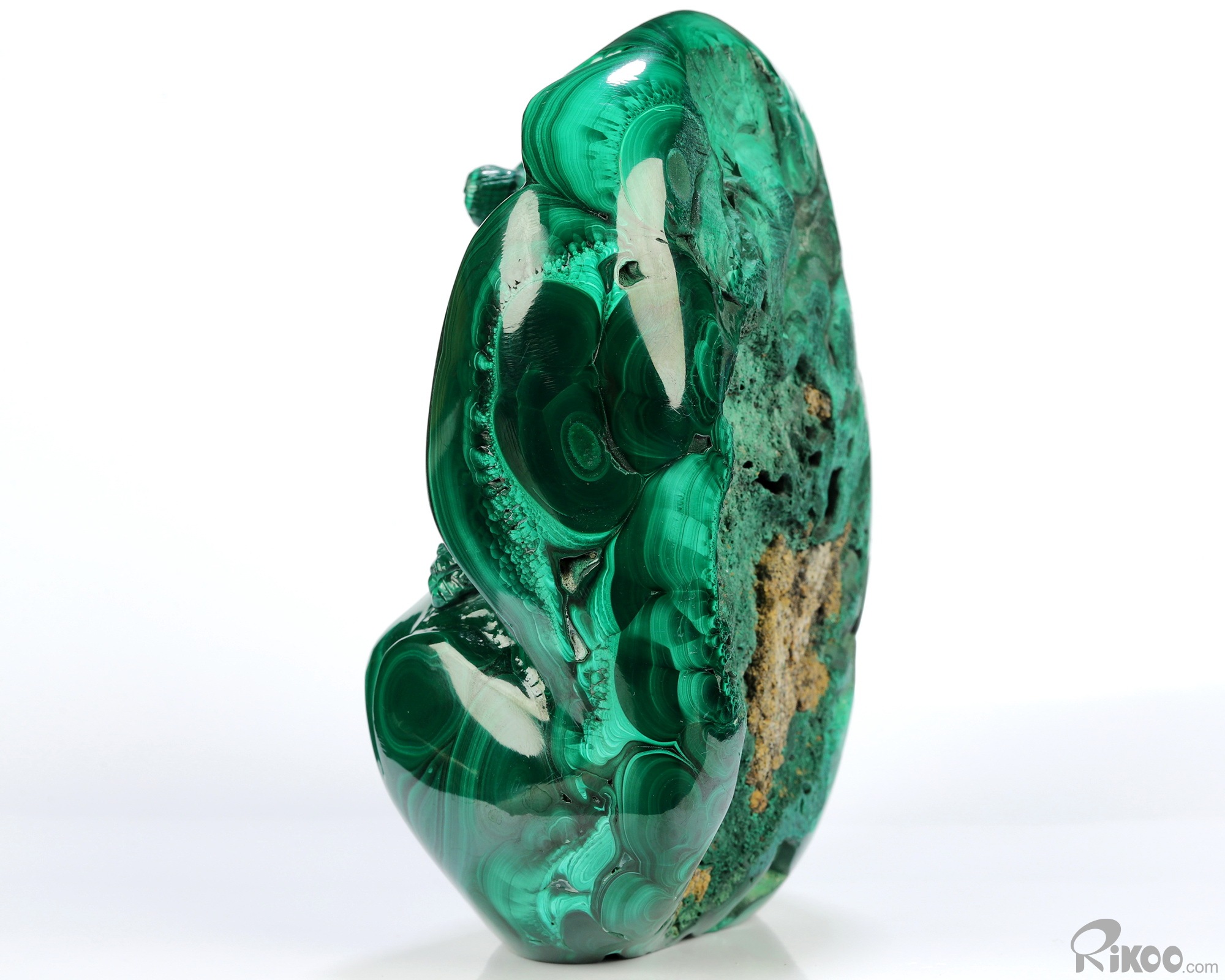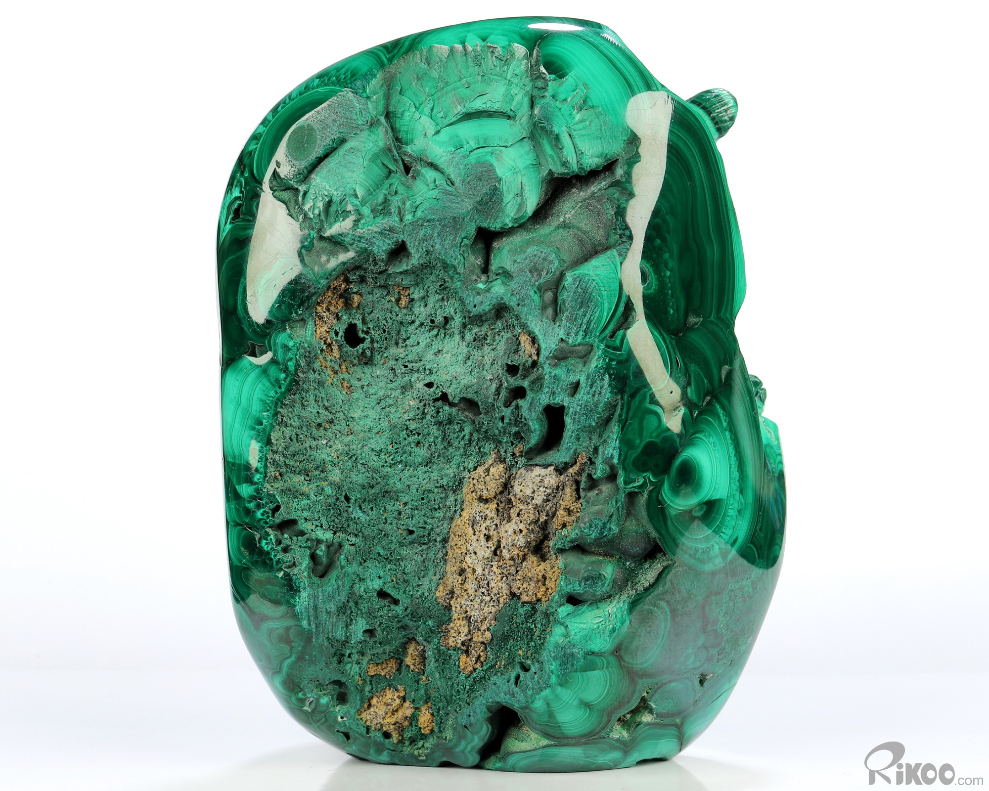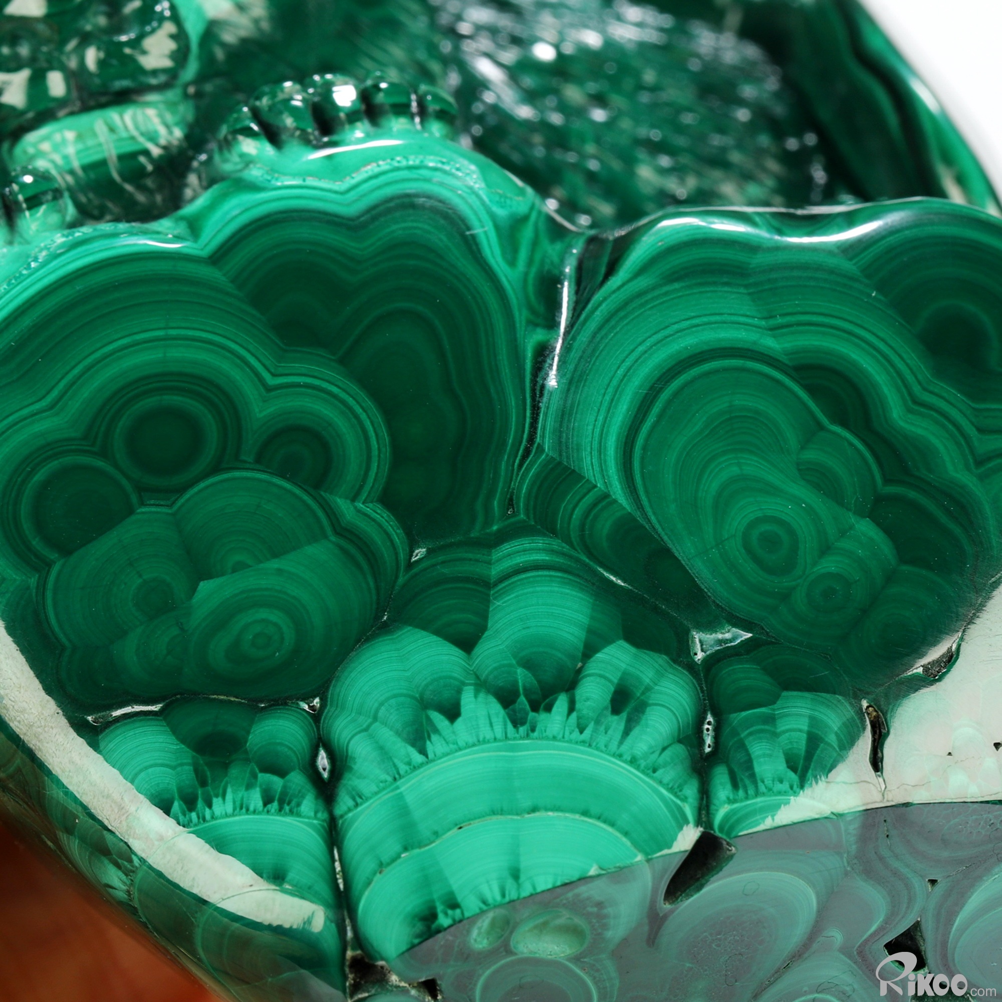 Steady pulsing electromagnetic energy. (High copper content) Malachite and azurite are the same chemical, practically, Copper Carbonate. The only difference is the ordering of the elements in the molecule. On brow: Stimulates physical and psychic vision, concentration. For heart and solar plexus centers: Stomach, liver, kidney stones, lungs, immune system, radiation, MS, circulation. Powerful healer with azurite or chrysocolla for healing: Releases and draws out pain, inflammation, depression, anger; heals blocks. Protects well by powerfully cleaning the auric field, rapidly absorbing undesirable energies, including: computer, TV, and other radiation, etc. Place in the 4 corners of a room to cleanse carpet toxins/gases. Clean very frequently -- daily if possible! . Often variegated and is one of the basic ores of Copper. Should be used with extreme care because it can amplify negative qualities. Caution must always be used when wearing it as jewelry. However, Malachite also magnifies the positive, and so it is useful if your mood is definitely on the upswing. It should not be used in healing without careful consideration of who is doing the healing. It is useful for relaxation and neurological disorders as well as tissue regeneration. It is said to awaken healing qualities and useful in fighting mental illnesses. Said to stimulate the optic nerve, help the pancreas, spleen, parathyroid, and help dyslexia. People living near nuclear power plants should keep pieces of Malachite in their homes, since Malachite may expel plutonium. A warning: Malachite in raw form has dust particles that are highly toxic and their ingestion should be avoided.