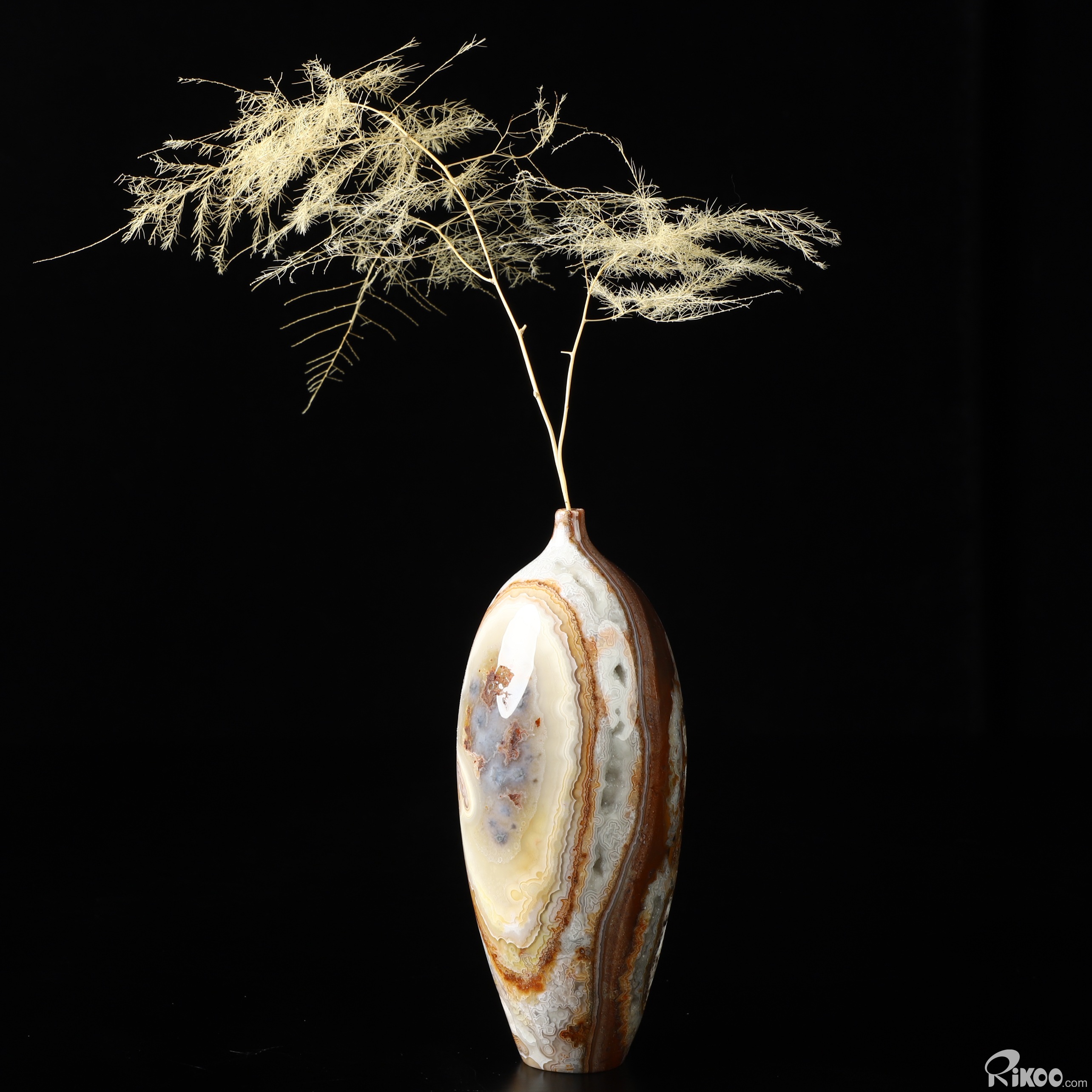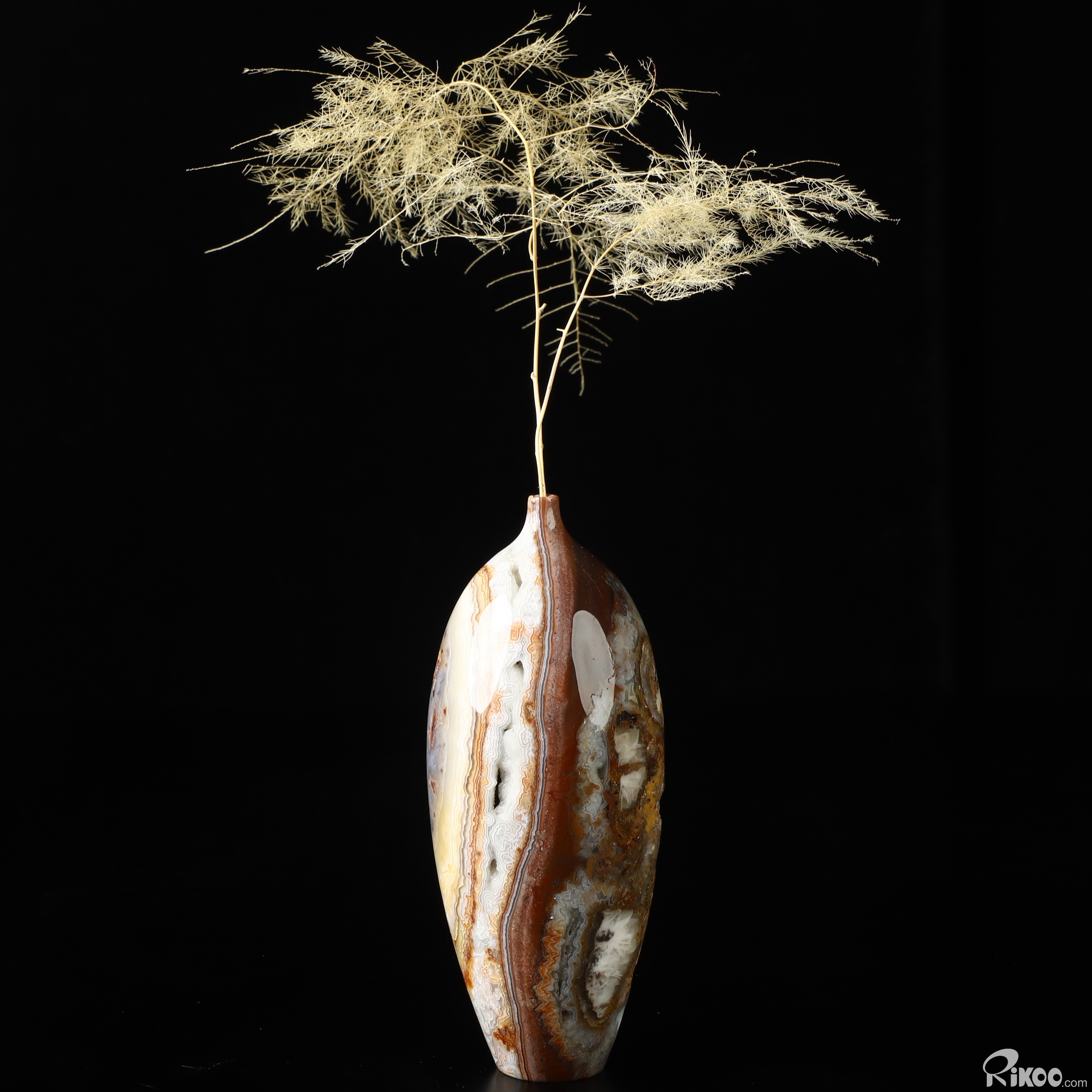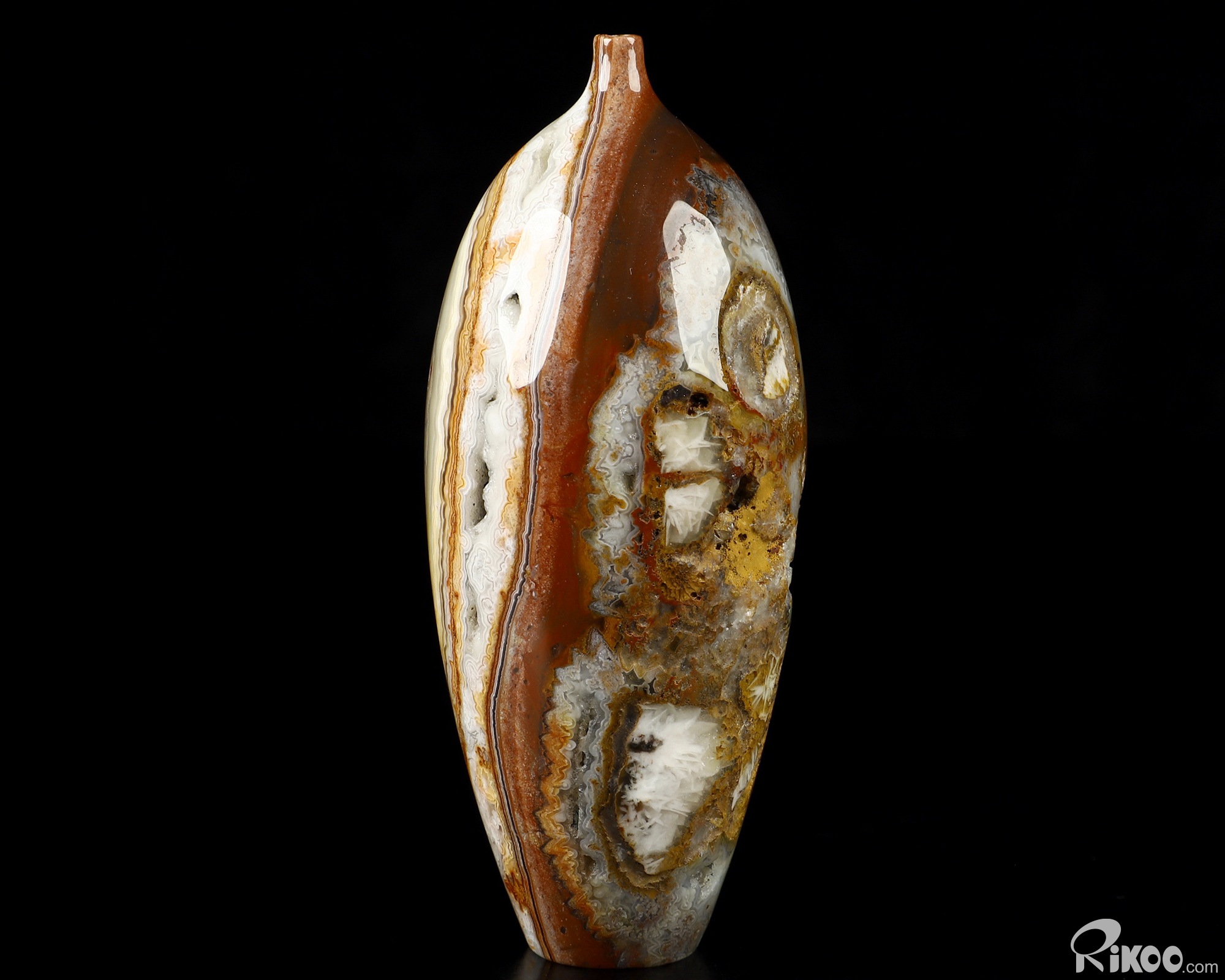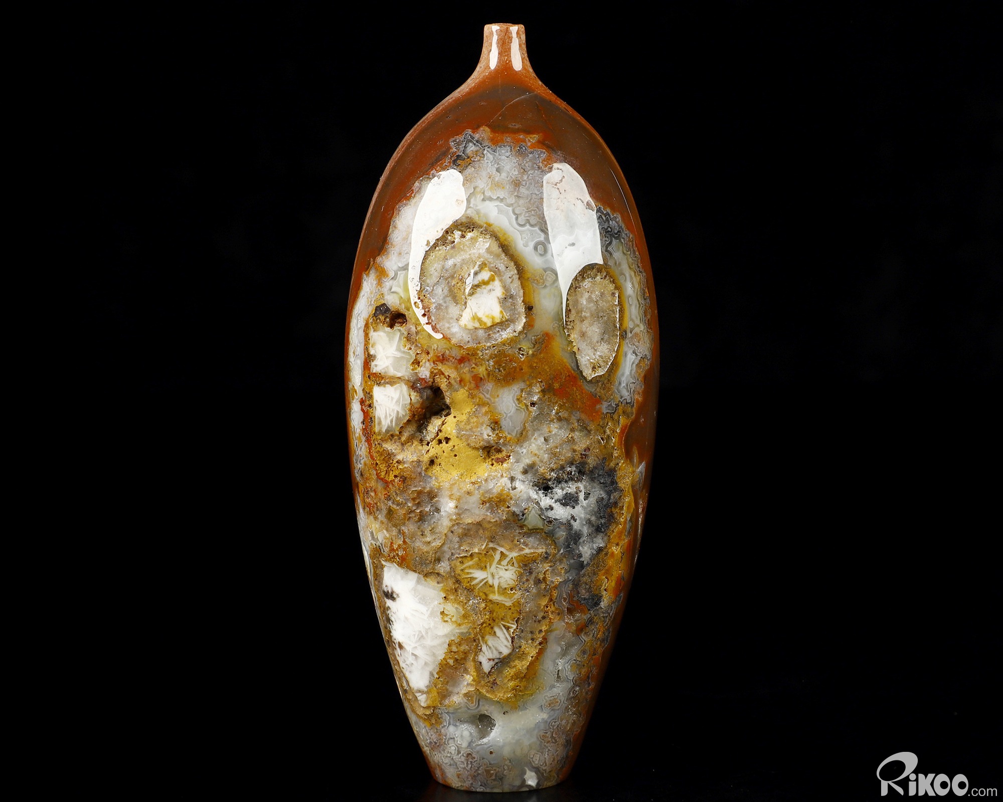 This vase with limited functionality is mainly for display.Crazy Lace Agate can be used to help one to reach extremely high physical levels. It helps to balance physical energies. It can bring humor and laughter to one's life, and helps to see life clearly.