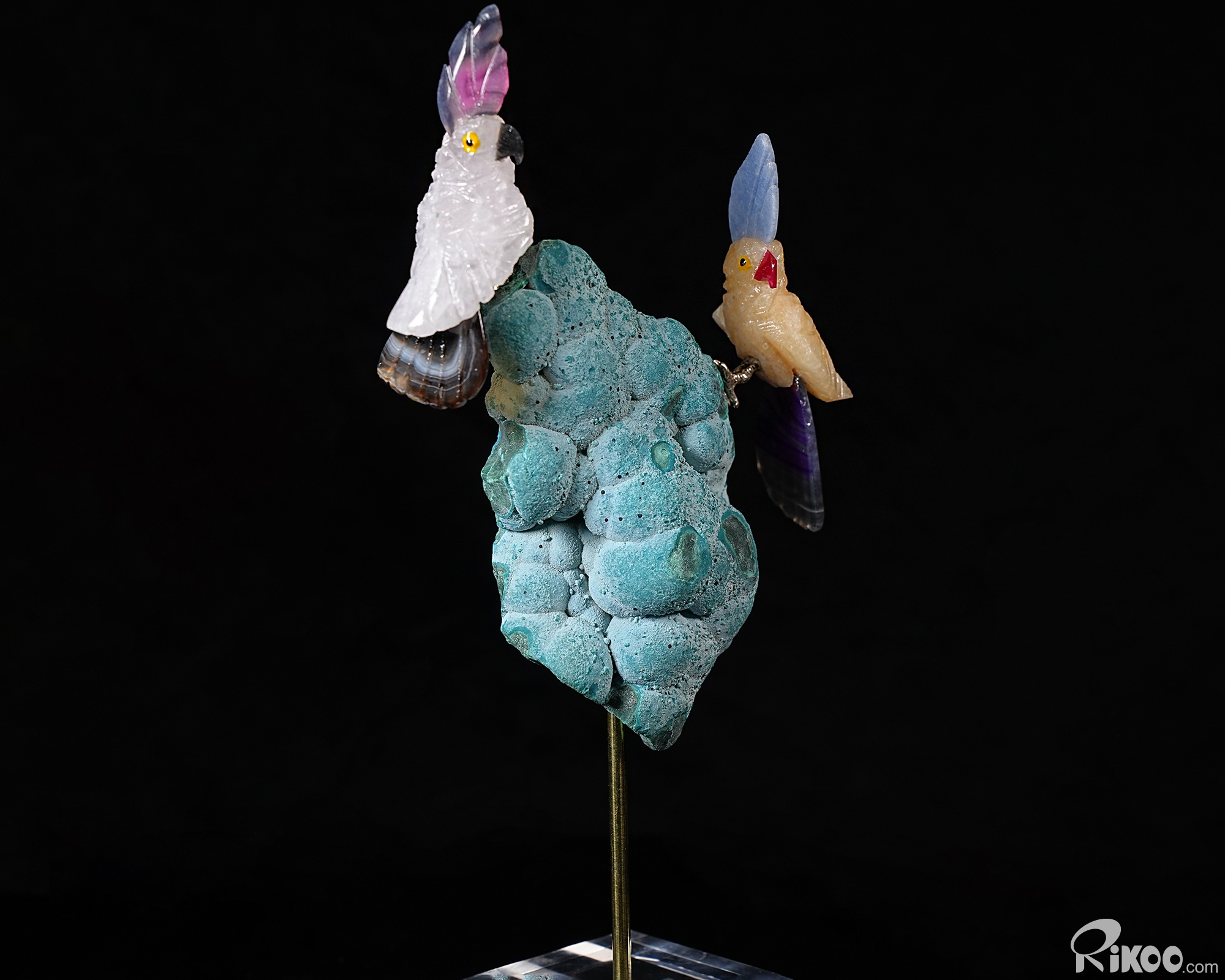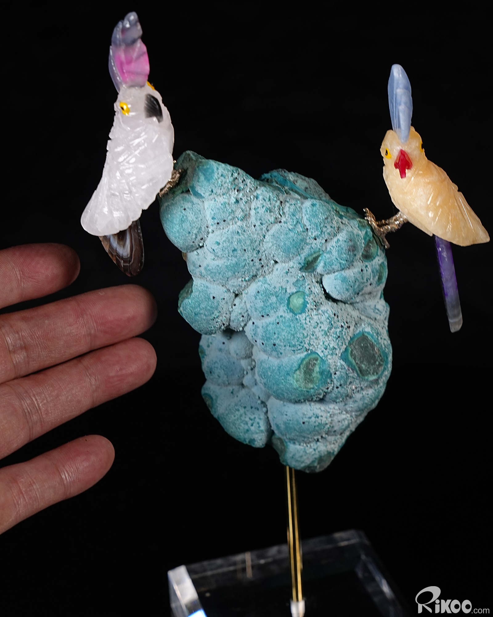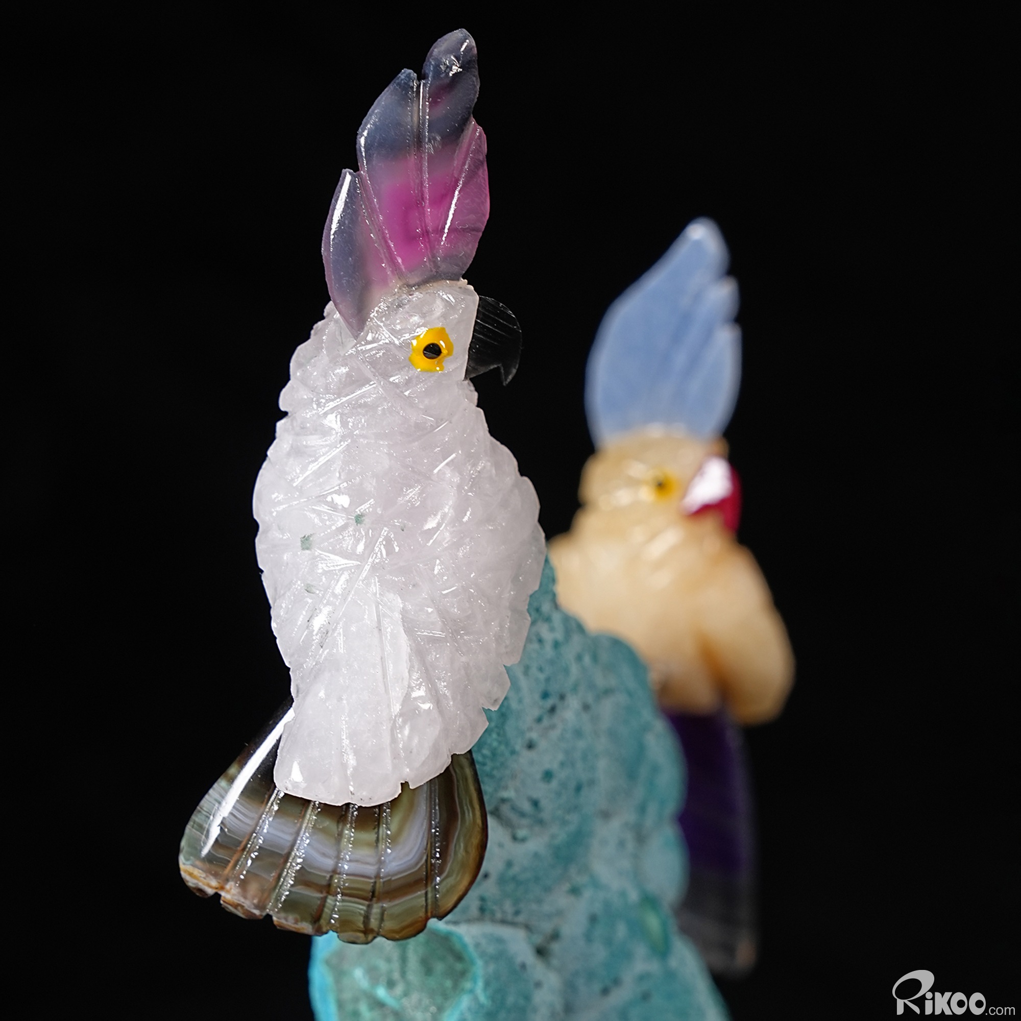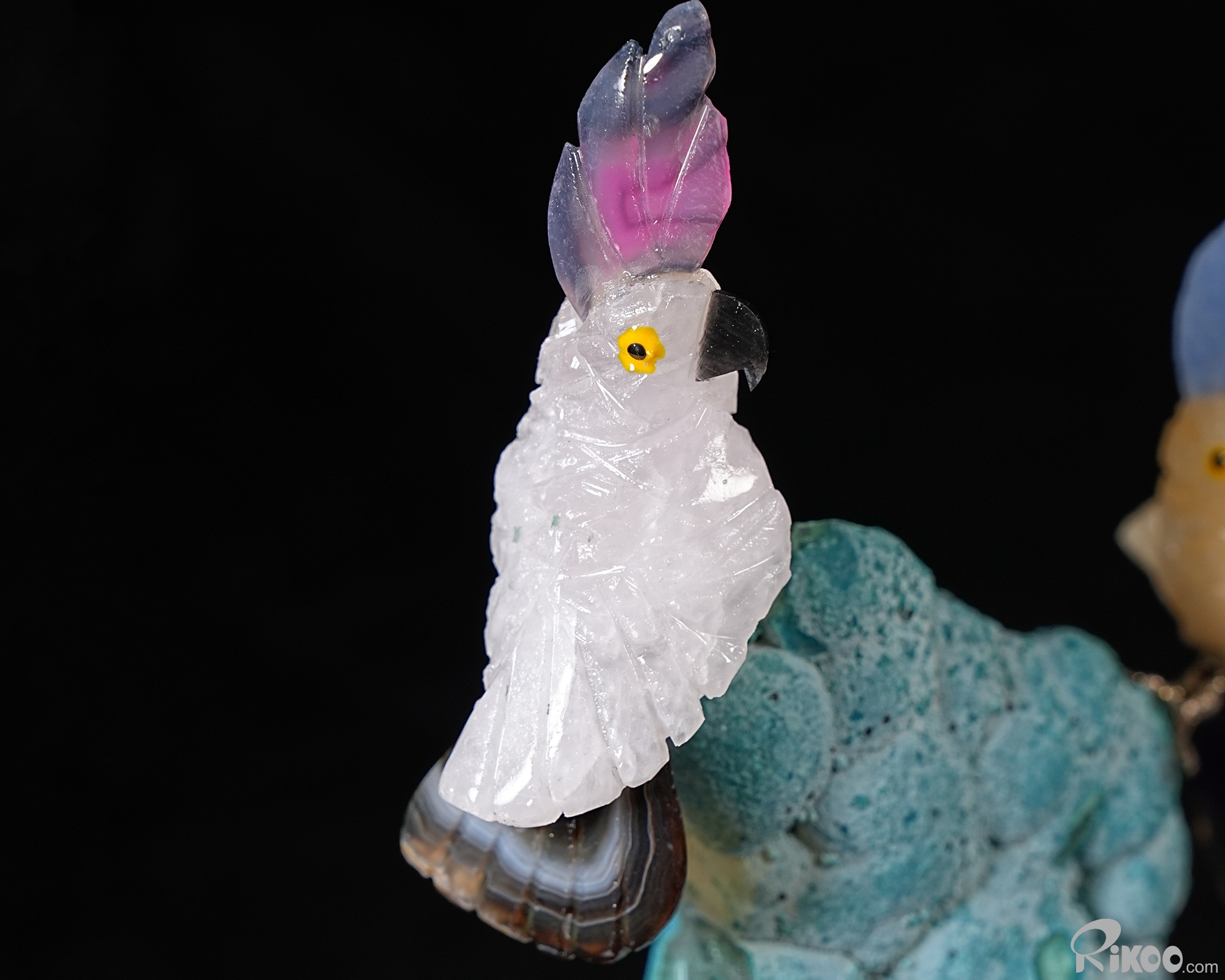 Gemstone 6.3" Fluorite Hand Carved Crystal Parrot Sculpture with Malachite Stand, Crystal Healing