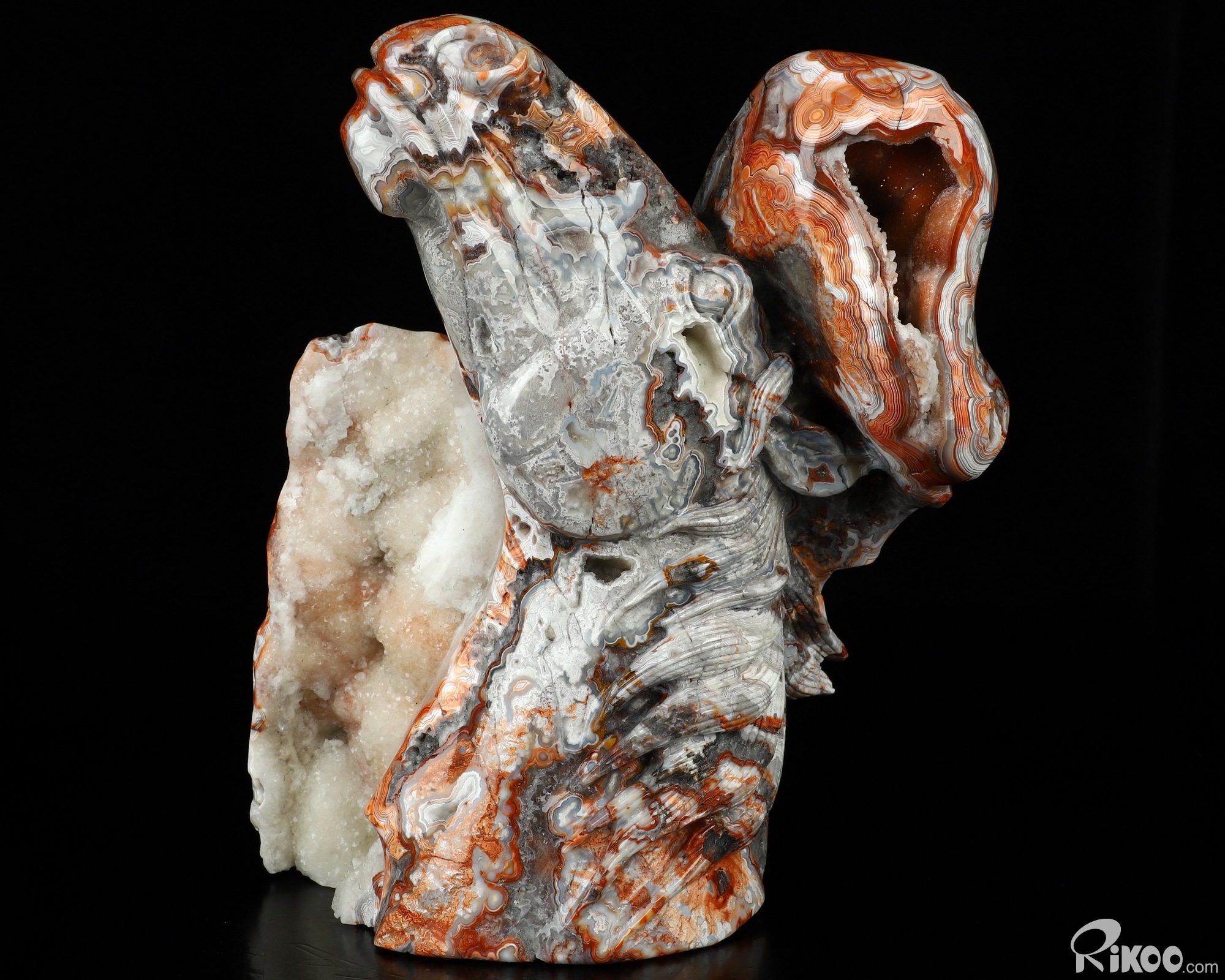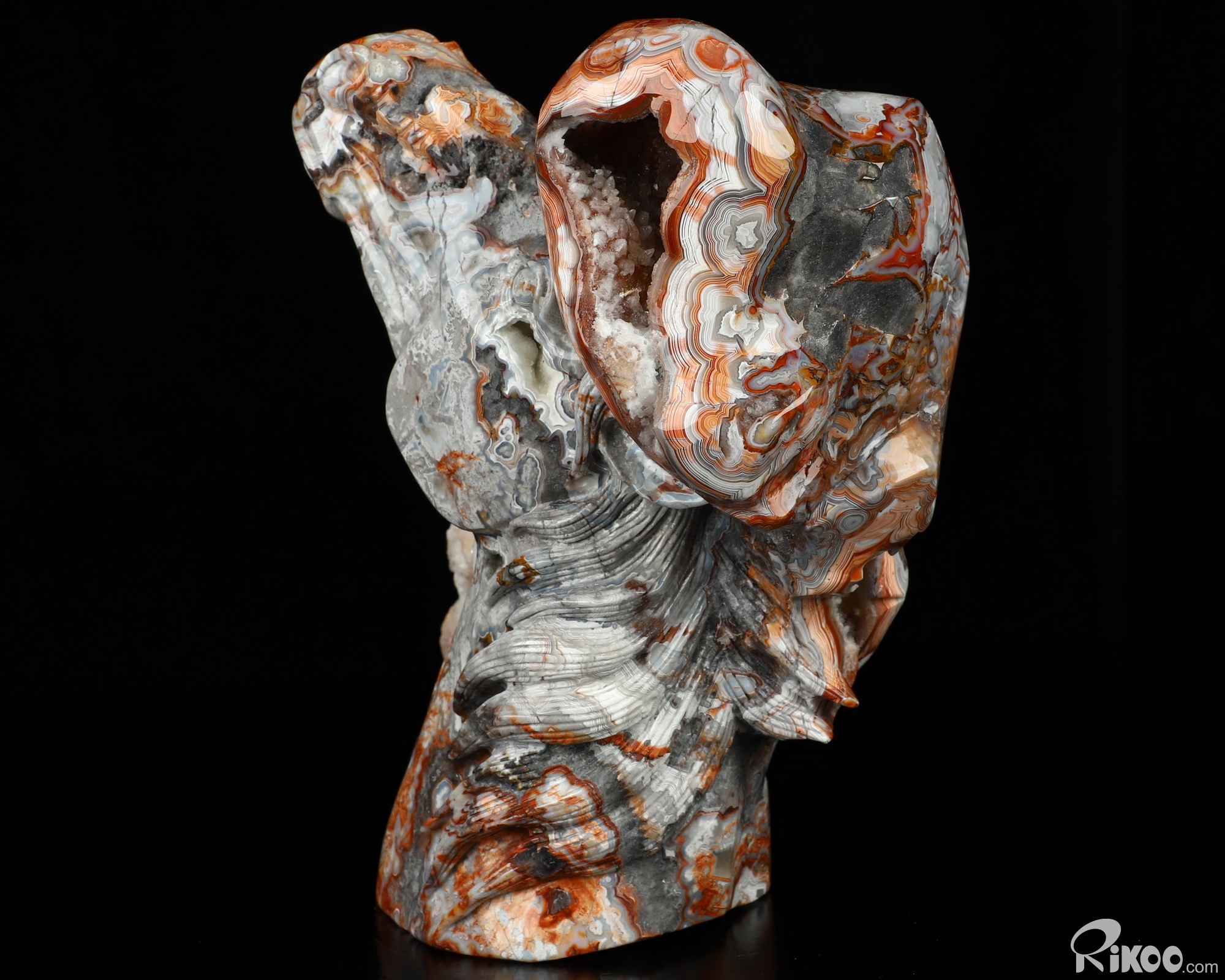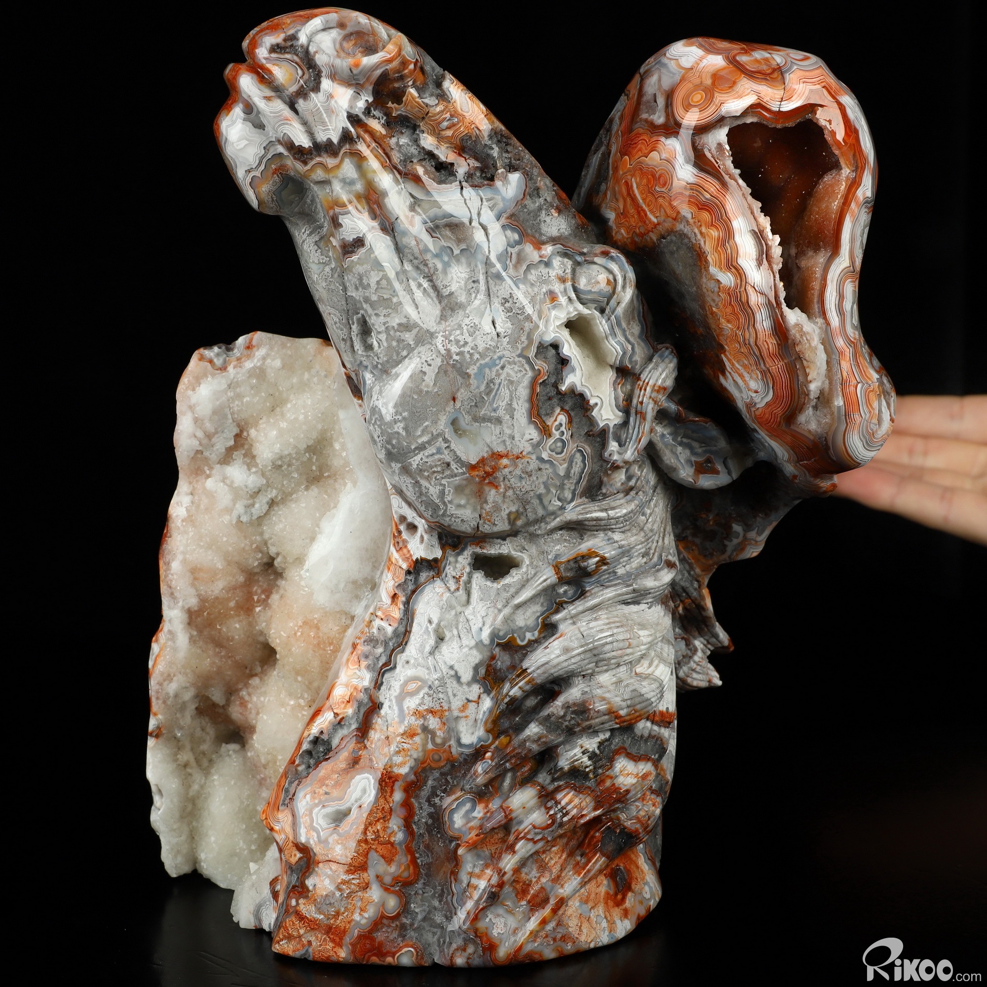 You are looking at a Red Crazy Lace Agate sculpture. The sculpture is 7.6 inches long.