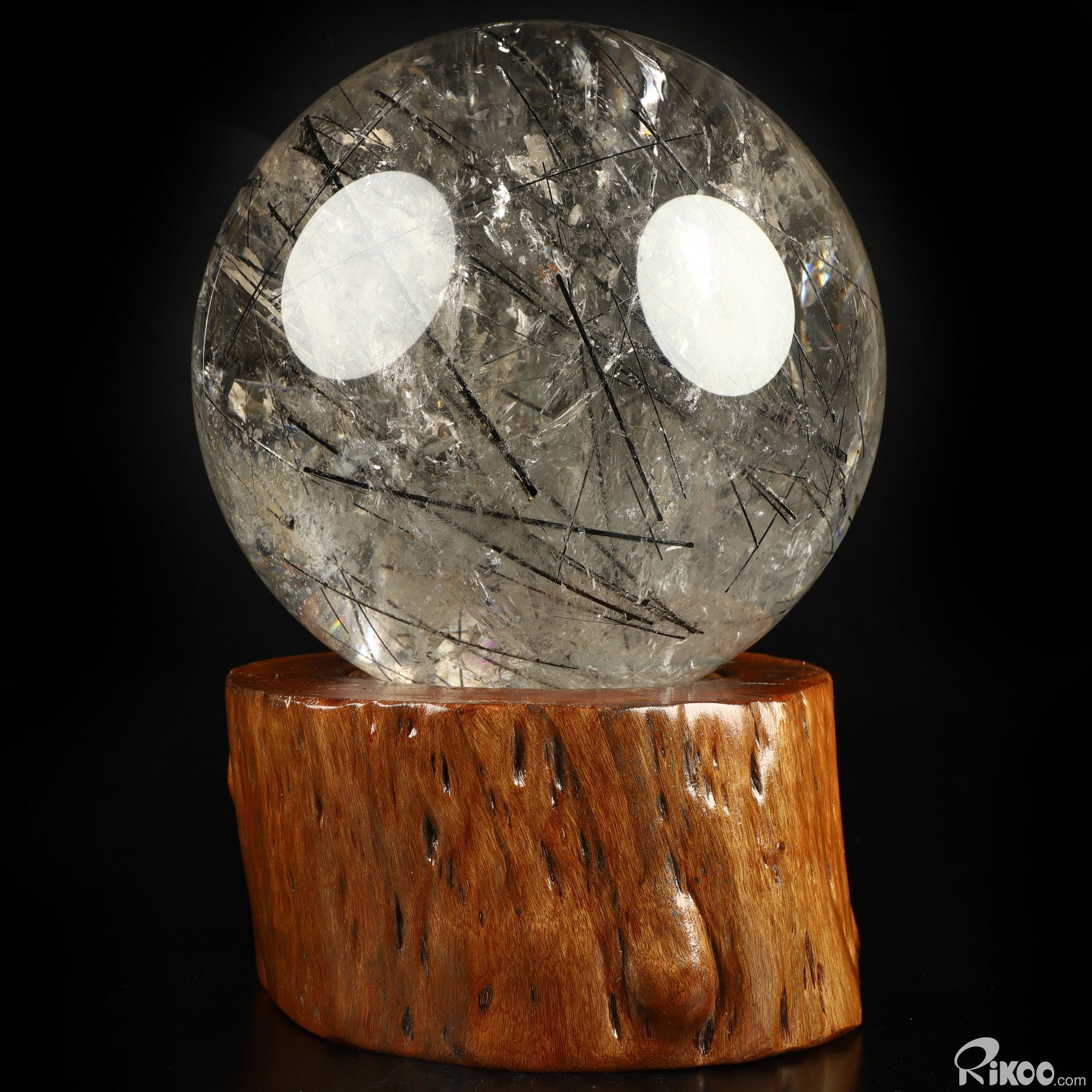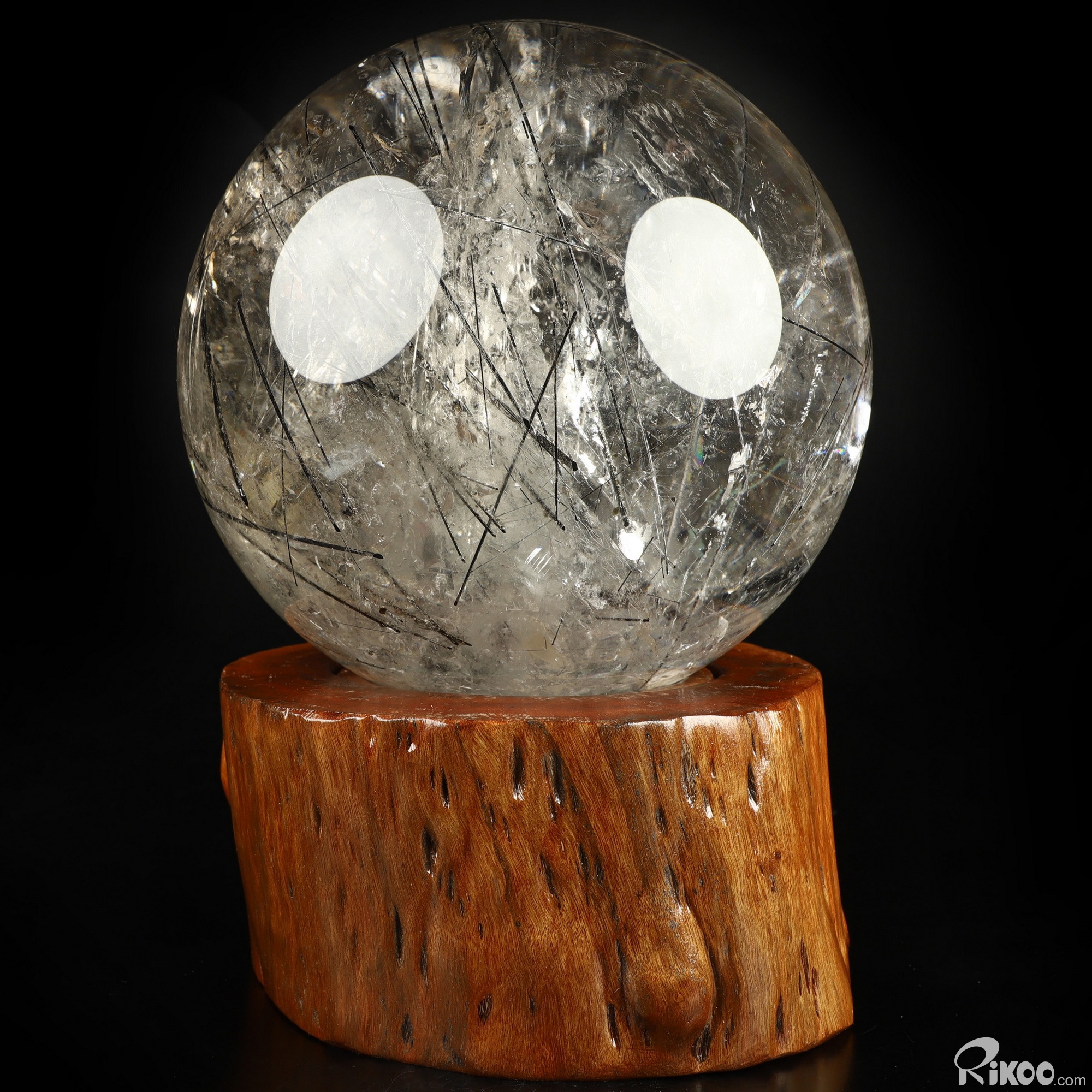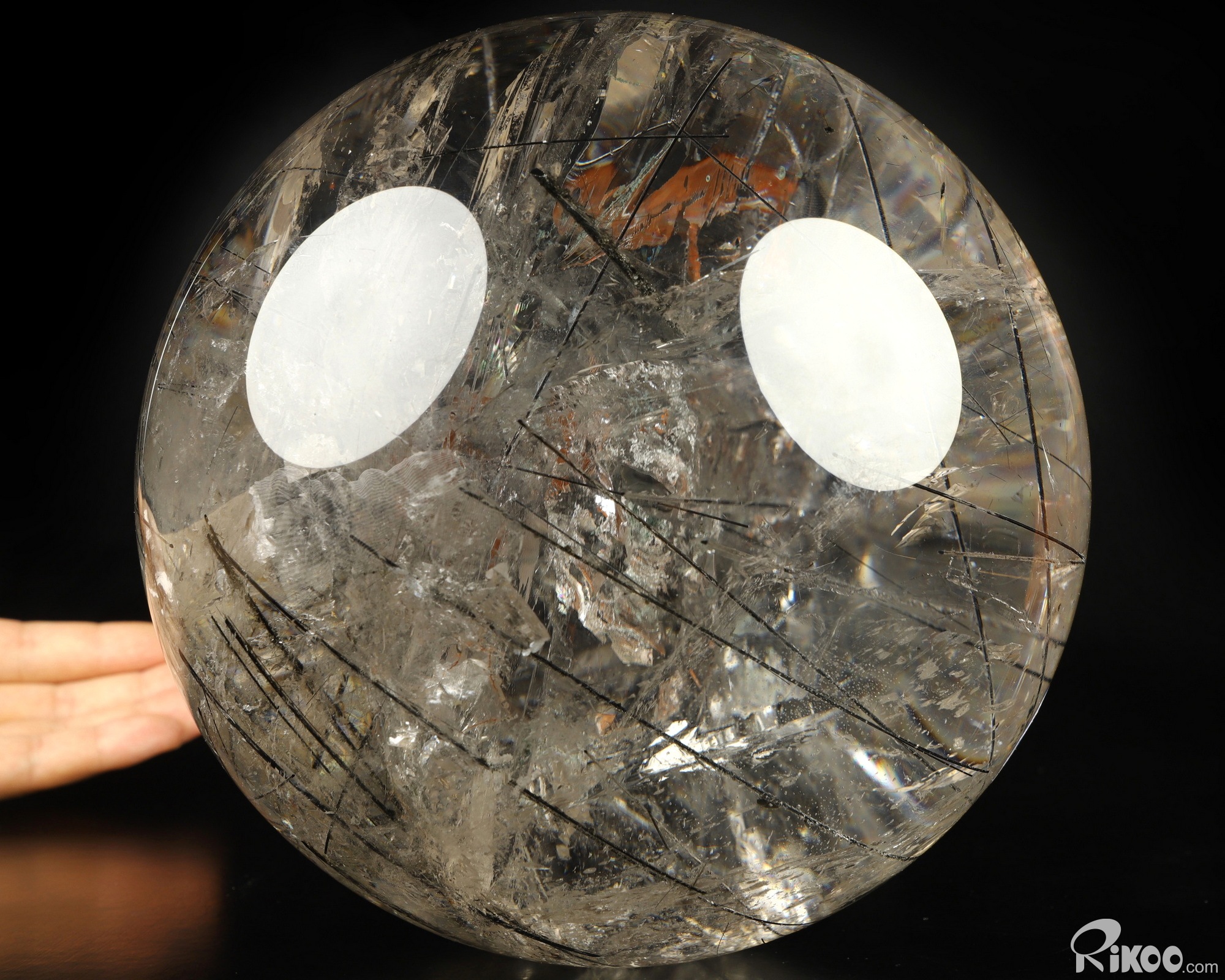 You are looking at a Rutilated Quartz Rock Crystal ball. The ball is 7.6 inches long from front to back.