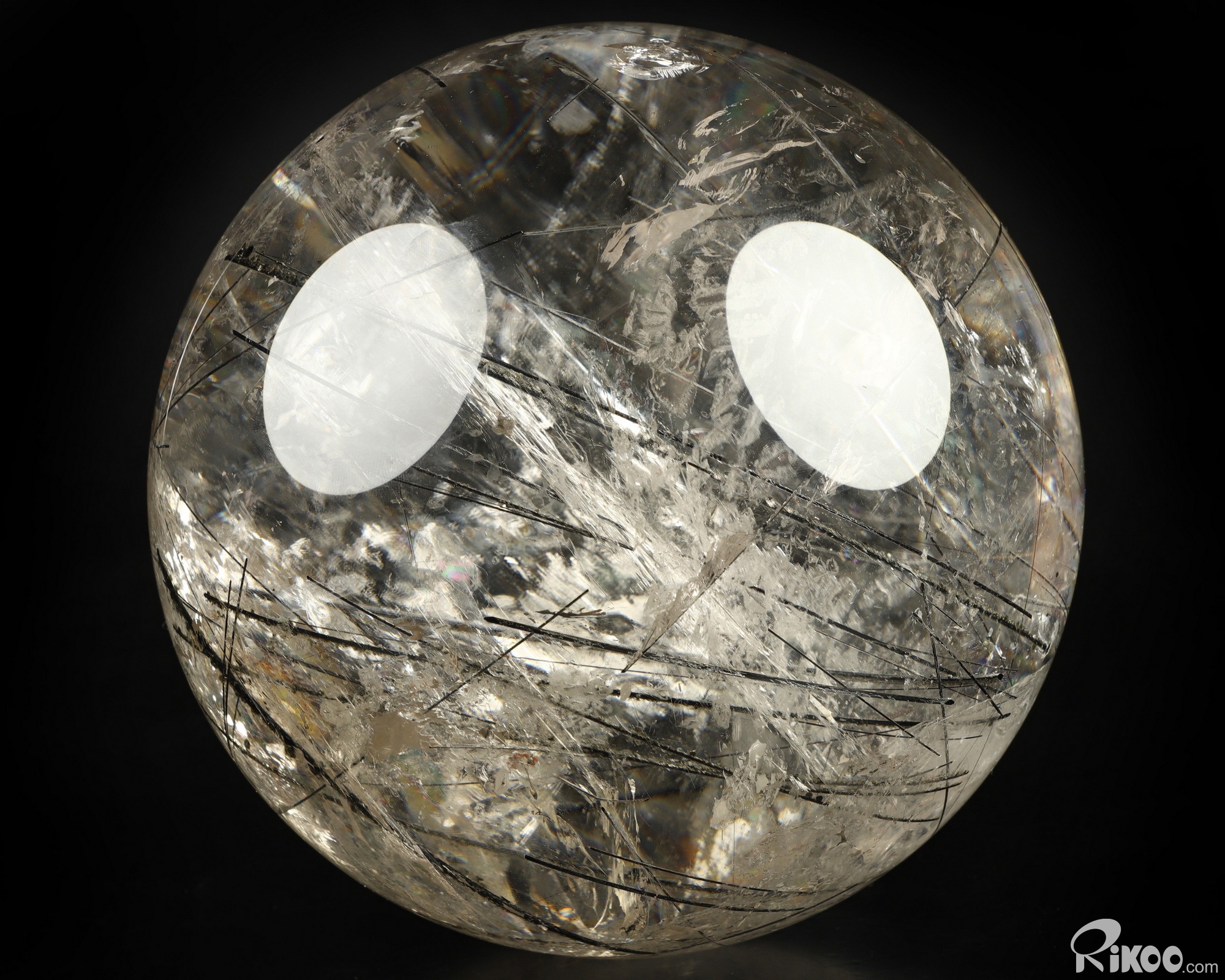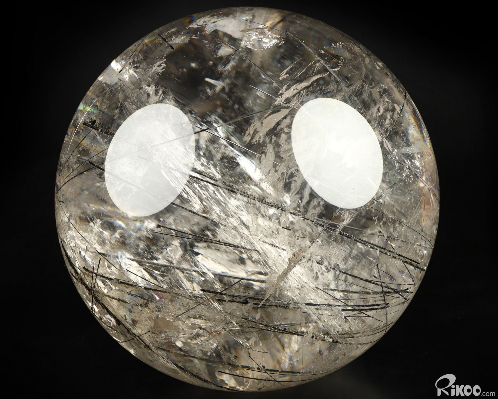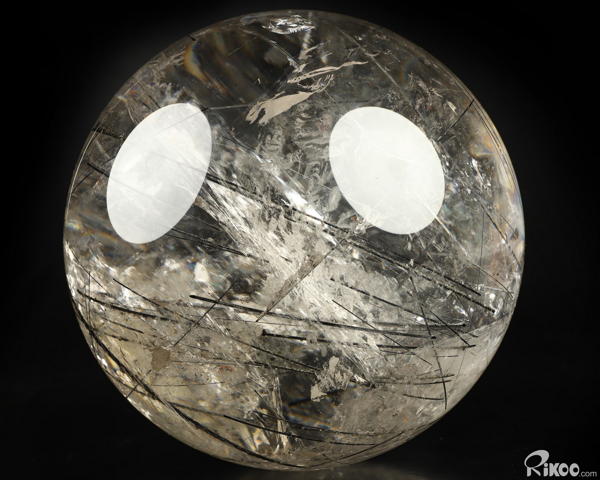 You are looking at a Rutilated Quartz Rock Crystal ball. The ball is 7.6 inches long from front to back.