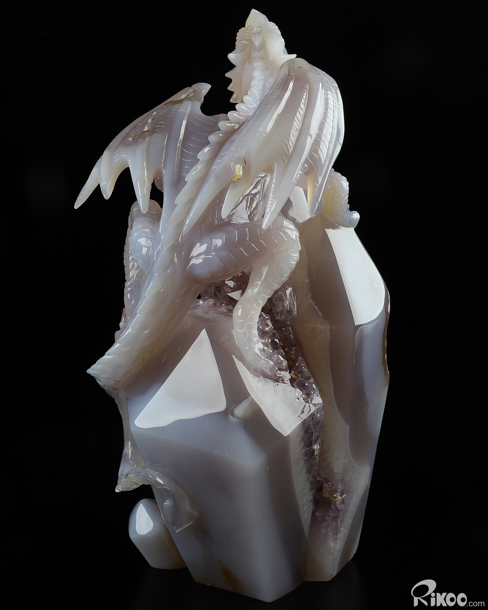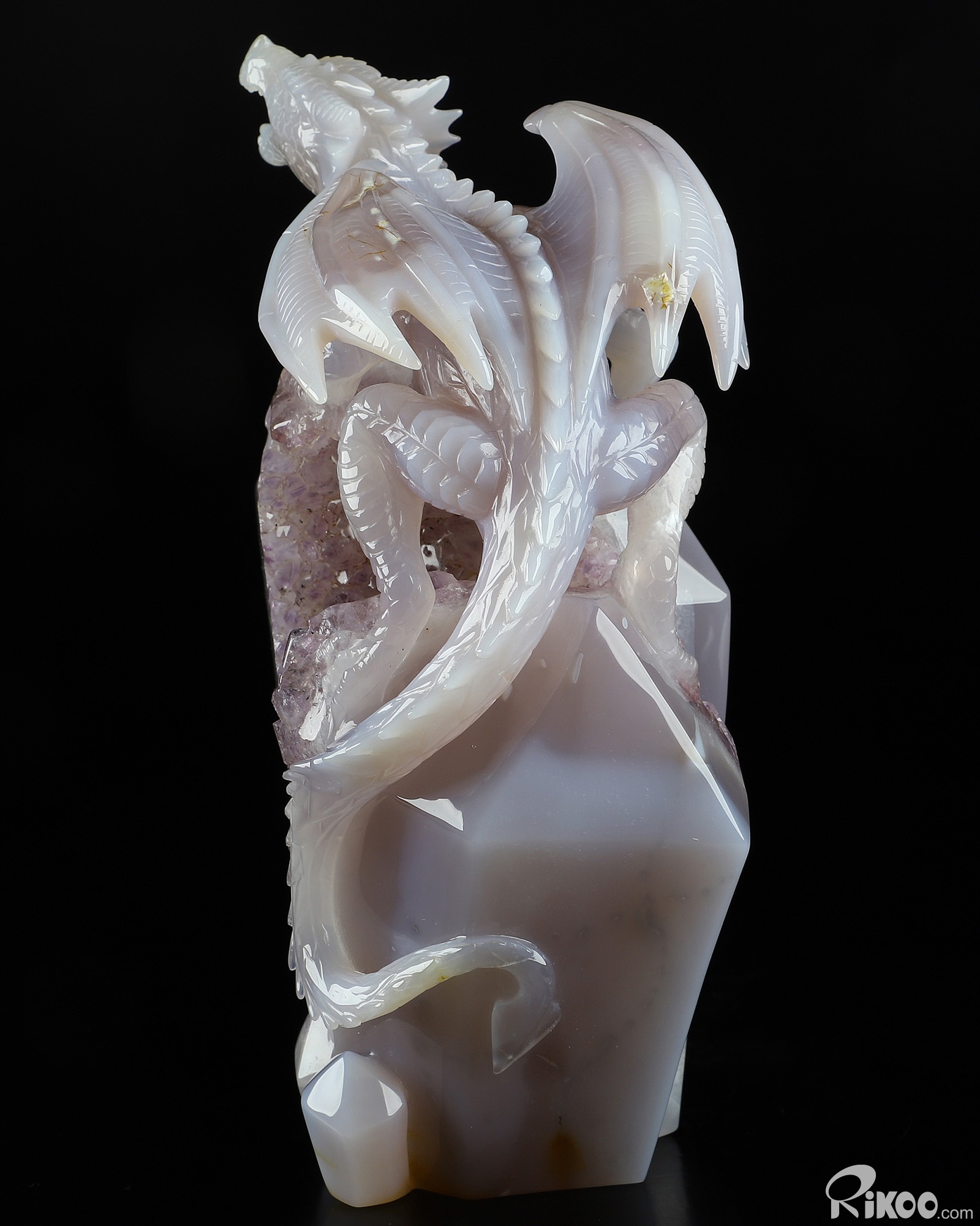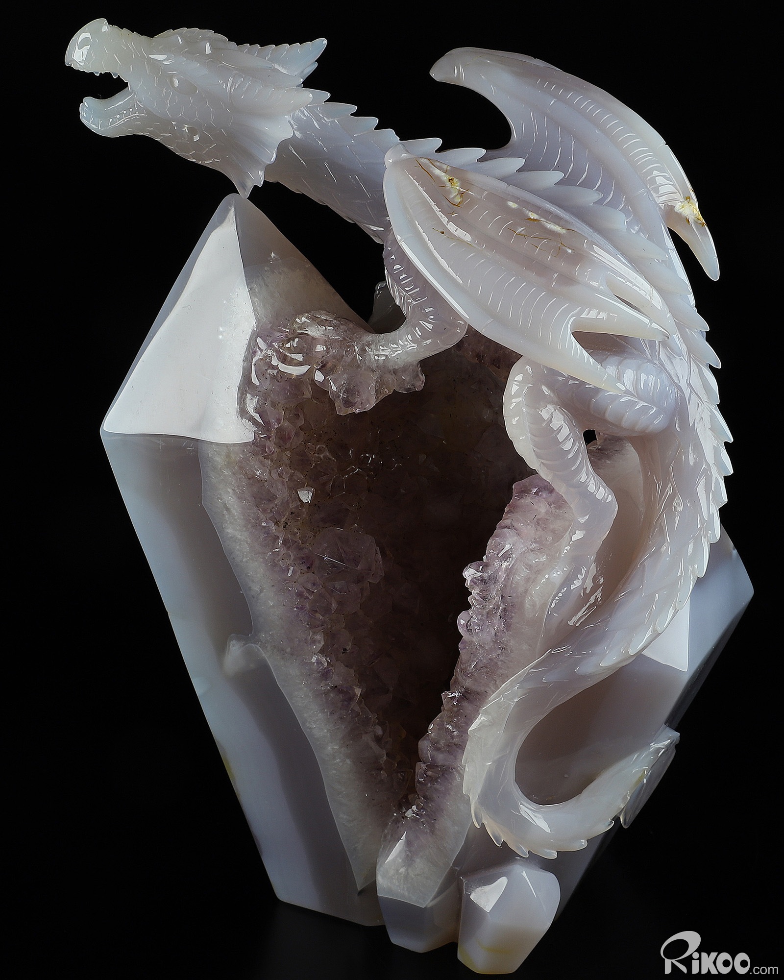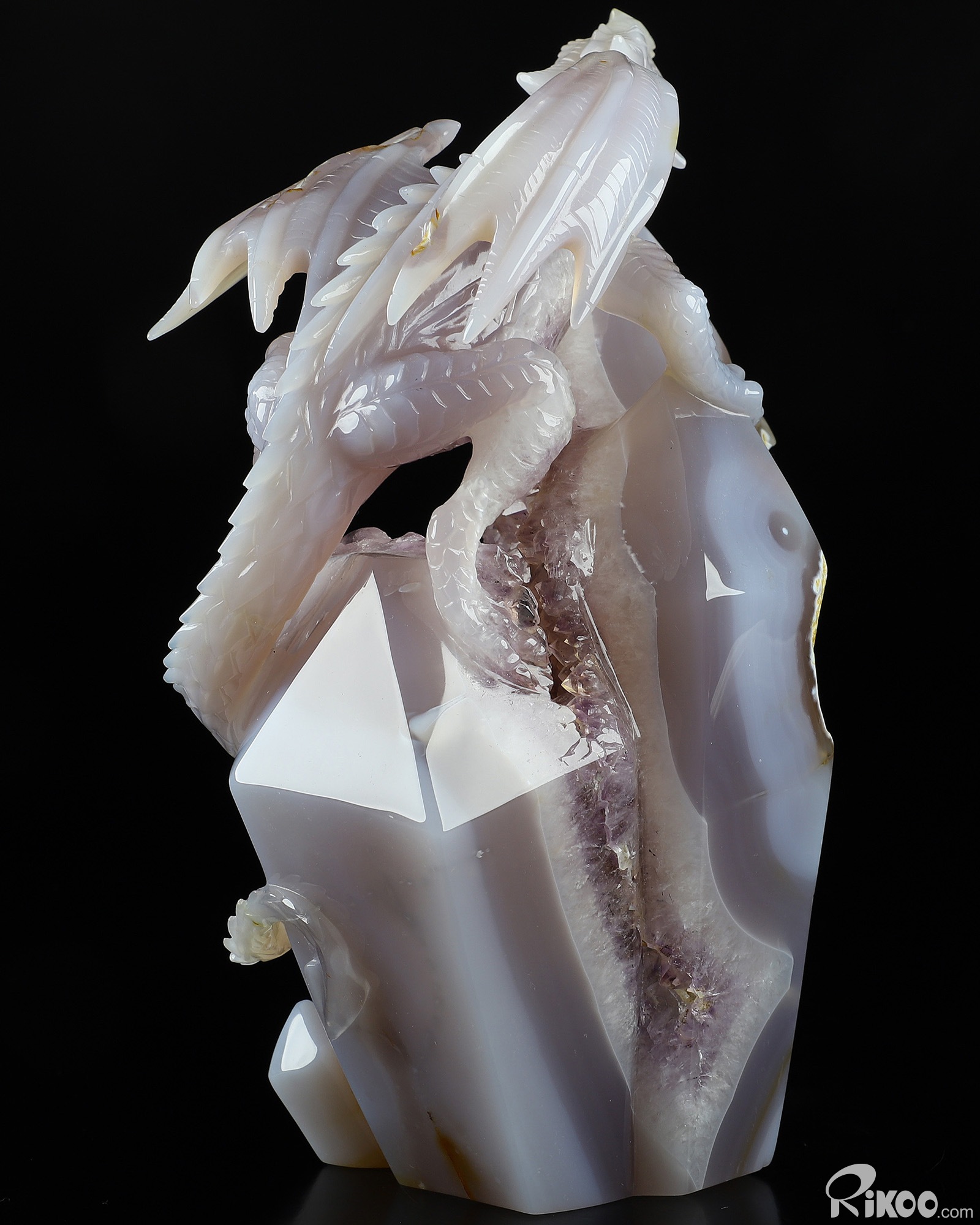 Gemstone 8.3" Agate Amethyst Geode Carved Crystal Dragon Sculpture, Realistic, Crystal Healing