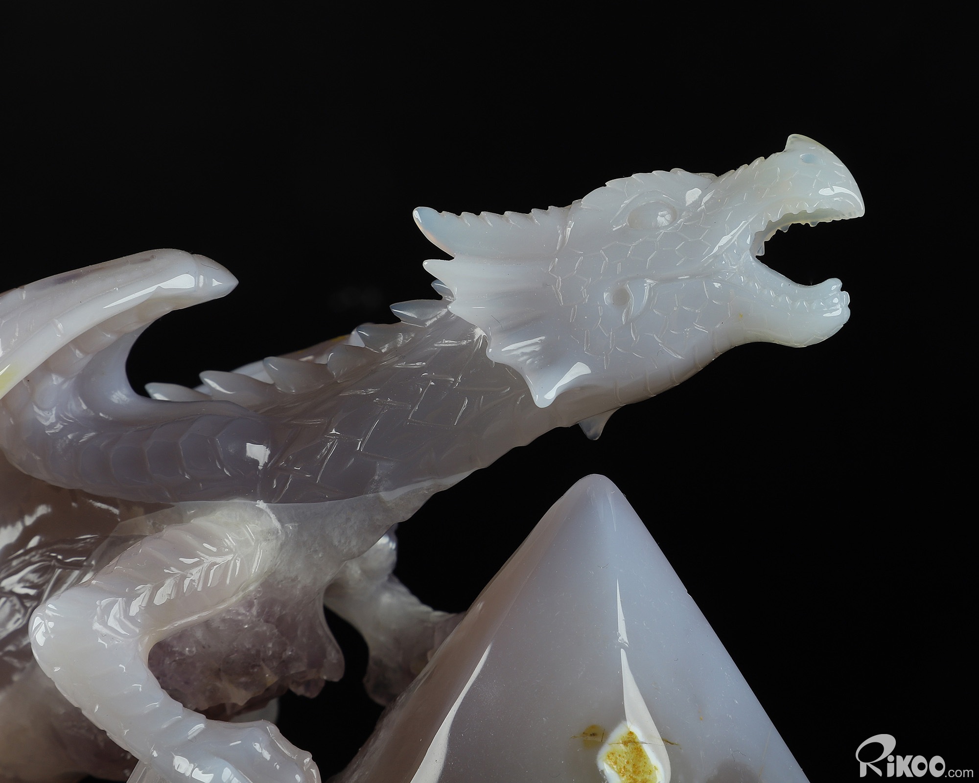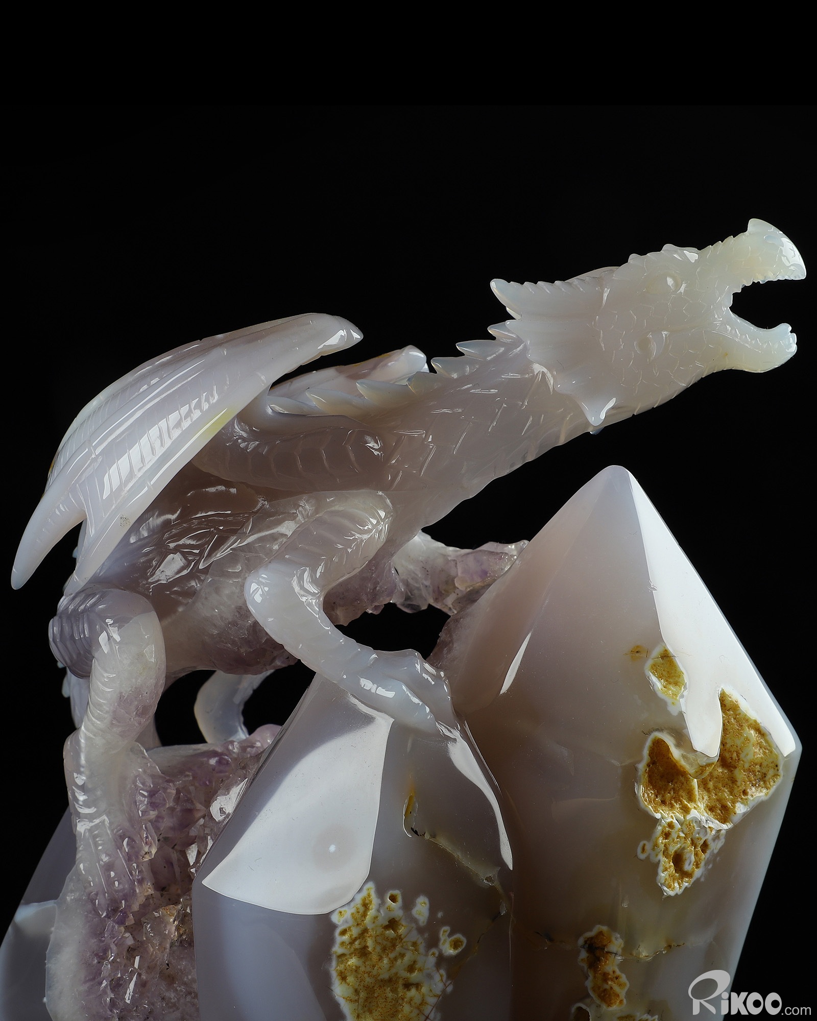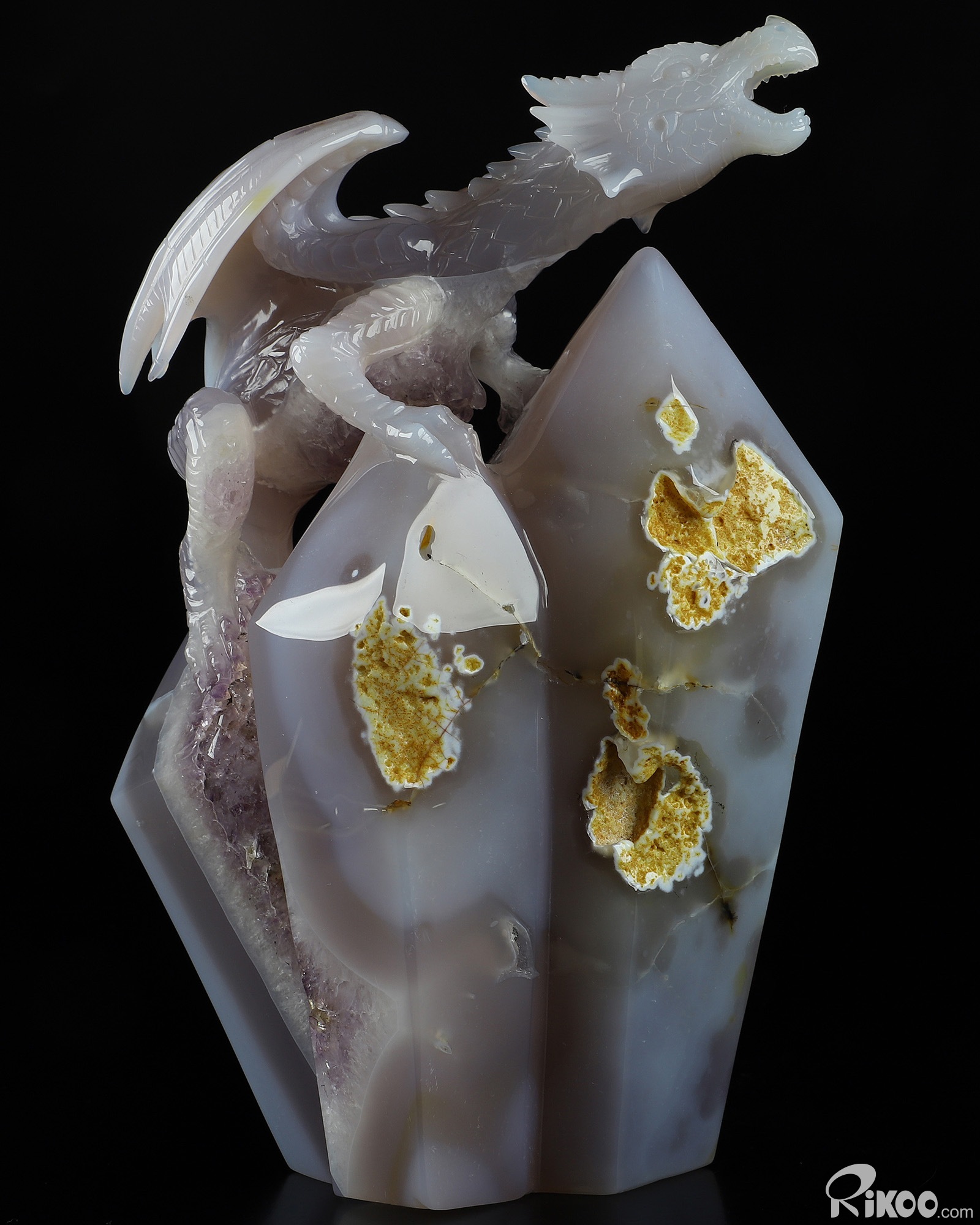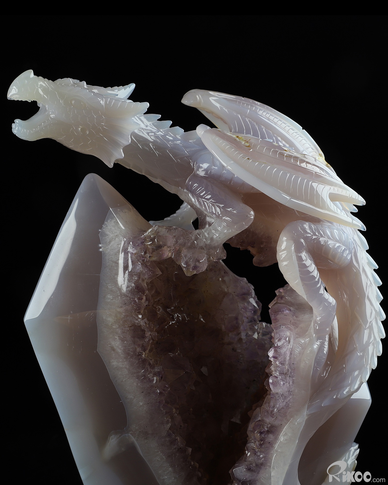 Gemstone 8.3" Agate Amethyst Geode Carved Crystal Dragon Sculpture, Realistic, Crystal Healing