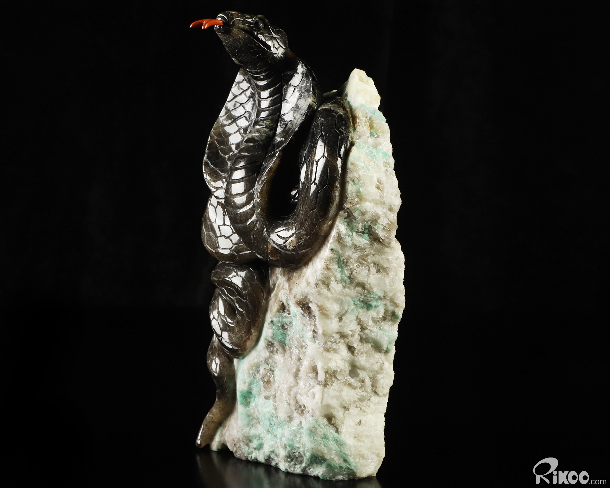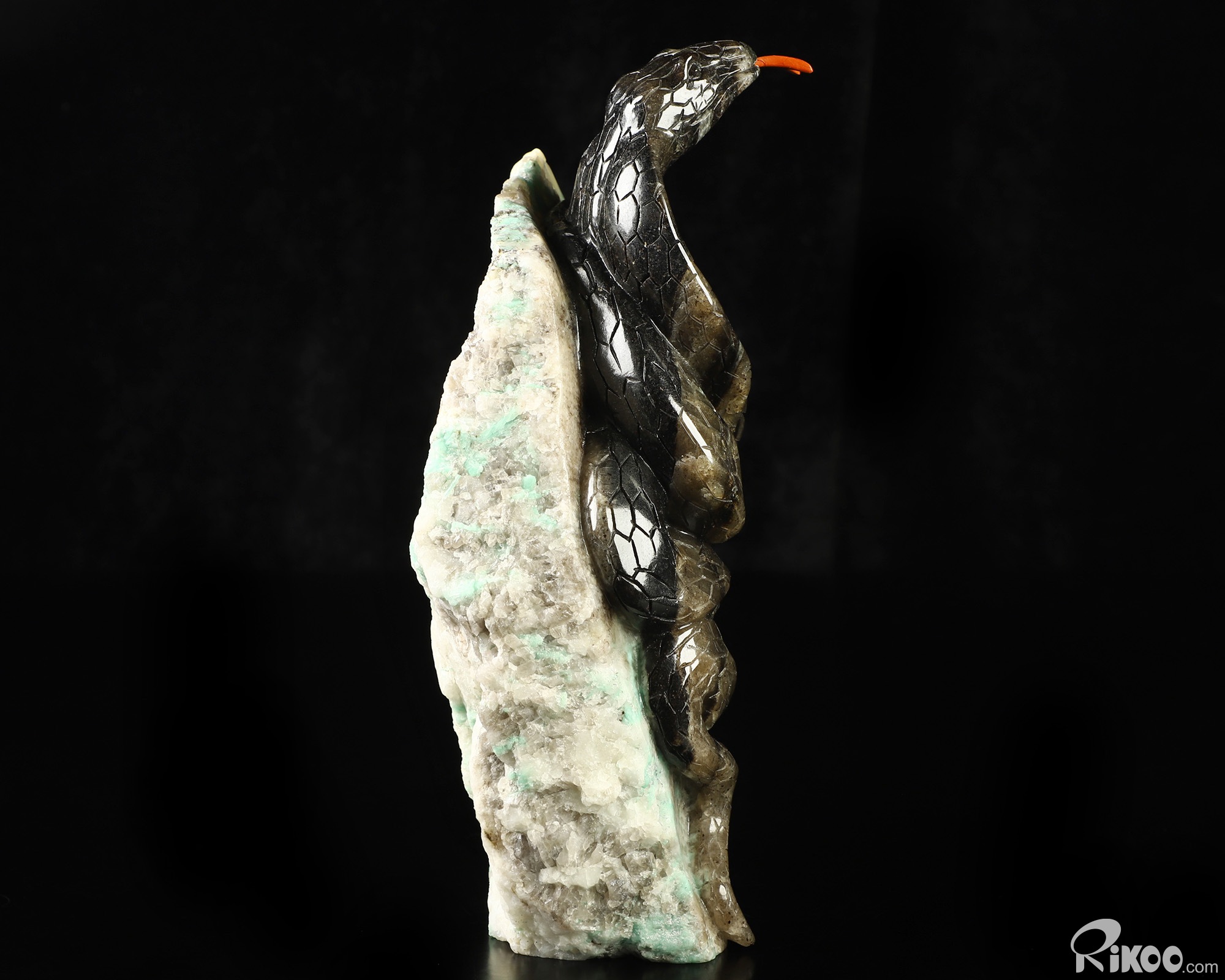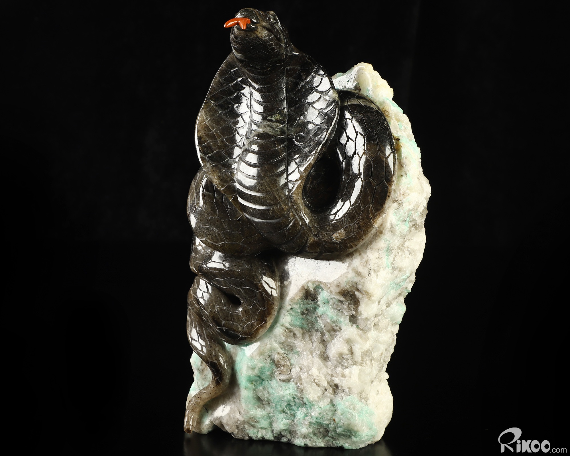 Gemstone 8.3" Emerald Hand Carved Crystal Snake Sculpture, Crystal Healing