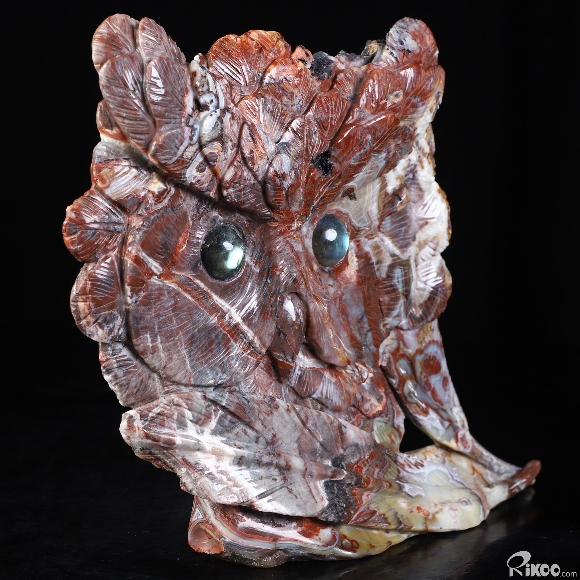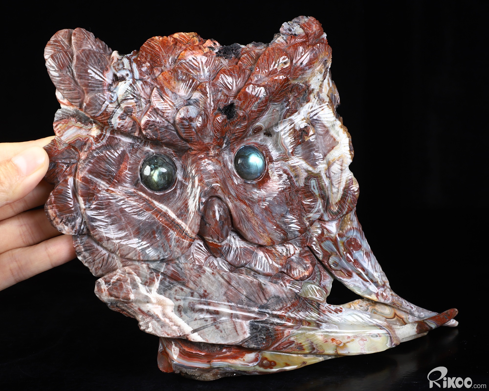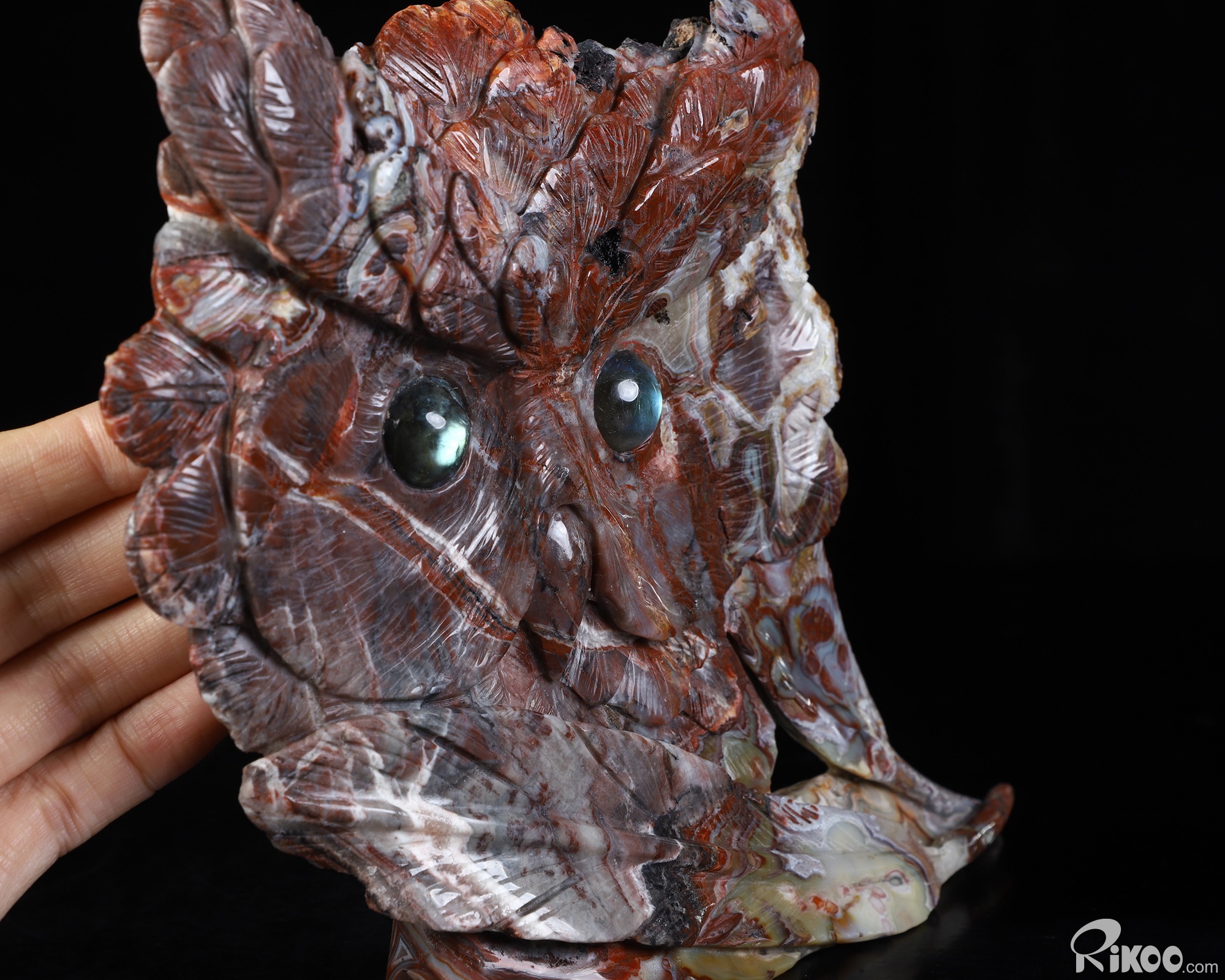 Gemstone 8.5" Red Crazy Lace Agate Hand Carved Crystal Owl Sculpture, Crystal Healing