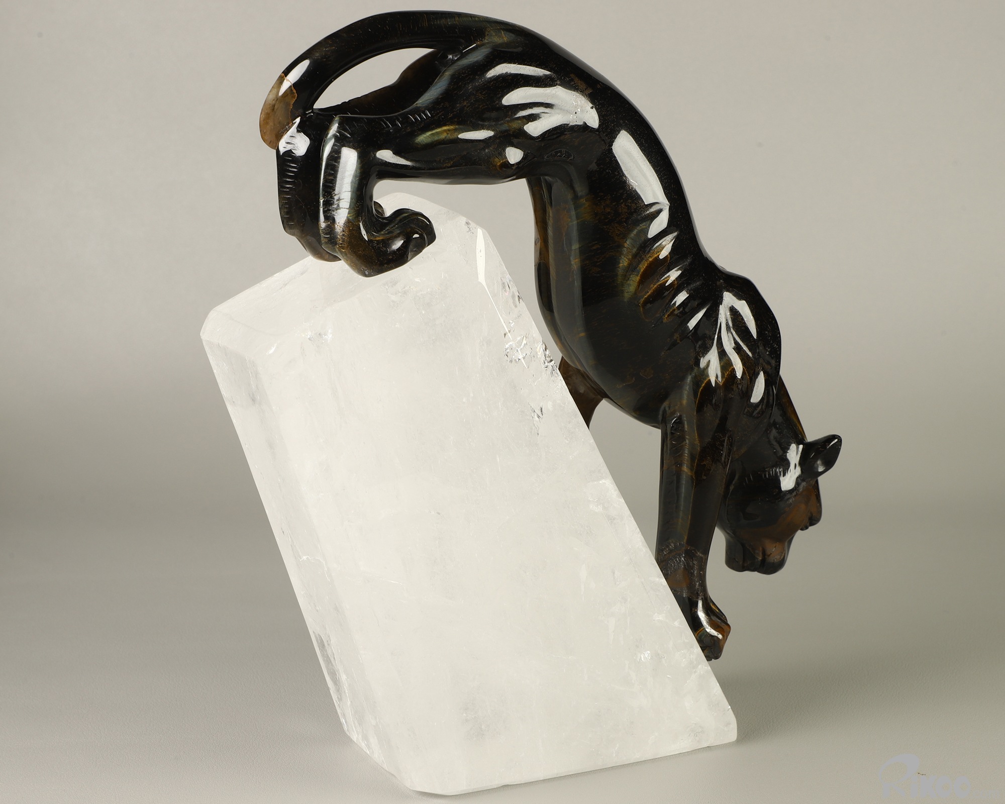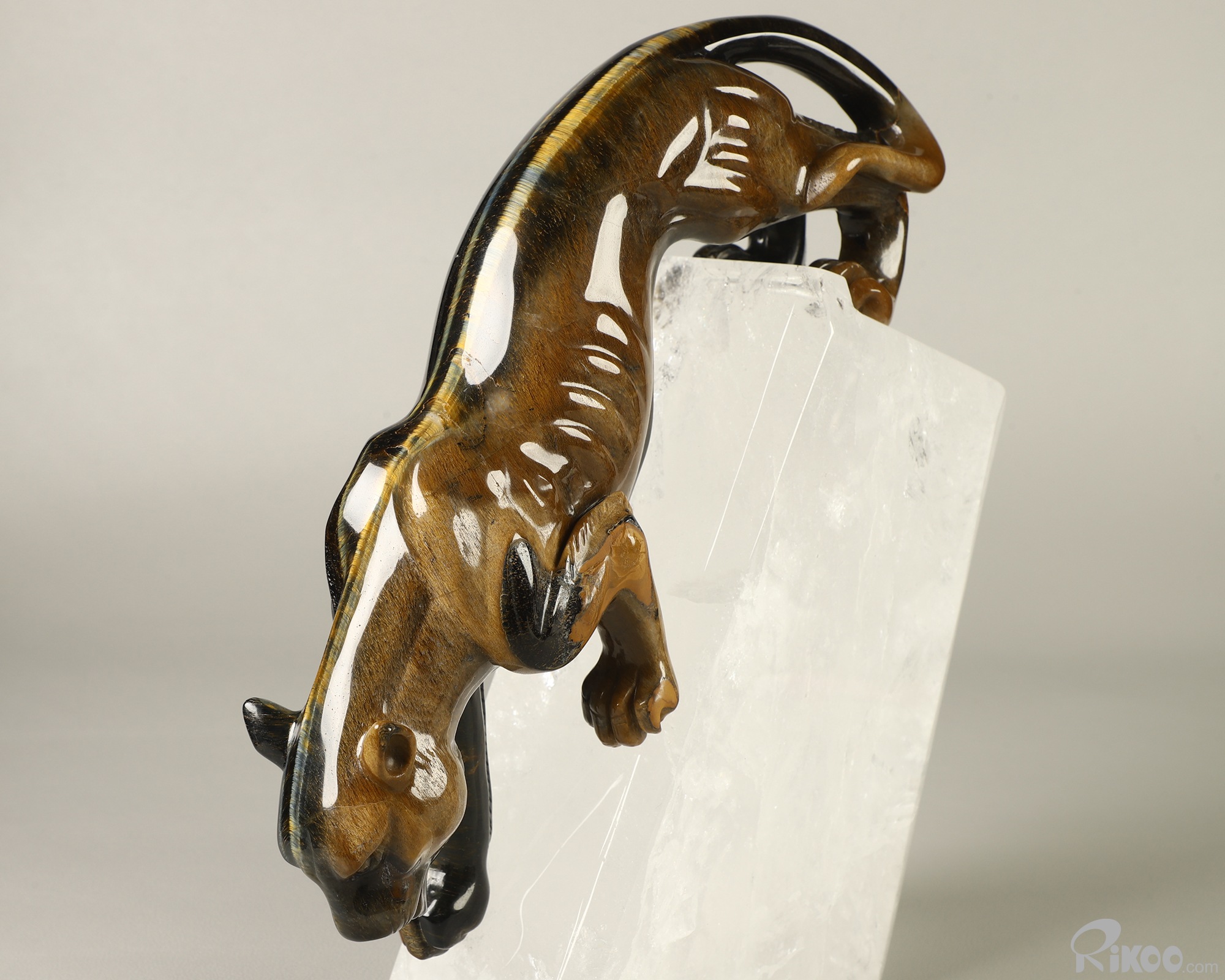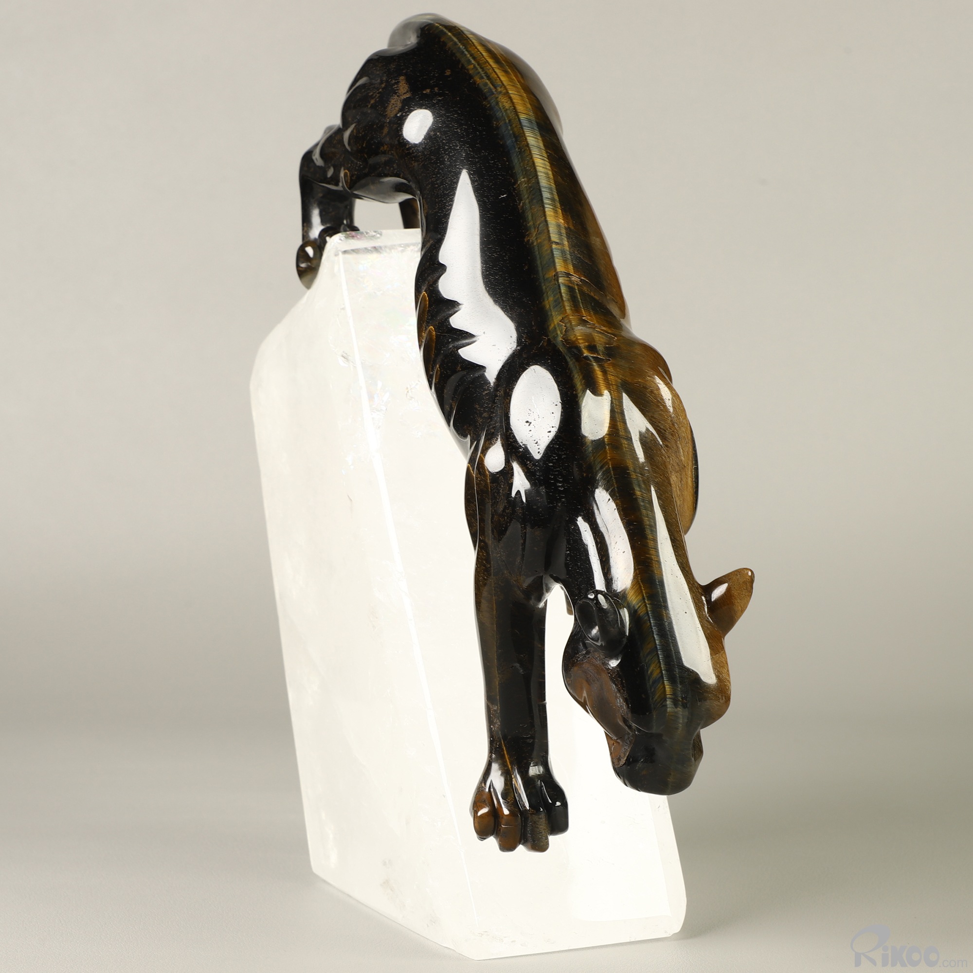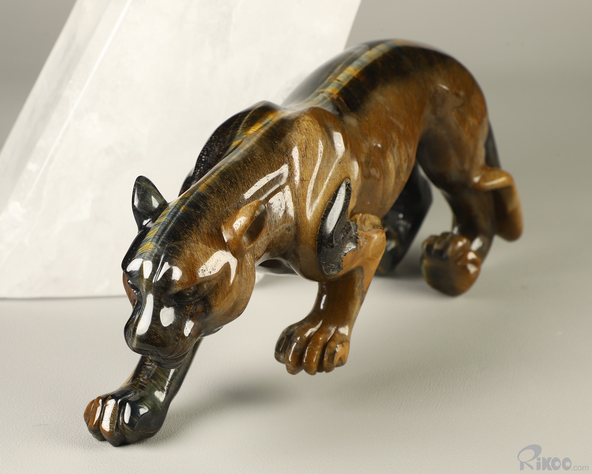 Gemstone 9.1" Blue & Gold Tiger's Eye Hand Carved Crystal Leopard & Quartz Stand Sculpture, Crystal Healing