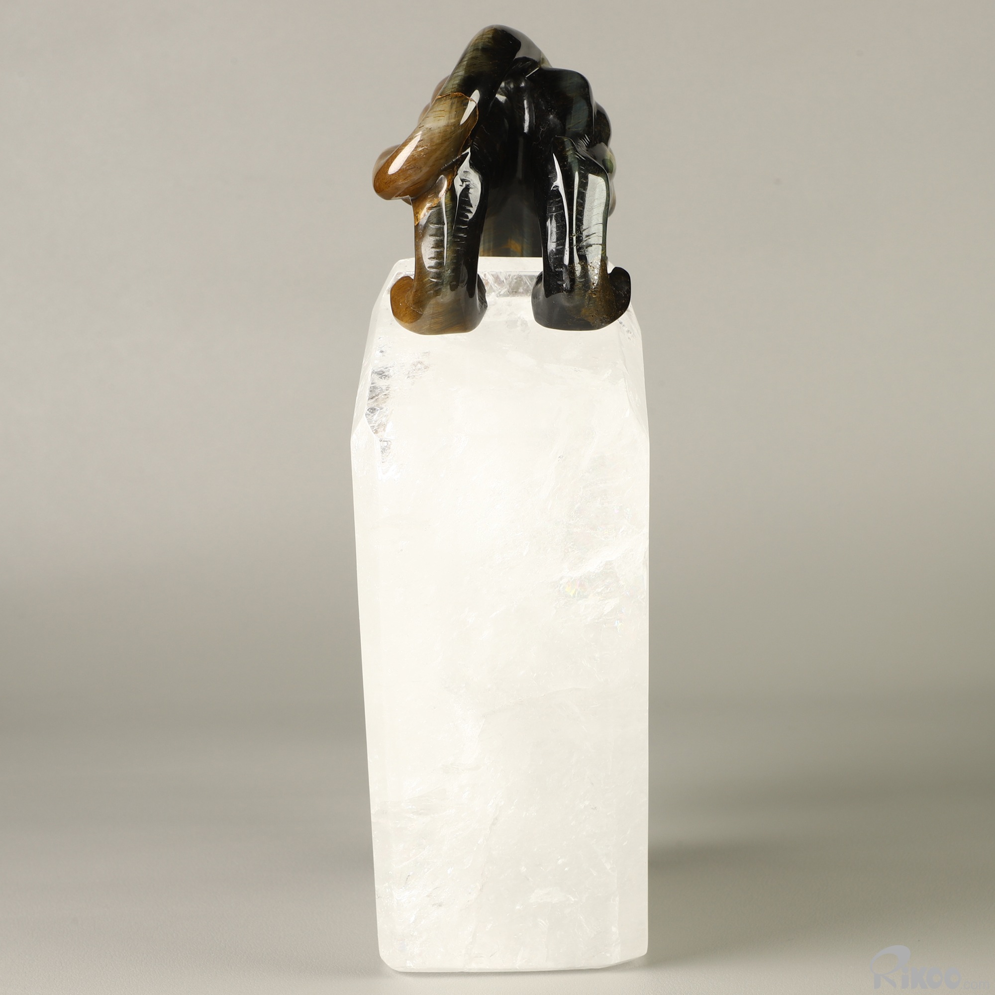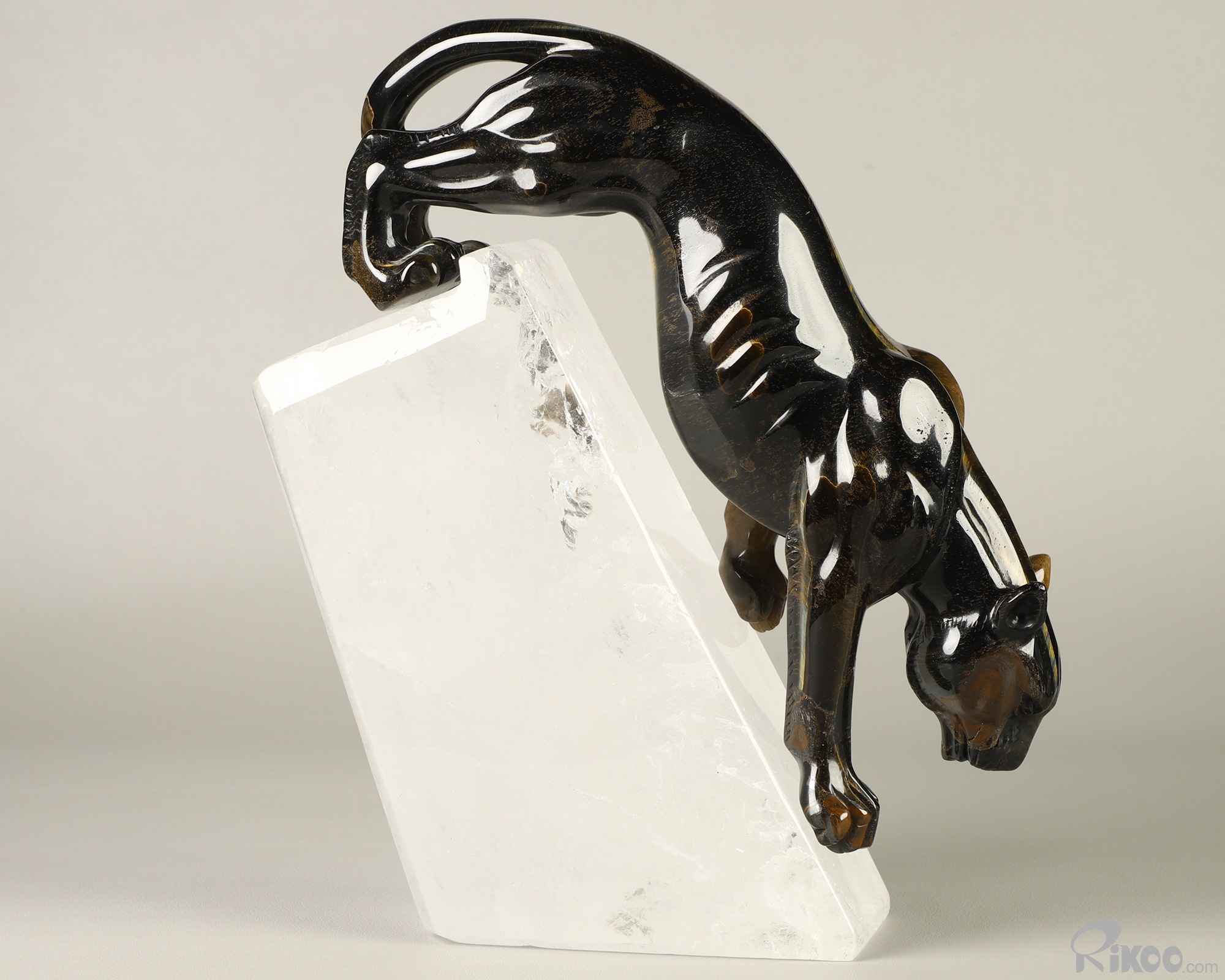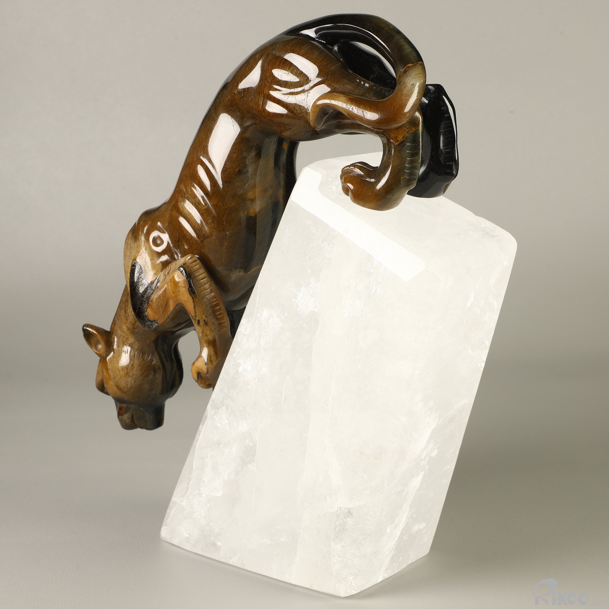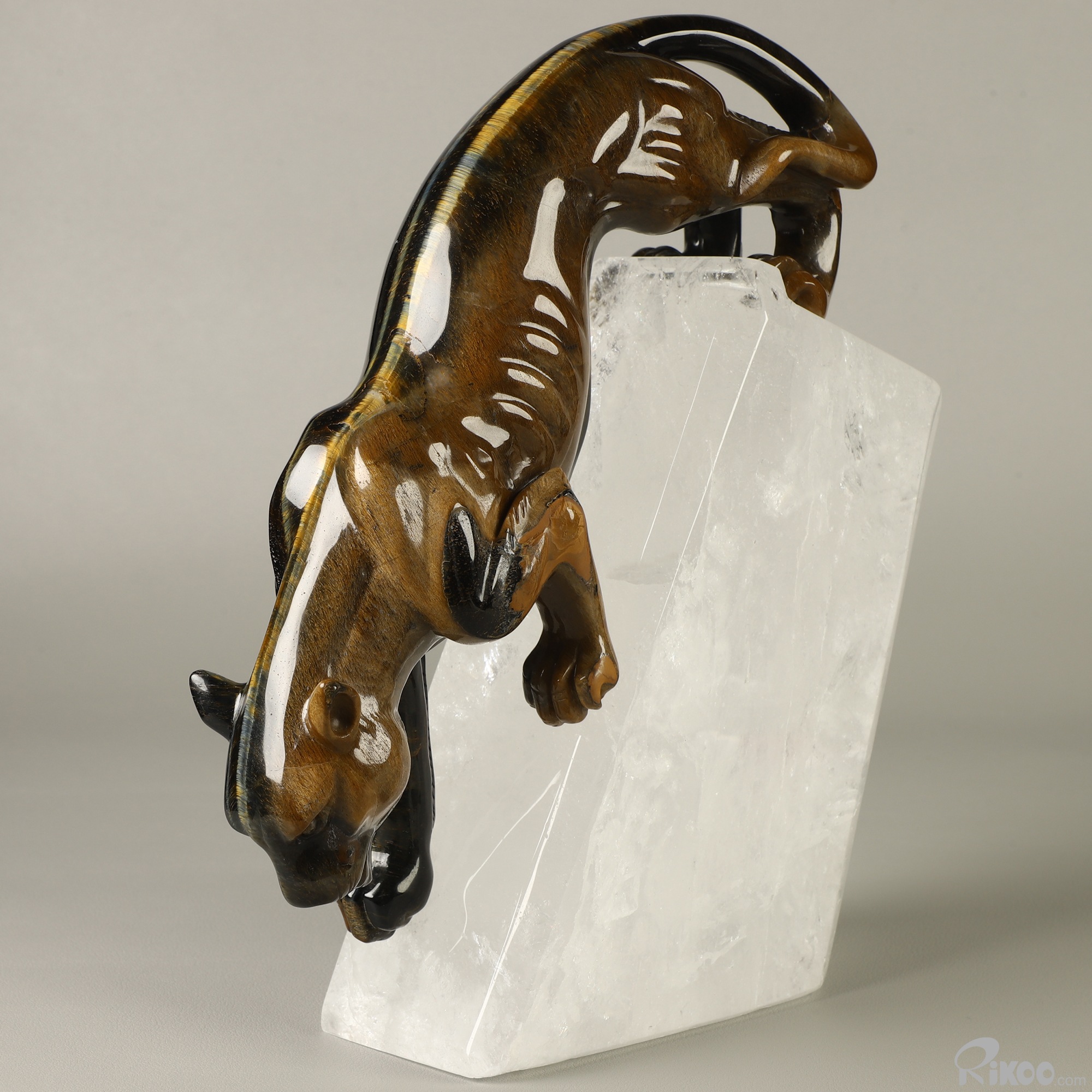 Gemstone 9.1" Blue & Gold Tiger's Eye Hand Carved Crystal Leopard & Quartz Stand Sculpture, Crystal Healing
