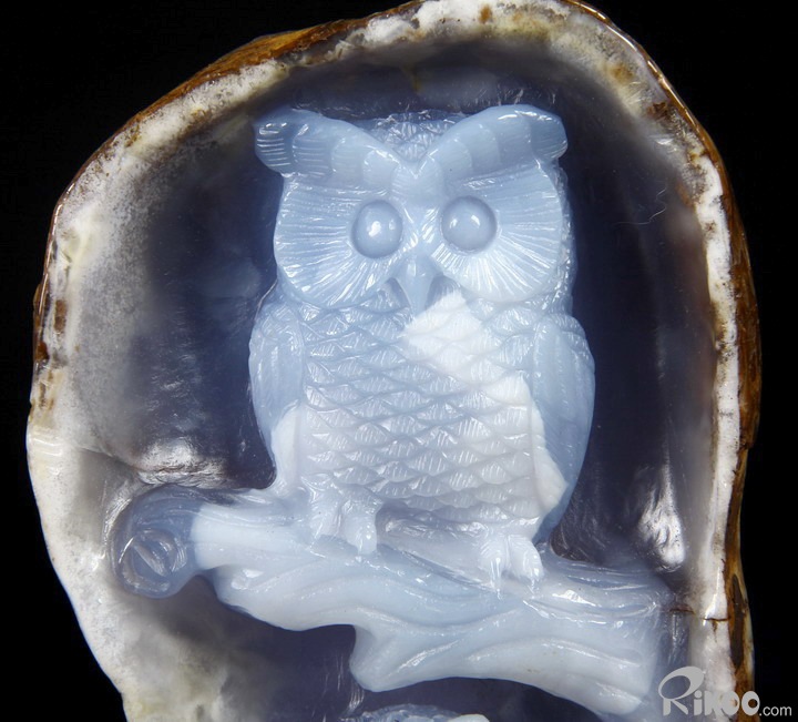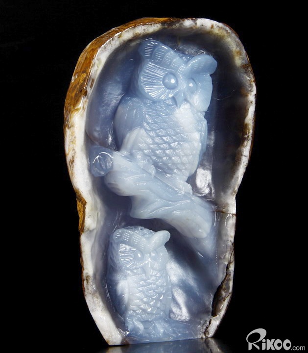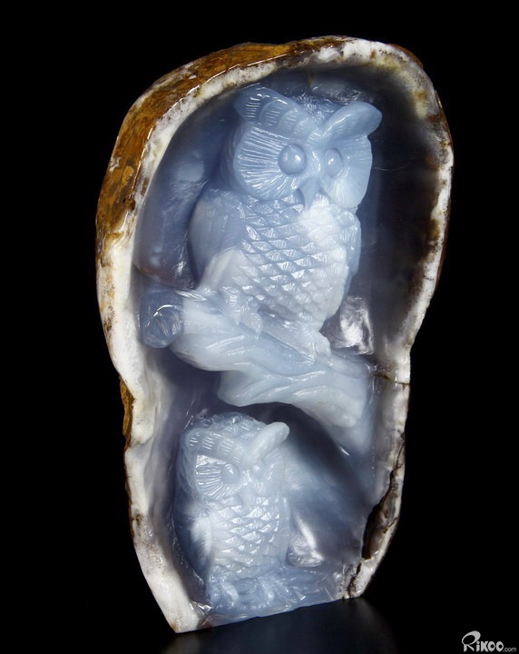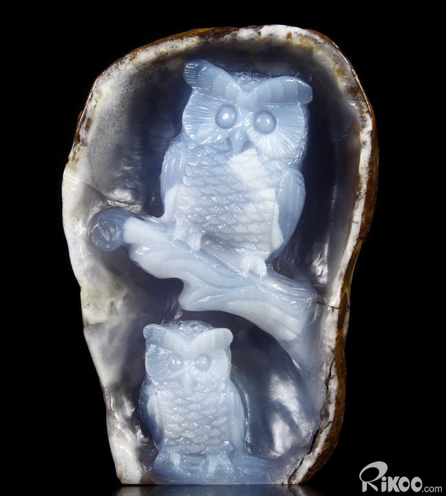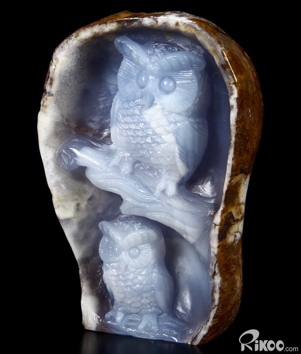 Gemstone Huge 5.1" Blue Chalcedony Carved Crystal Owls & Branch Sculpture