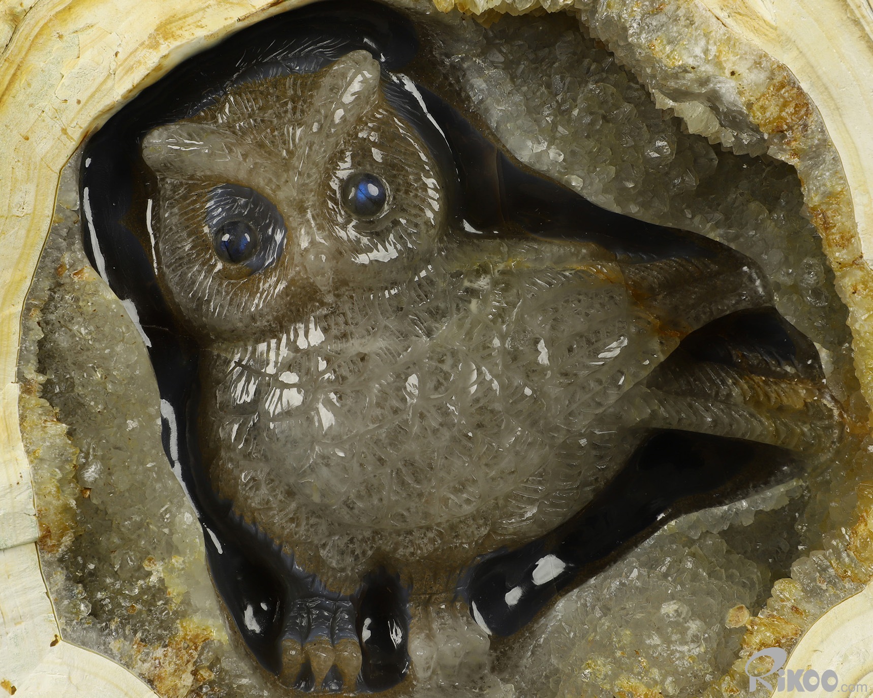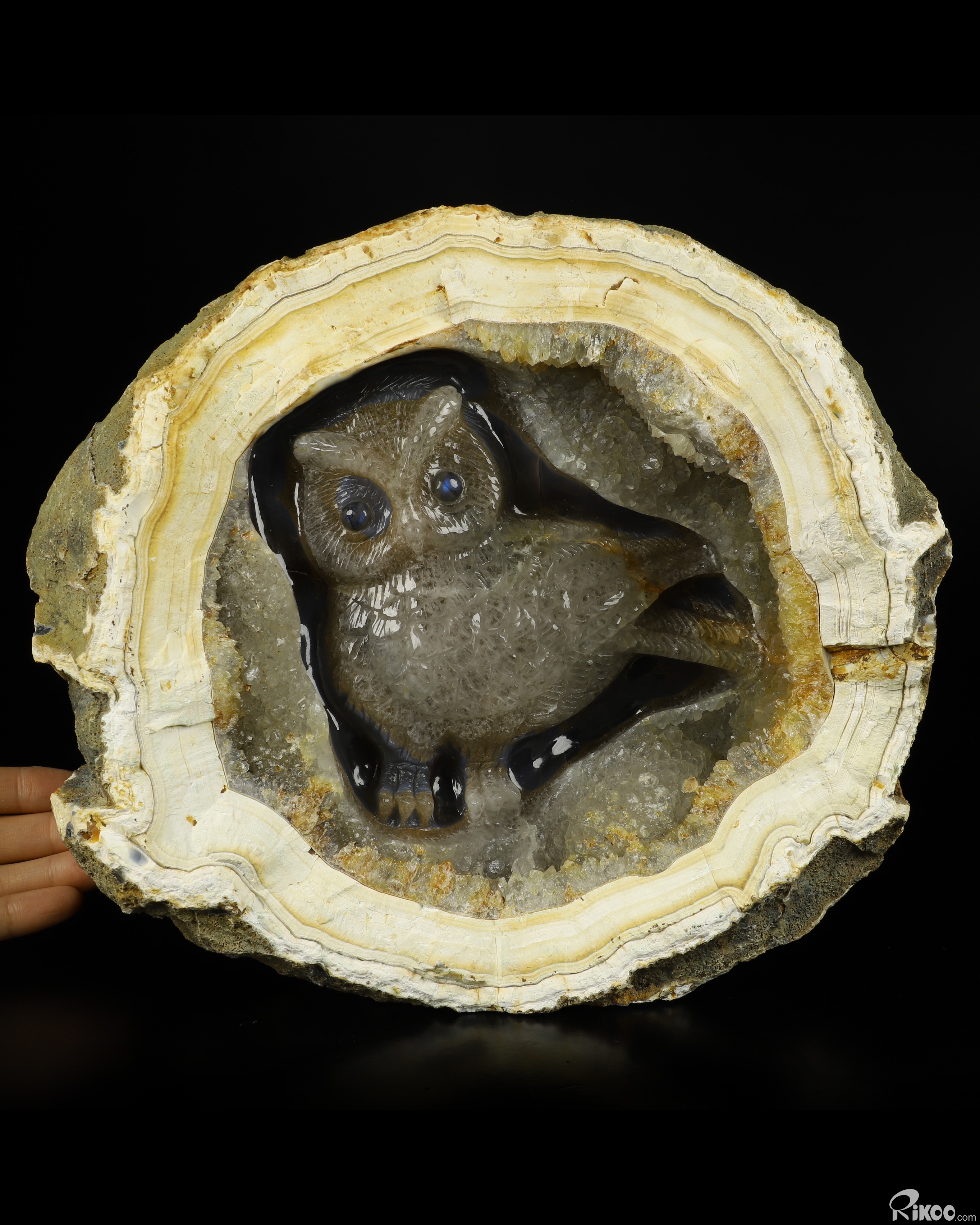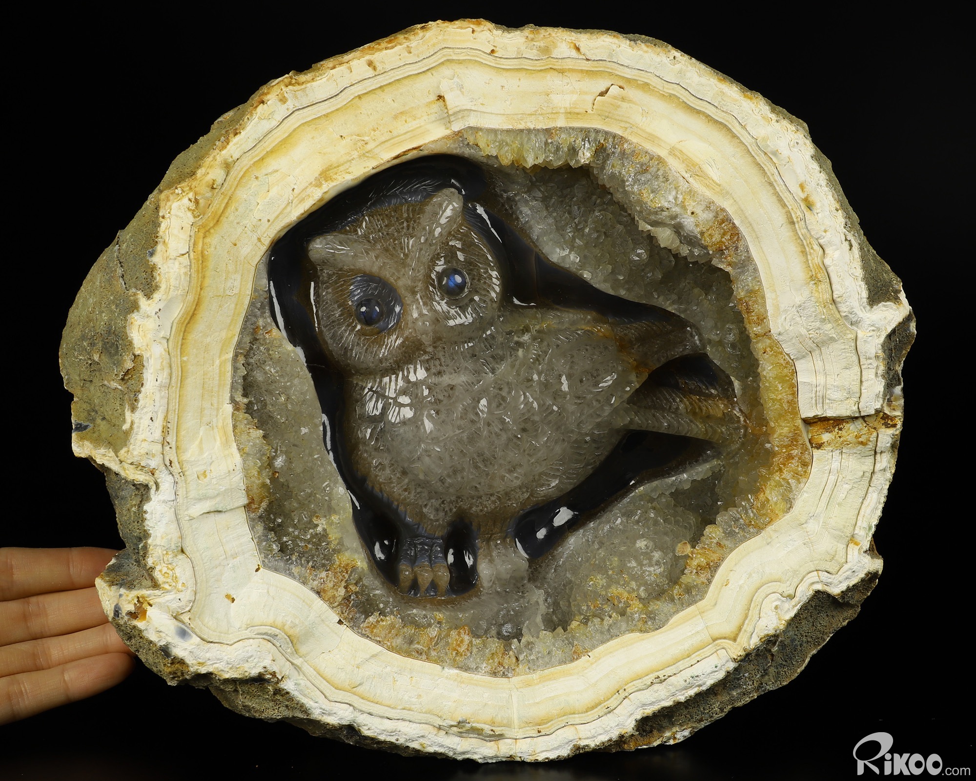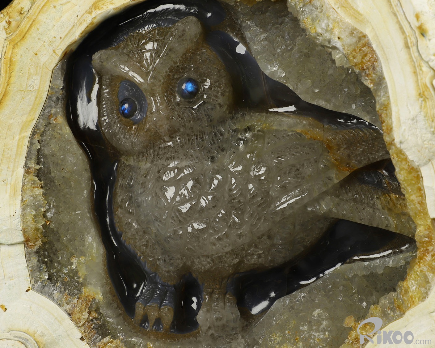 Giant 9.9" Quartz Druse Carved Crystal Owl & Labradorite Eyes Sculpture, Realistic, Crystal Healing