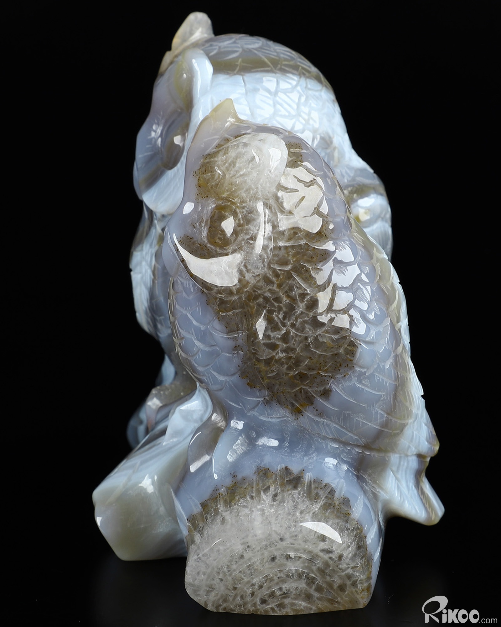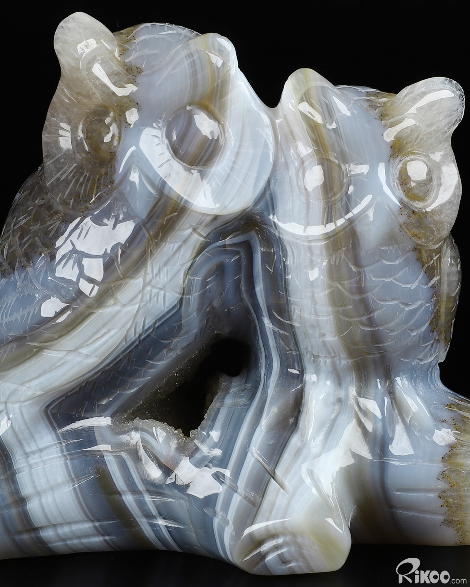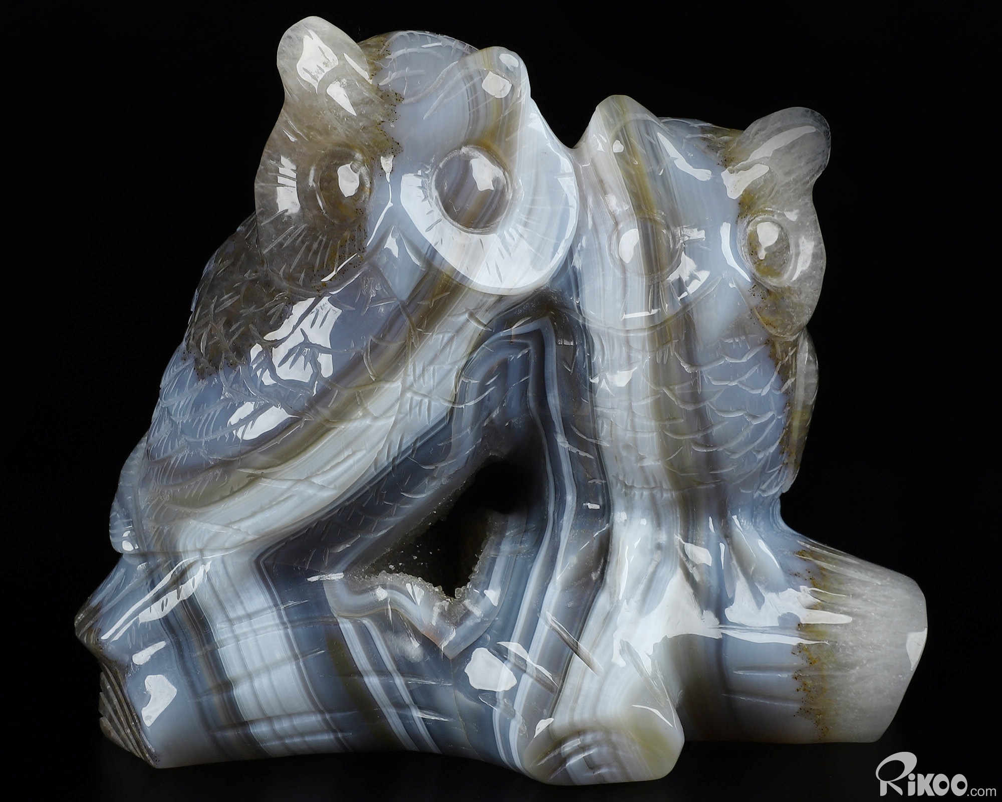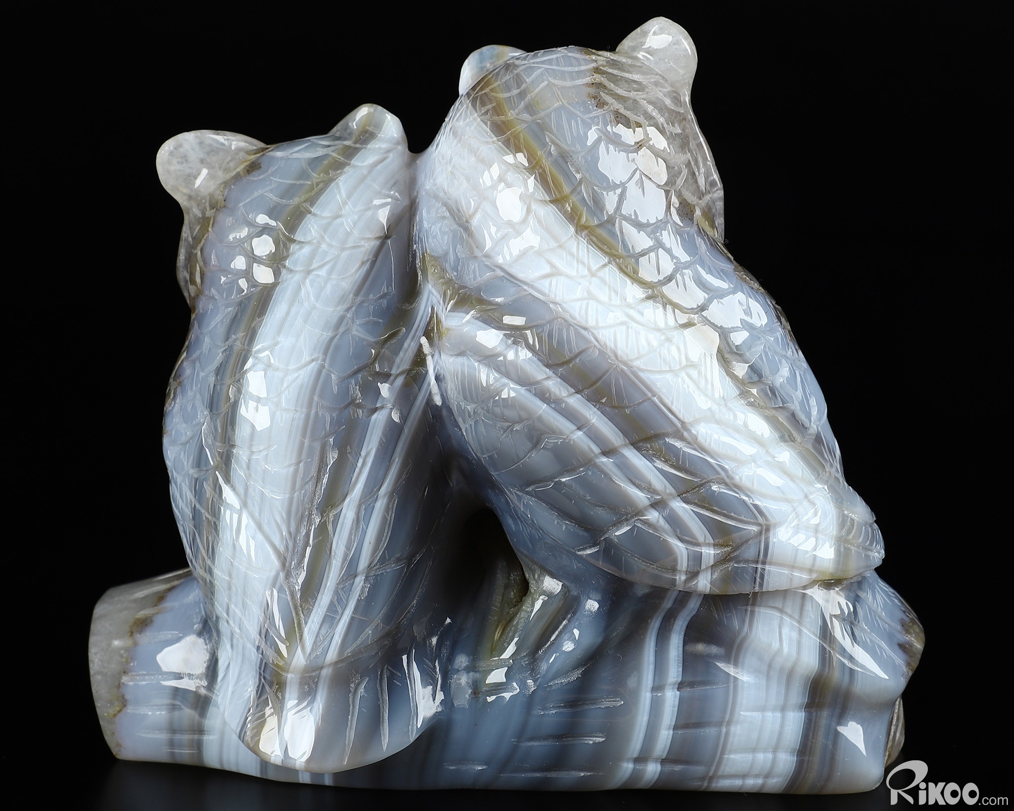 Gray & White Agate 5.2" Indian Agate Carved Owl Crystal Owls Family, Realistic, Crystal Healing