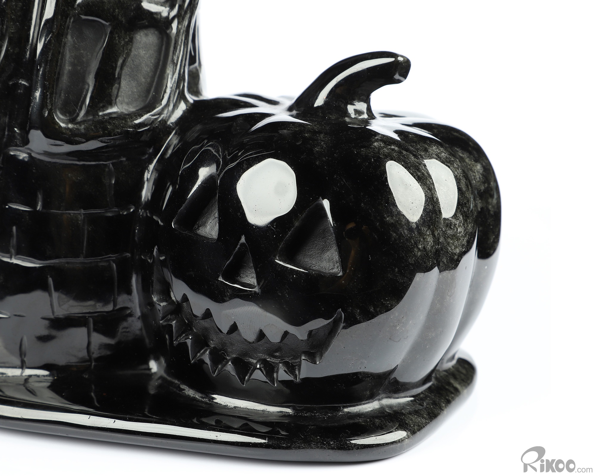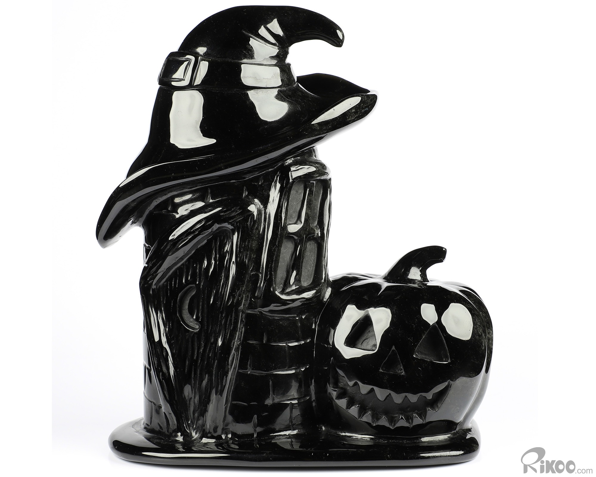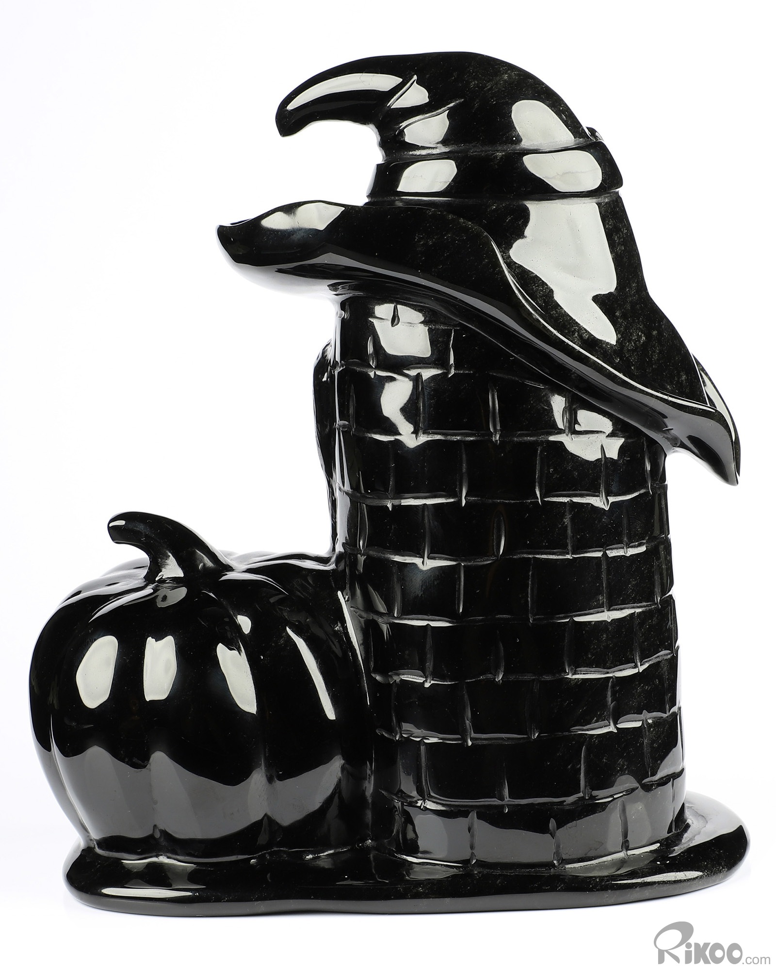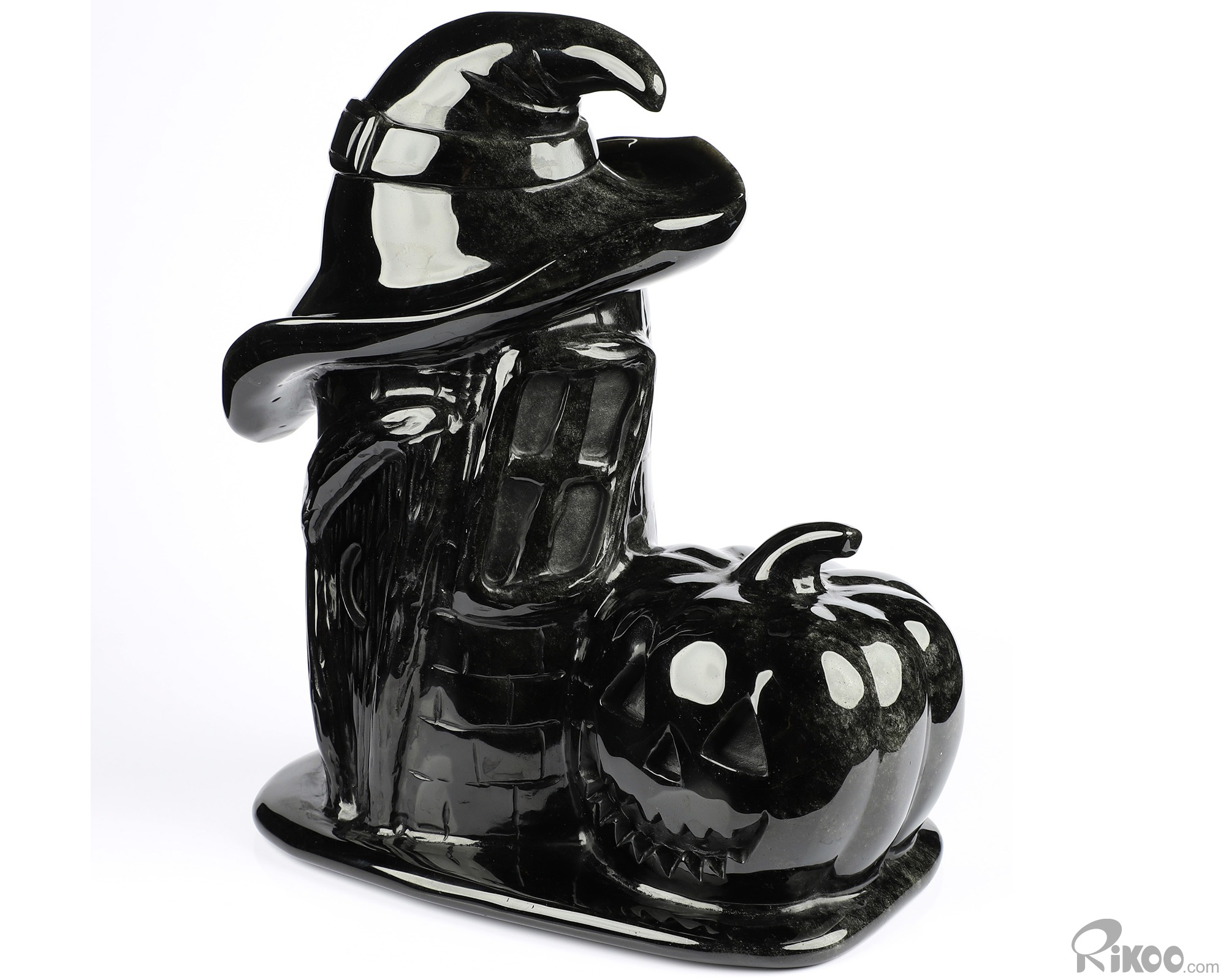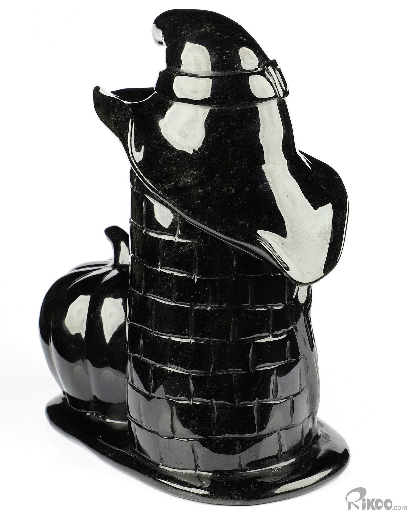 Happy Halloween 6.9" Black Obsidian Carved Crystal Skull Pumpkin Sculpture, Crystal Healing