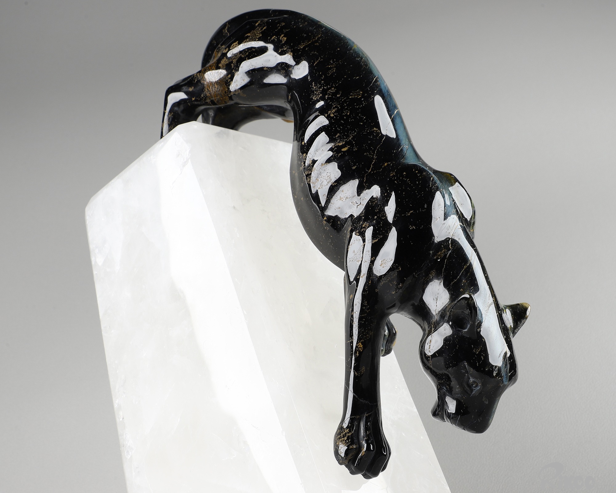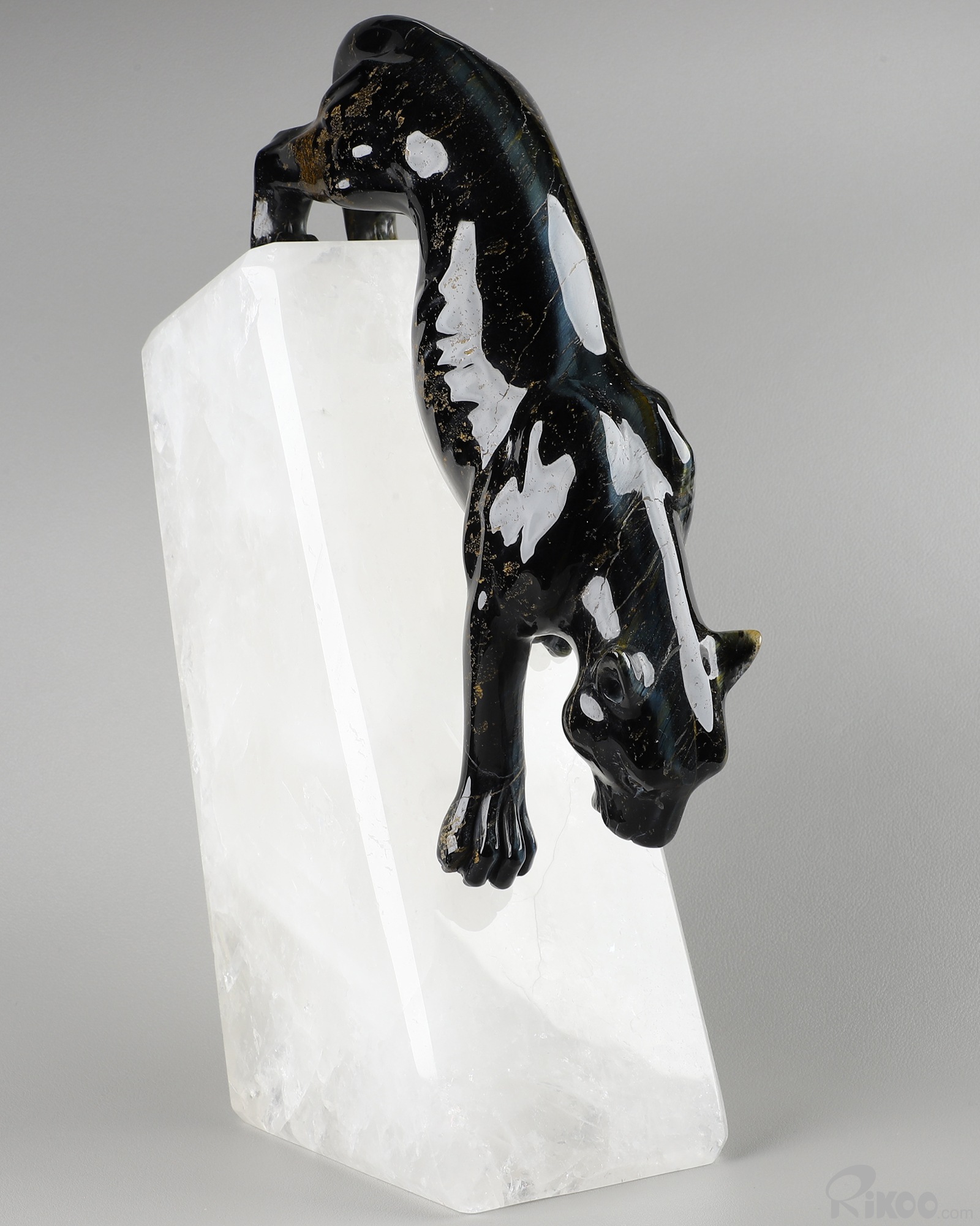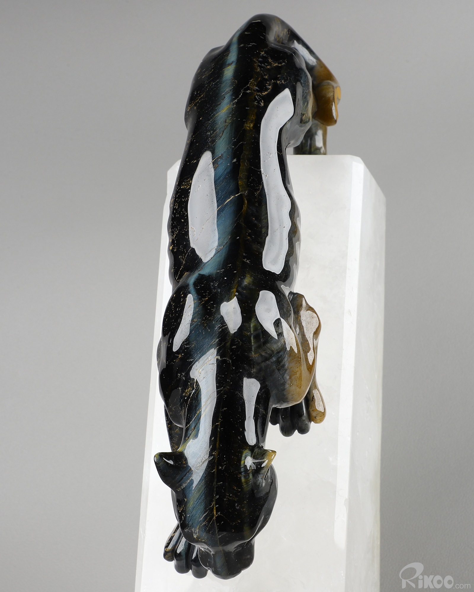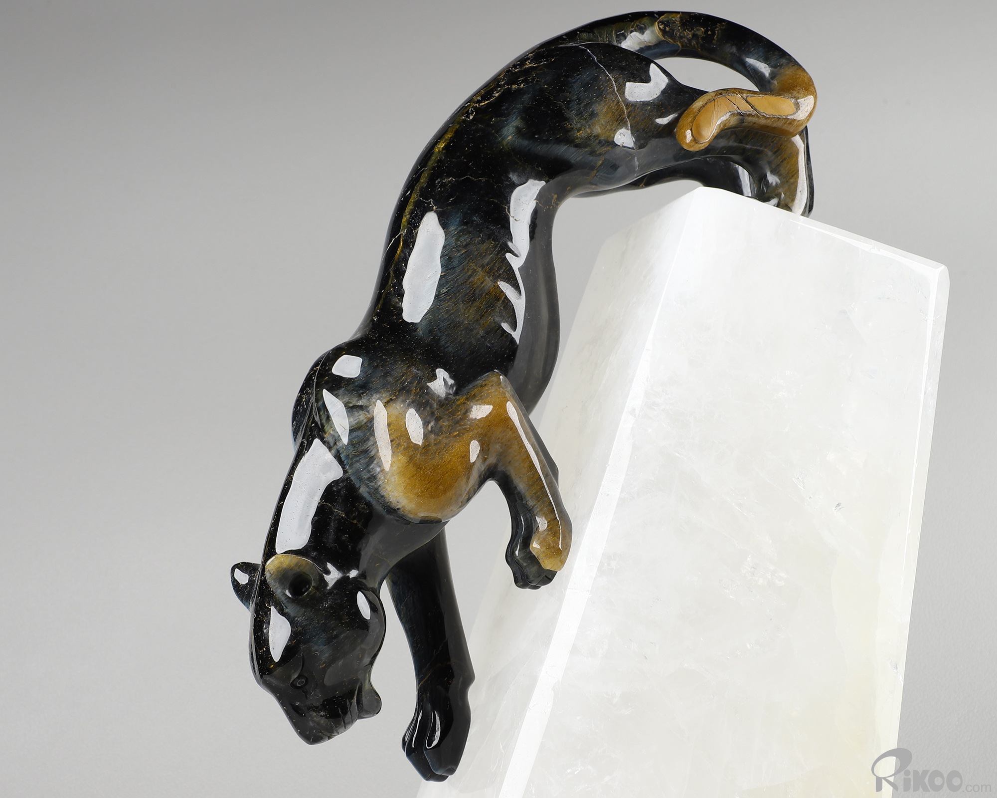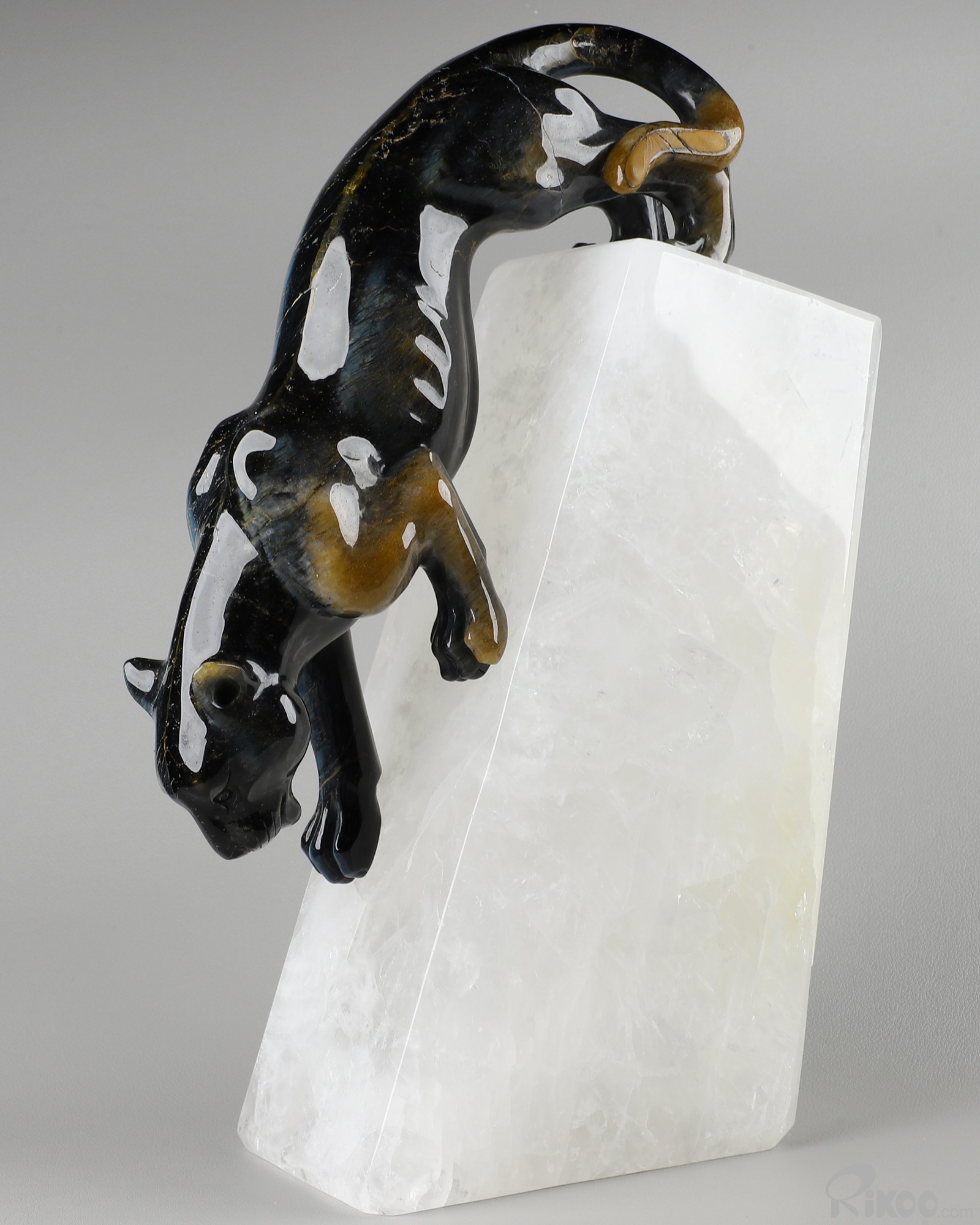 Huge 11.0" Blue Tiger's Eye Carved Crystal Leopard & Angolan Quartz Stand, Realistic