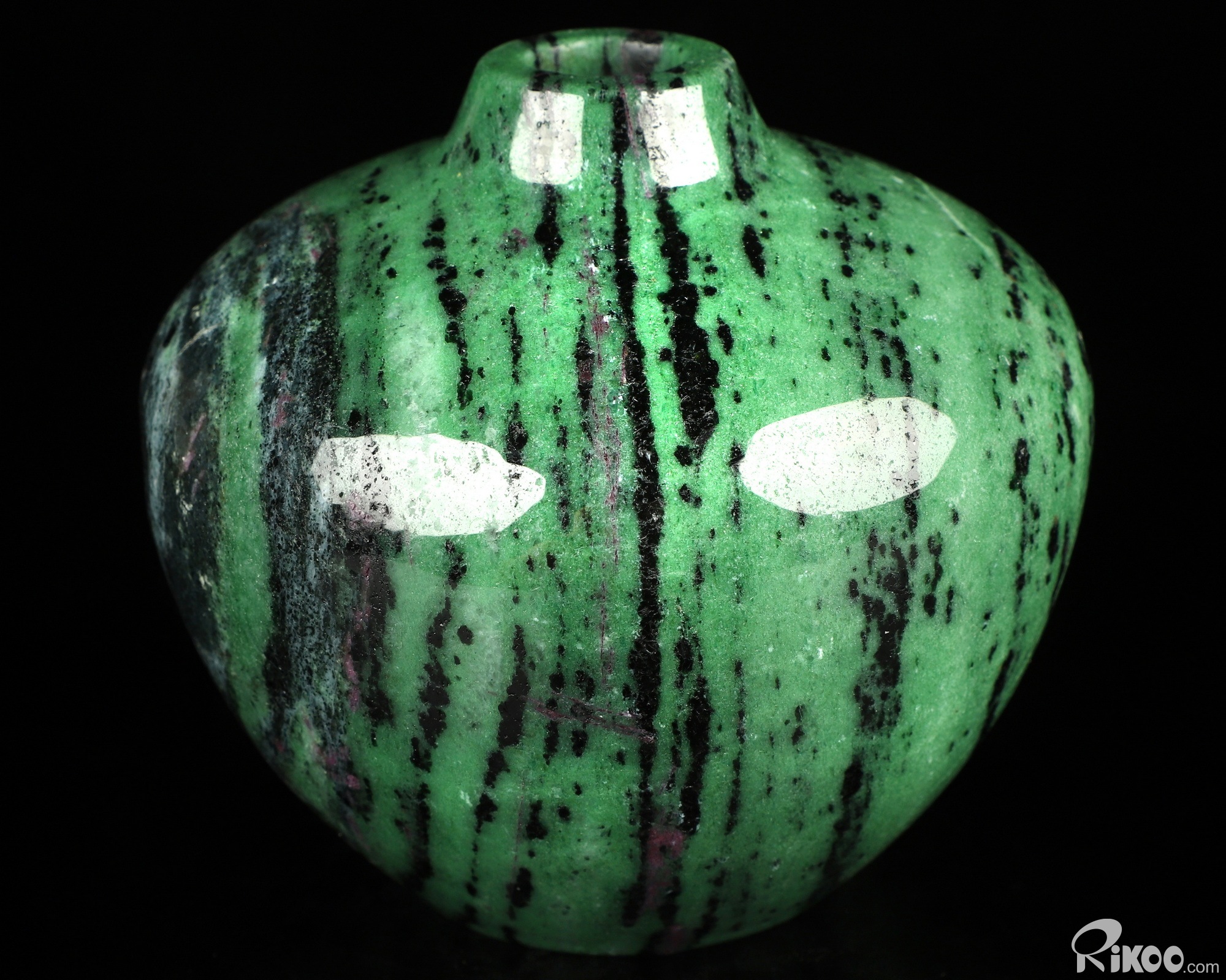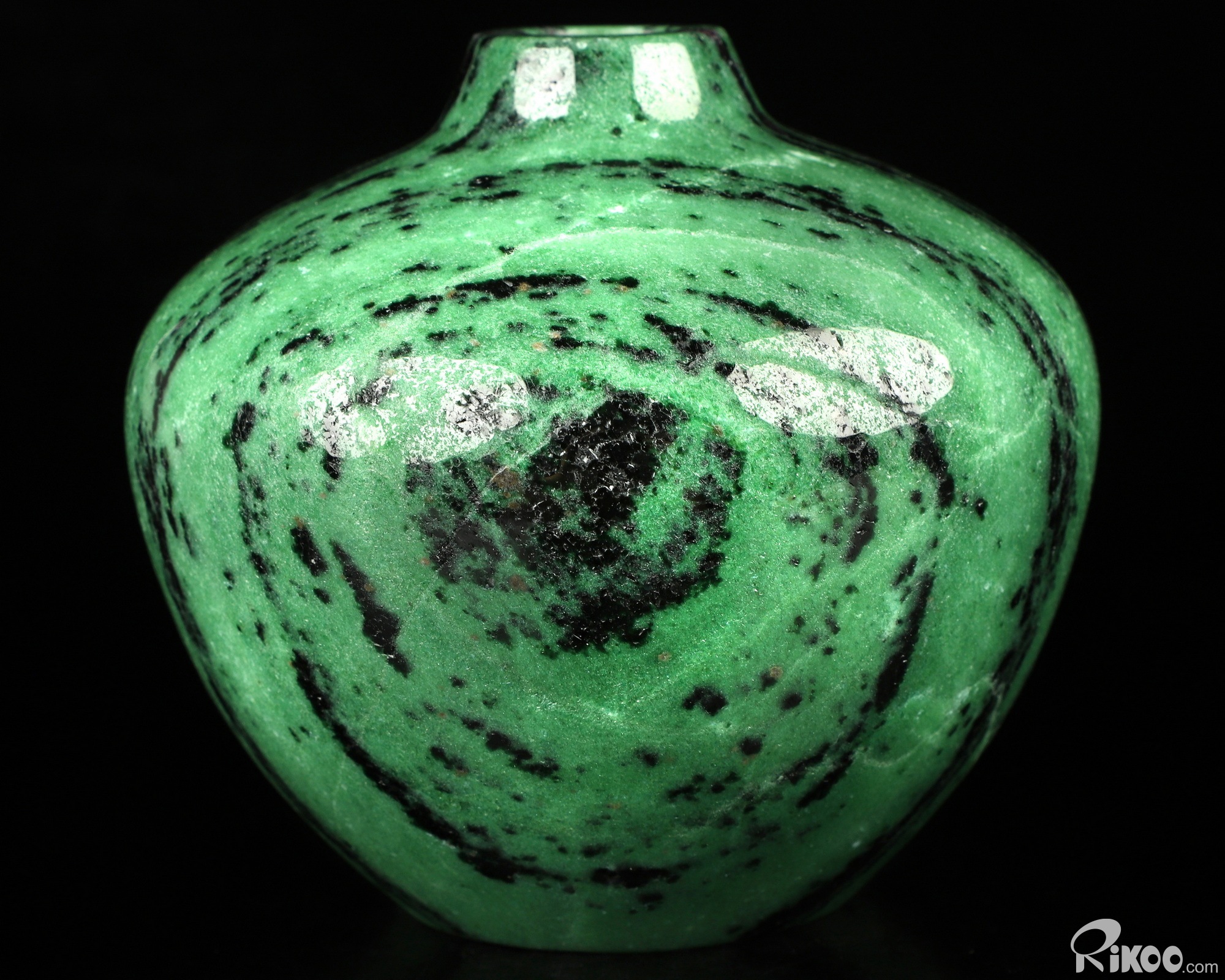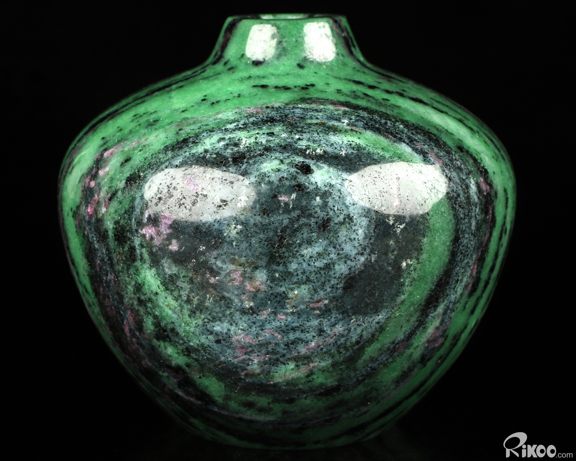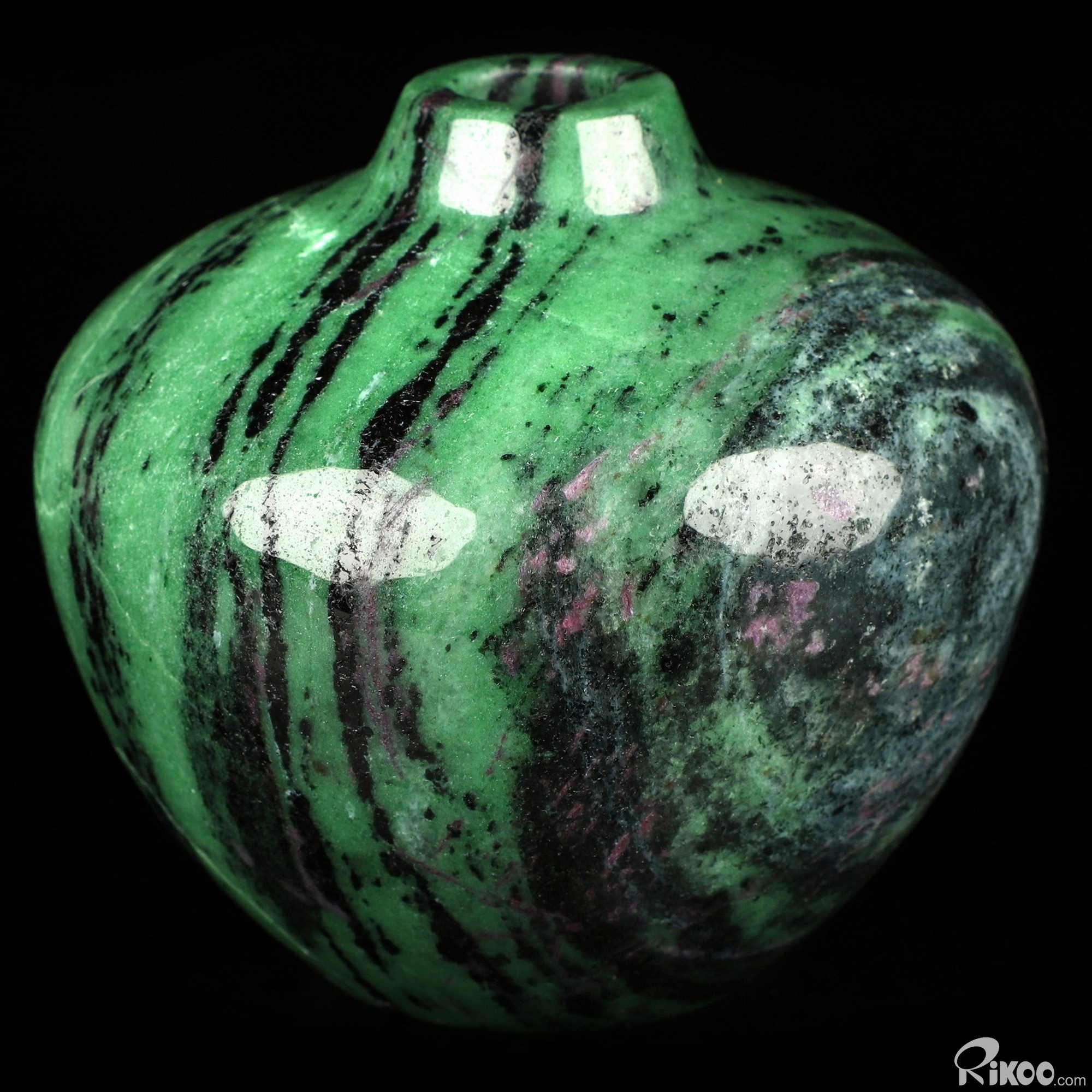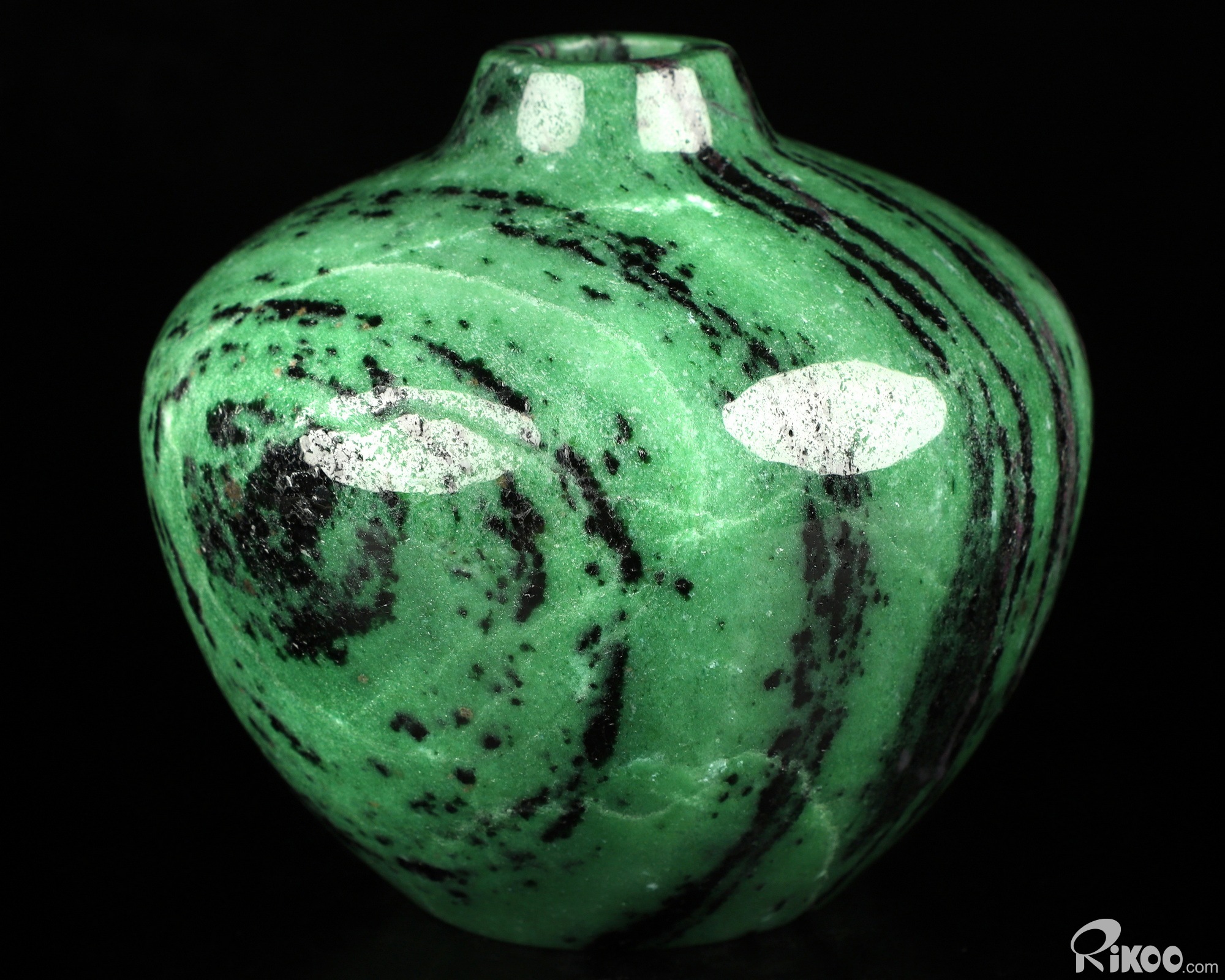 This vase with limited functionality is mainly for display.Green and black, often with red streaks of ruby. For trust in the universe, releasing fears. Strengthens heart, energy/adrenals and reproductive Chakra. General health. This stone can be used to dispel laziness and idleness. It is often used in treating disorders of the middle and upper jaios in Chinese Medicine, considered the heart, spleen, stomach, pancreas and lungs. When Zoisite is shared with ruby in it's matrix, it shares the same metaphysical properties of both stones. When this stone is found in the colors of the upper Chakra, clear, blue, purple, violet, it is considered the rare stone, Tanzanite.