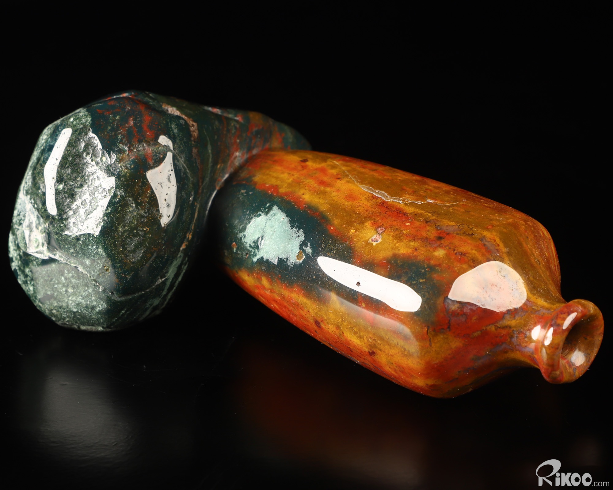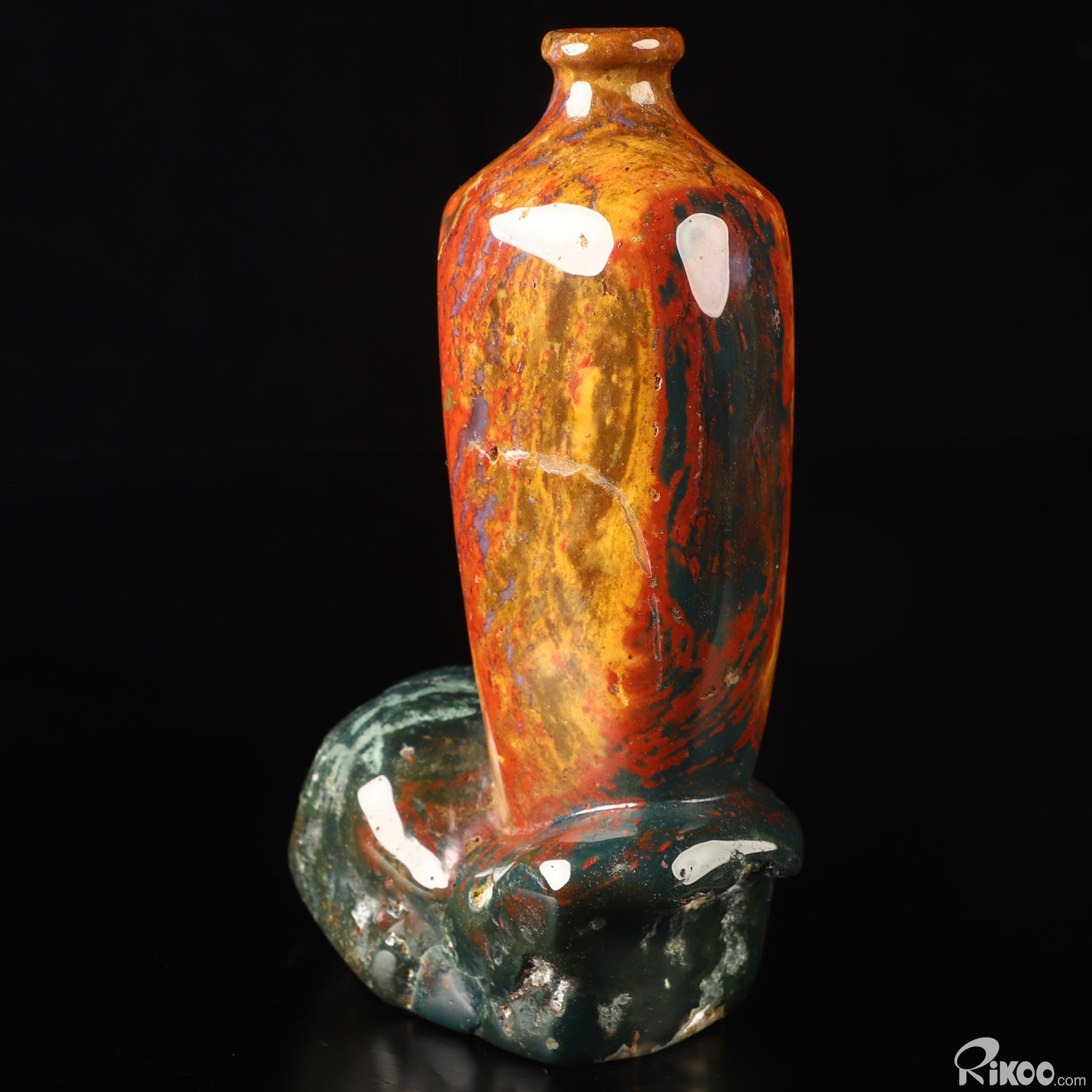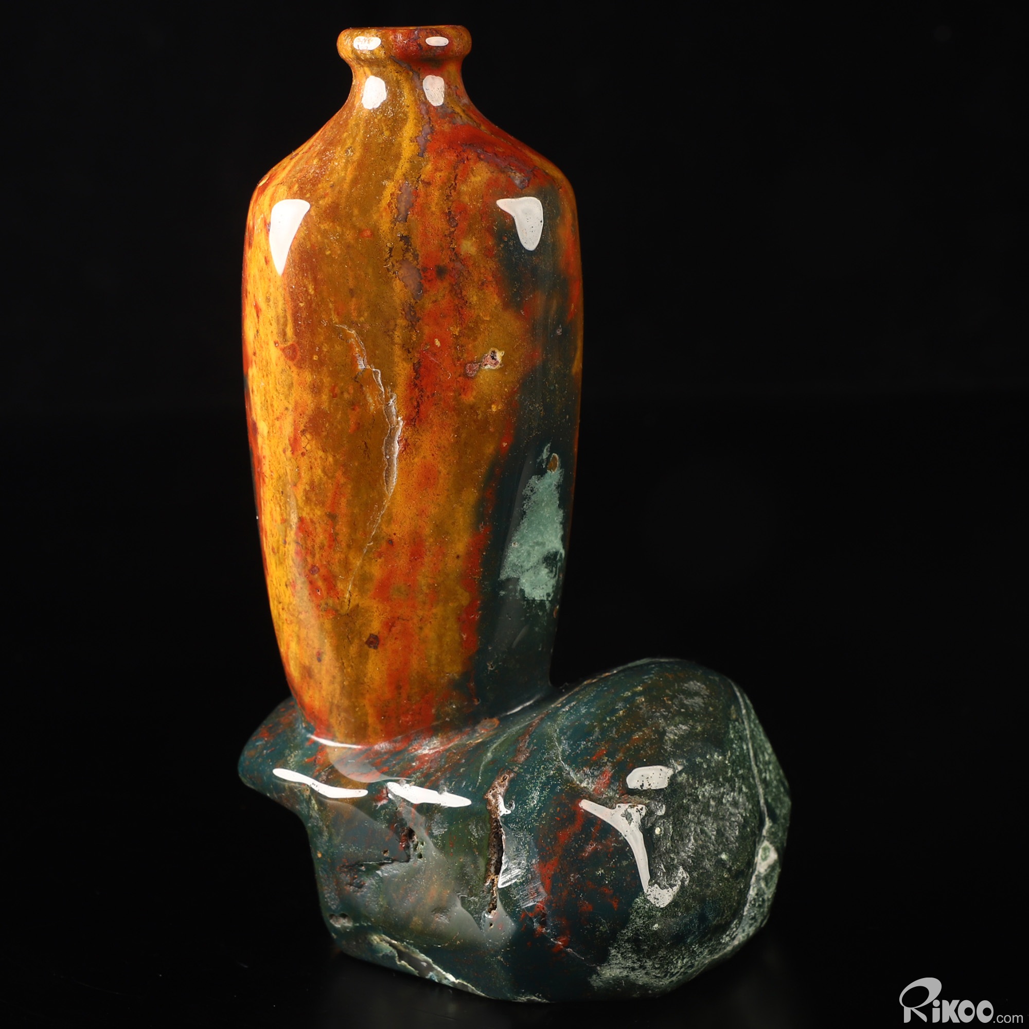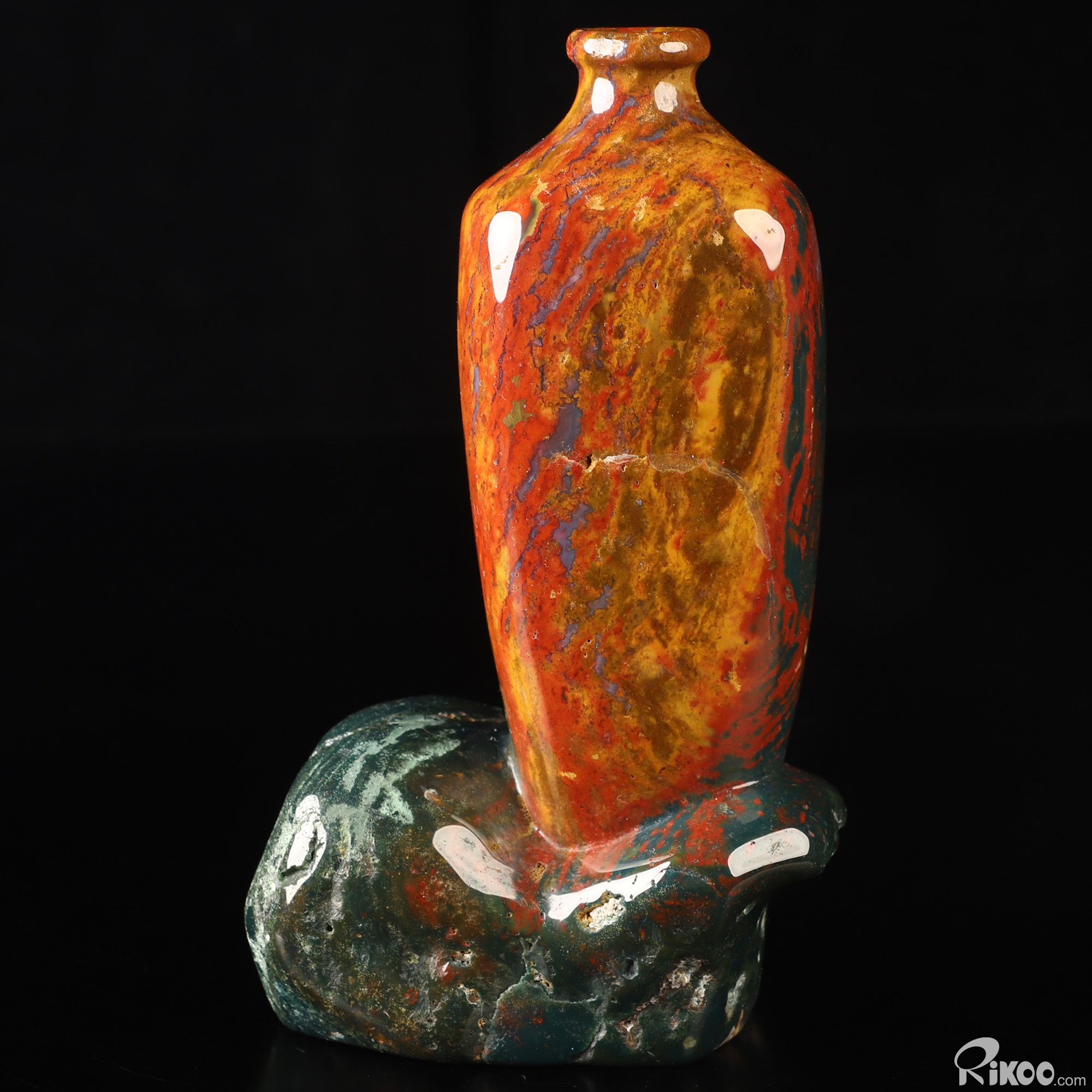 This vase with limited functionality is mainly for display.The martyr stone aptly named, due to the legend of this stone being at the foot of the cross and stained by the drops of blood from Jesus. Metaphysically, bloodstone is used to either promote a calm, tranquil atmosphere that is grounding or revitalize insufficient energy. A great stone for mental exhaustion. This stone represents both courage and strength and is used for achieving these attributes. It is associated with honesty and integrity and is useful in removing obstacles in life. A classic stone for wealth, it attracts abundance and good luck. Most effective on the Heart (green) and Root (red) Chakra.