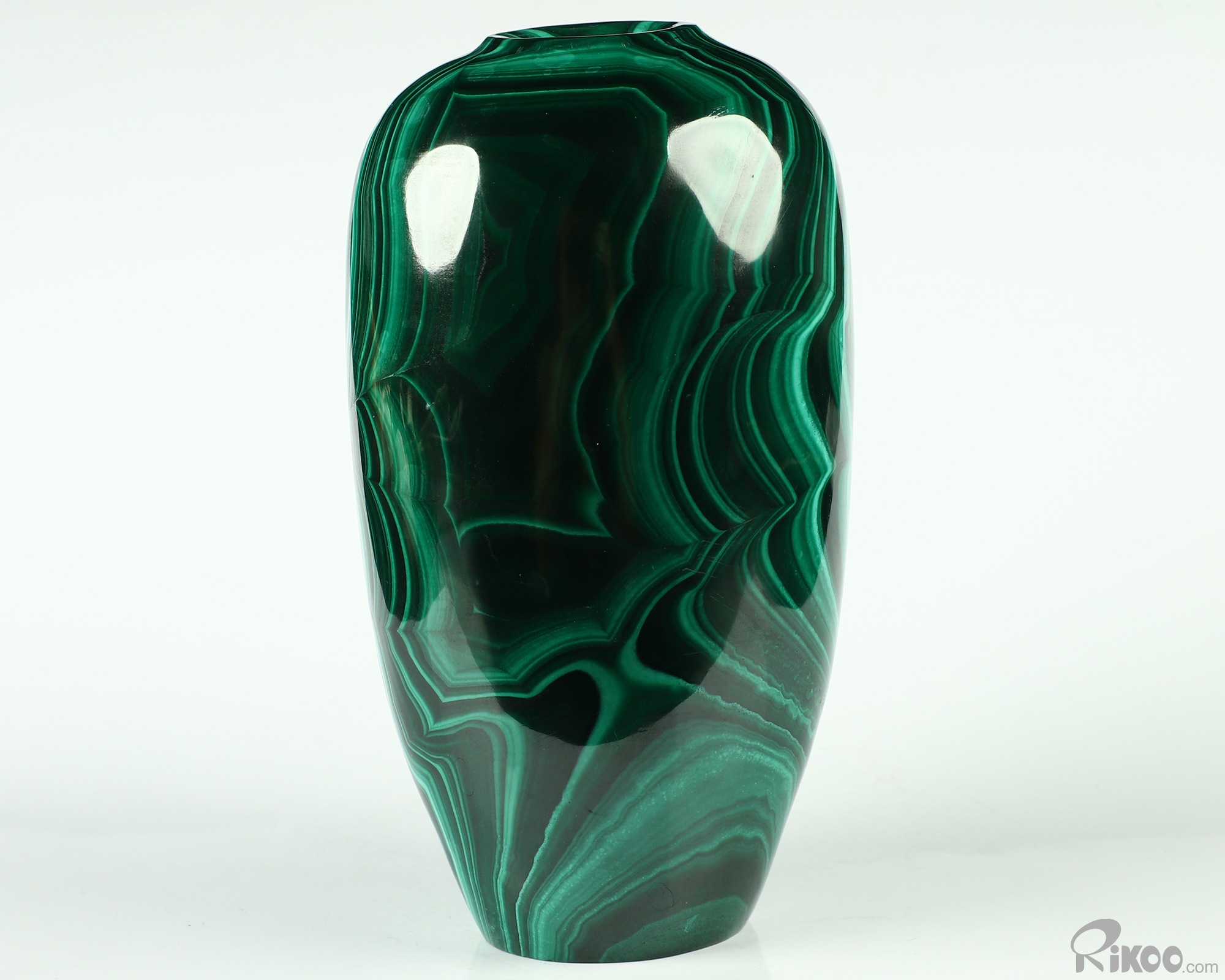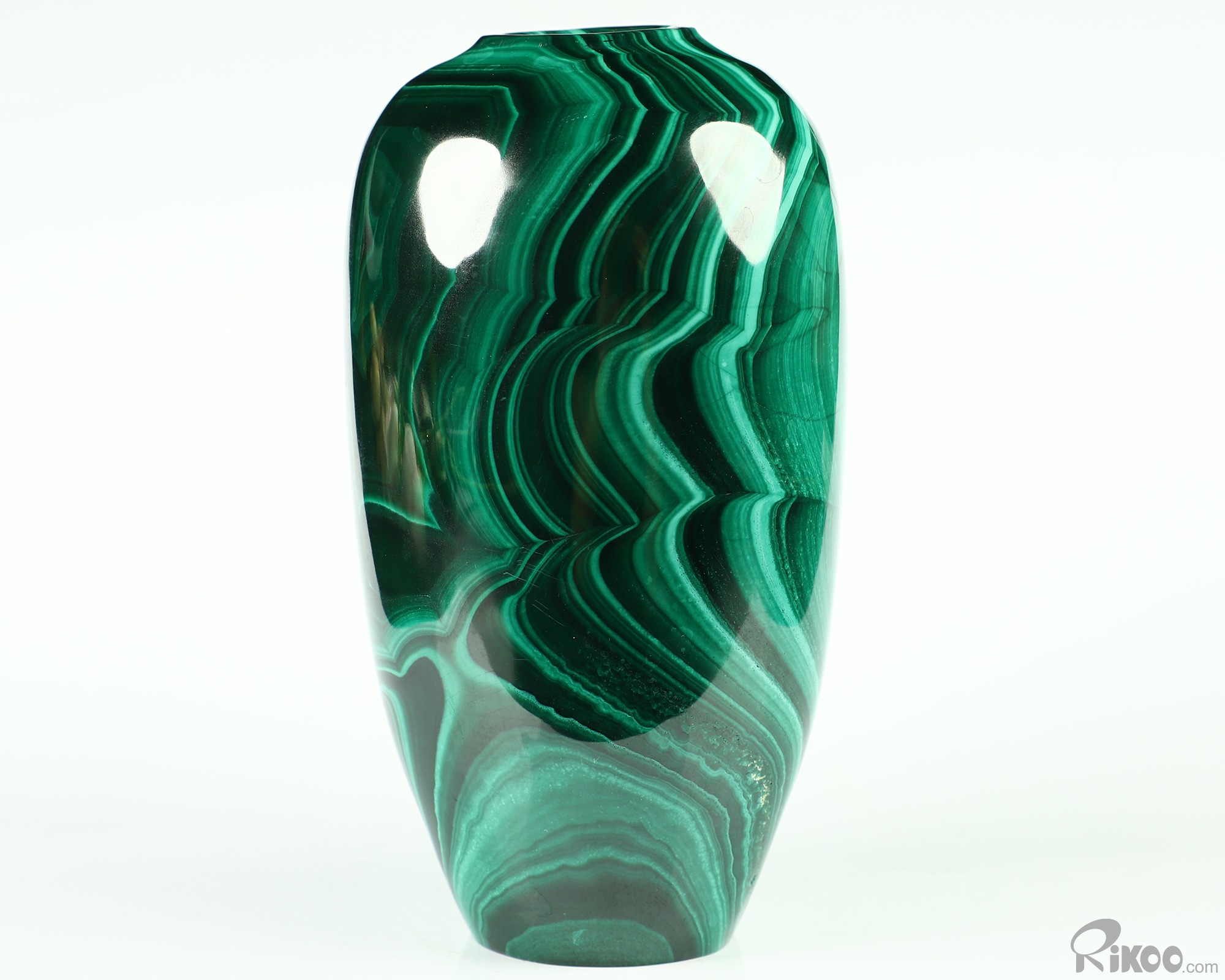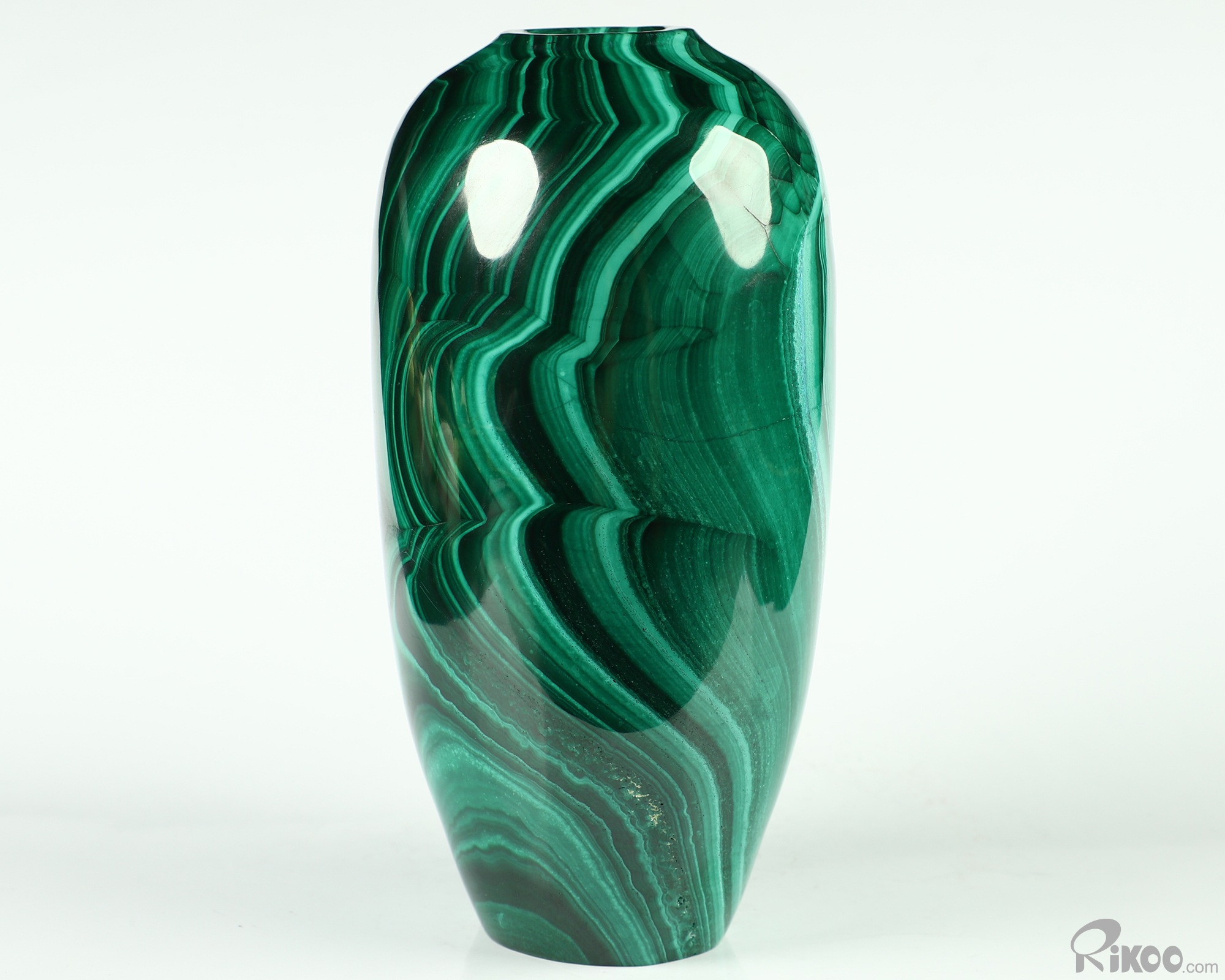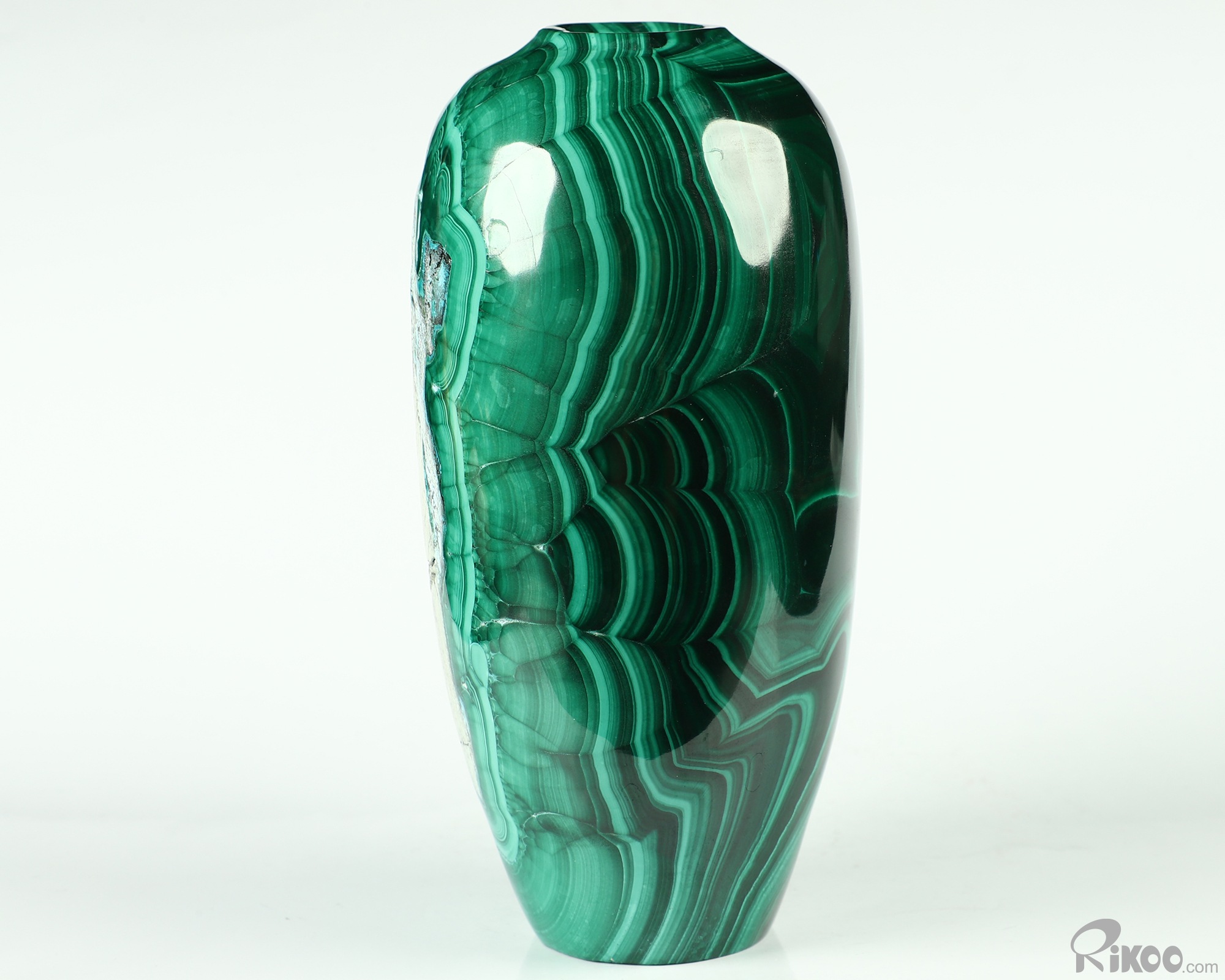 This vase with limited functionality is mainly for display.Steady pulsing electromagnetic energy. (High copper content) Malachite and azurite are the same chemical, practically, Copper Carbonate. The only difference is the ordering of the elements in the molecule. On brow: Stimulates physical and psychic vision, concentration. For heart and solar plexus centers: Stomach, liver, kidney stones, lungs, immune system, radiation, MS, circulation. Powerful healer with azurite or chrysocolla for healing: Releases and draws out pain, inflammation, depression, anger; heals blocks. Protects well by powerfully cleaning the auric field, rapidly absorbing undesirable energies, including: computer, TV, and other radiation, etc. Place in the 4 corners of a room to cleanse carpet toxins/gases. Clean very frequently -- daily if possible! . Often variegated and is one of the basic ores of Copper. Should be used with extreme care because it can amplify negative qualities. Caution must always be used when wearing it as jewelry. However, Malachite also magnifies the positive, and so it is useful if your mood is definitely on the upswing. It should not be used in healing without careful consideration of who is doing the healing. It is useful for relaxation and neurological disorders as well as tissue regeneration. It is said to awaken healing qualities and useful in fighting mental illnesses. Said to stimulate the optic nerve, help the pancreas, spleen, parathyroid, and help dyslexia. People living near nuclear power plants should keep pieces of Malachite in their homes, since Malachite may expel plutonium. A warning: Malachite in raw form has dust particles that are highly toxic and their ingestion should be avoided