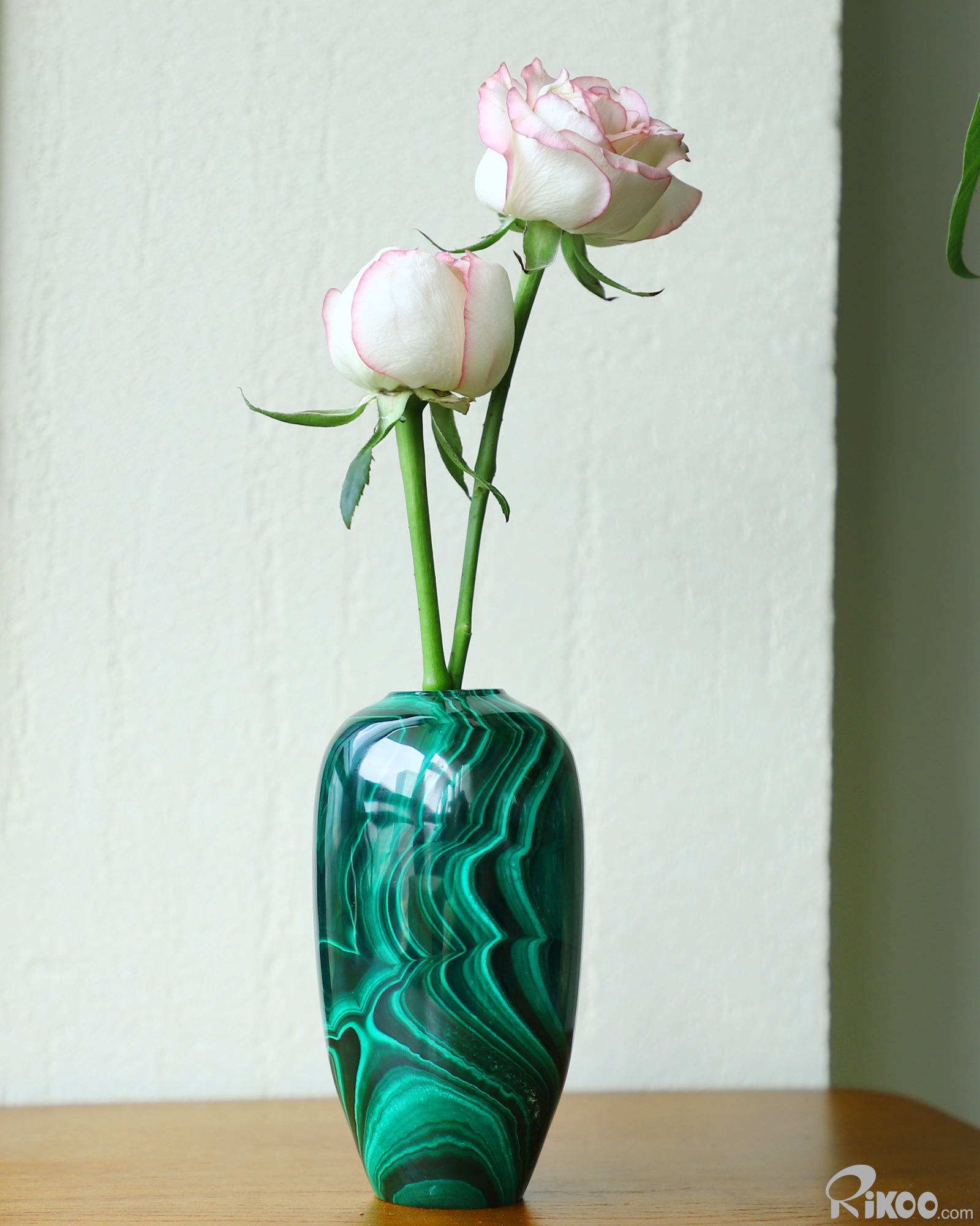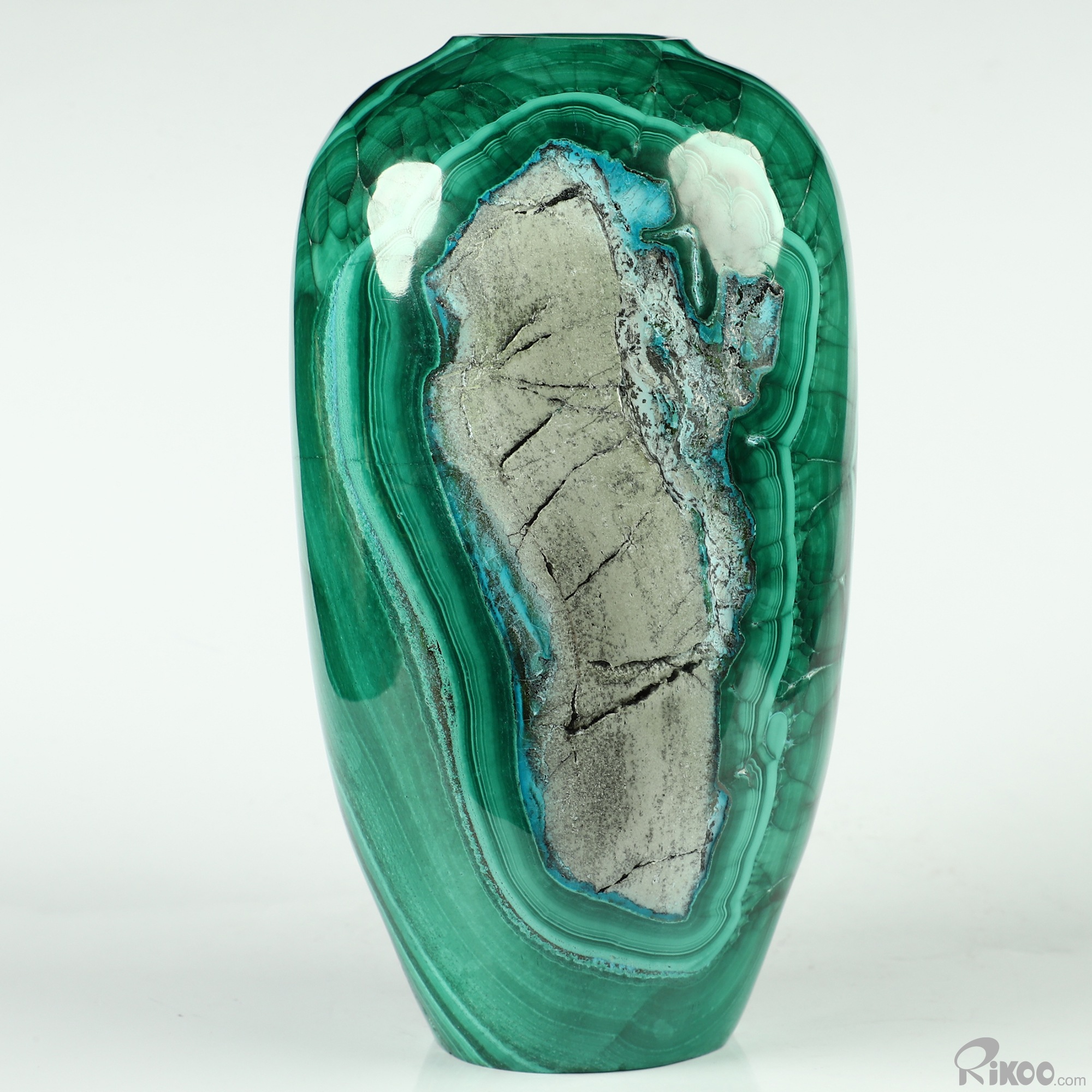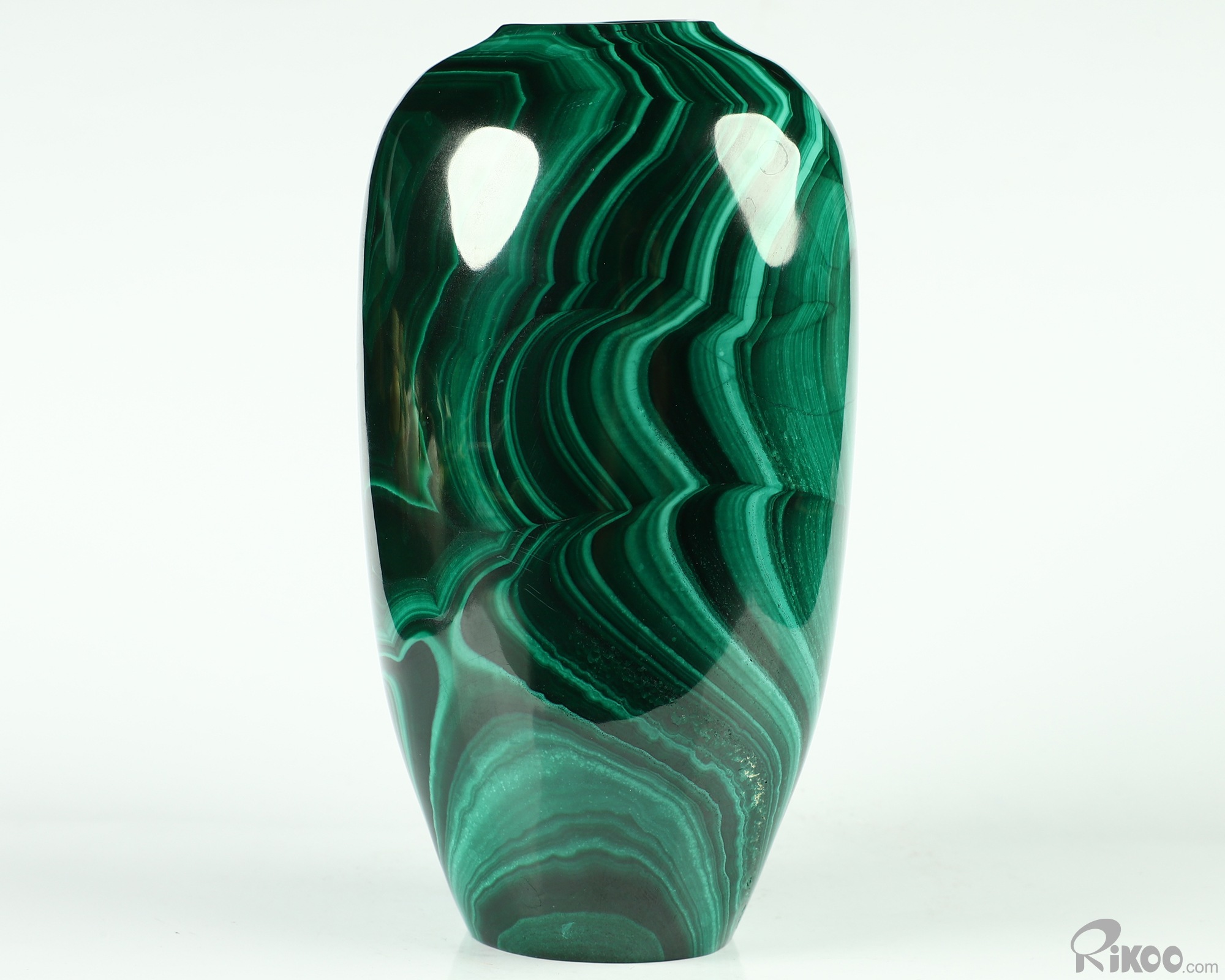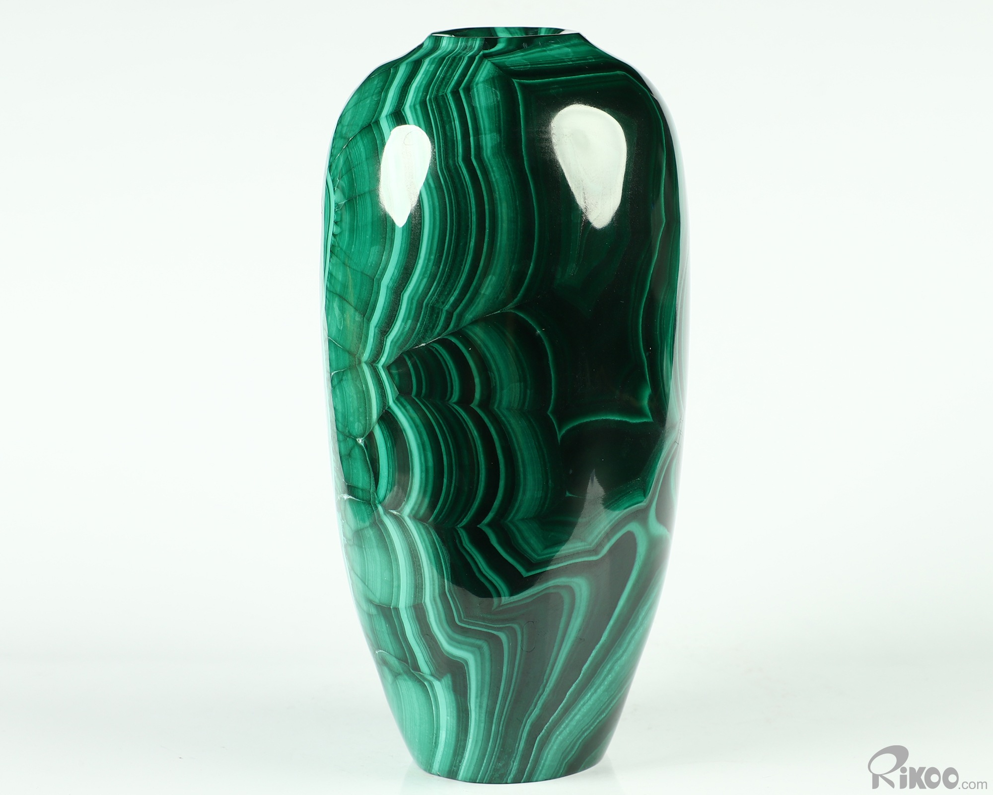 This vase with limited functionality is mainly for display.Steady pulsing electromagnetic energy. (High copper content) Malachite and azurite are the same chemical, practically, Copper Carbonate. The only difference is the ordering of the elements in the molecule. On brow: Stimulates physical and psychic vision, concentration. For heart and solar plexus centers: Stomach, liver, kidney stones, lungs, immune system, radiation, MS, circulation. Powerful healer with azurite or chrysocolla for healing: Releases and draws out pain, inflammation, depression, anger; heals blocks. Protects well by powerfully cleaning the auric field, rapidly absorbing undesirable energies, including: computer, TV, and other radiation, etc. Place in the 4 corners of a room to cleanse carpet toxins/gases. Clean very frequently -- daily if possible! . Often variegated and is one of the basic ores of Copper. Should be used with extreme care because it can amplify negative qualities. Caution must always be used when wearing it as jewelry. However, Malachite also magnifies the positive, and so it is useful if your mood is definitely on the upswing. It should not be used in healing without careful consideration of who is doing the healing. It is useful for relaxation and neurological disorders as well as tissue regeneration. It is said to awaken healing qualities and useful in fighting mental illnesses. Said to stimulate the optic nerve, help the pancreas, spleen, parathyroid, and help dyslexia. People living near nuclear power plants should keep pieces of Malachite in their homes, since Malachite may expel plutonium. A warning: Malachite in raw form has dust particles that are highly toxic and their ingestion should be avoided