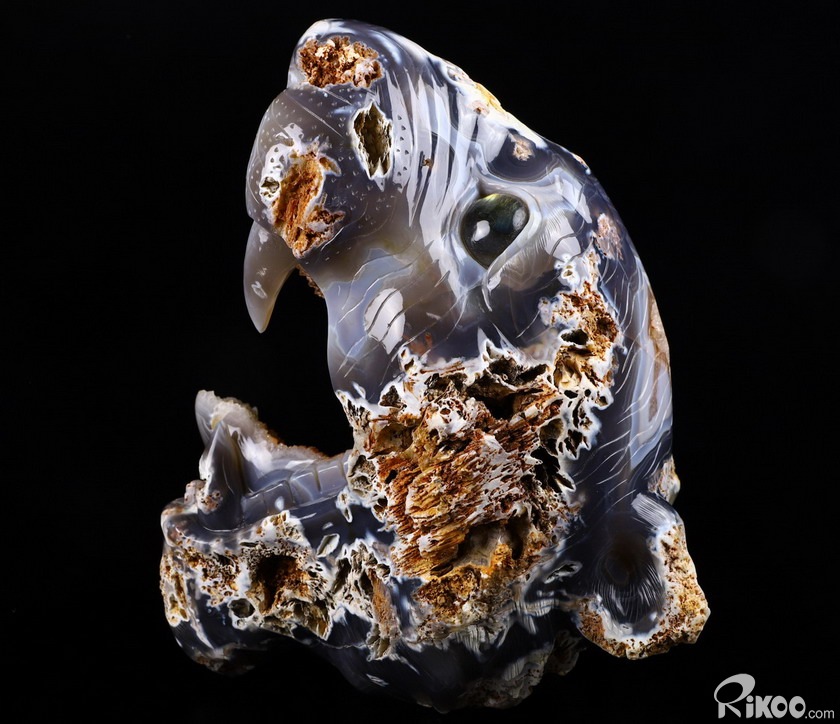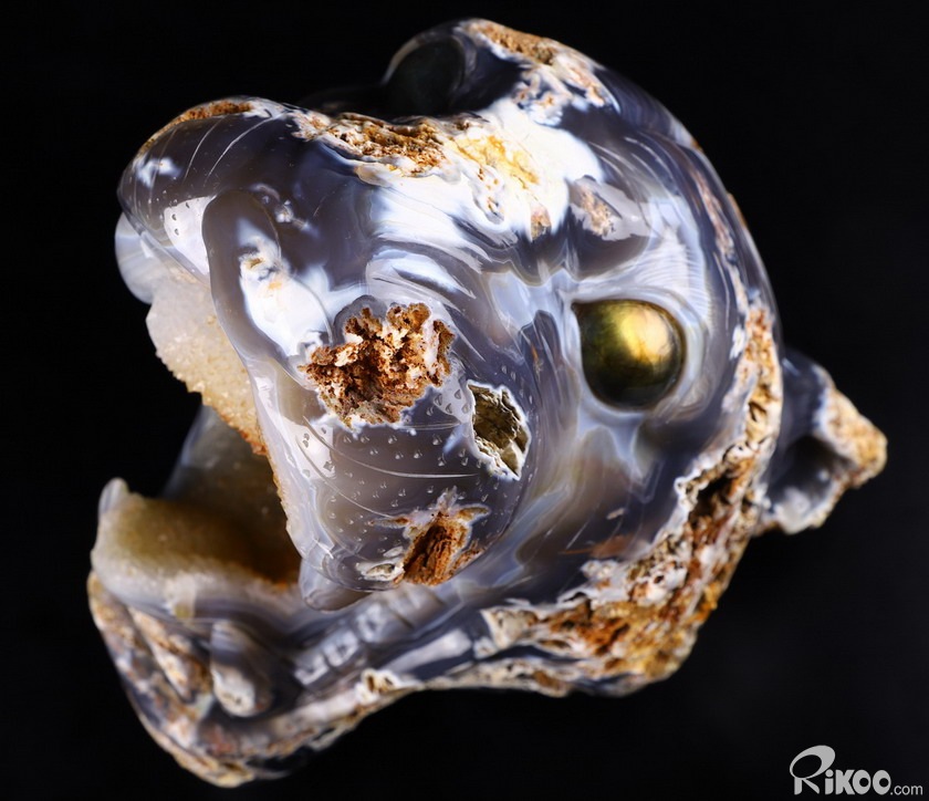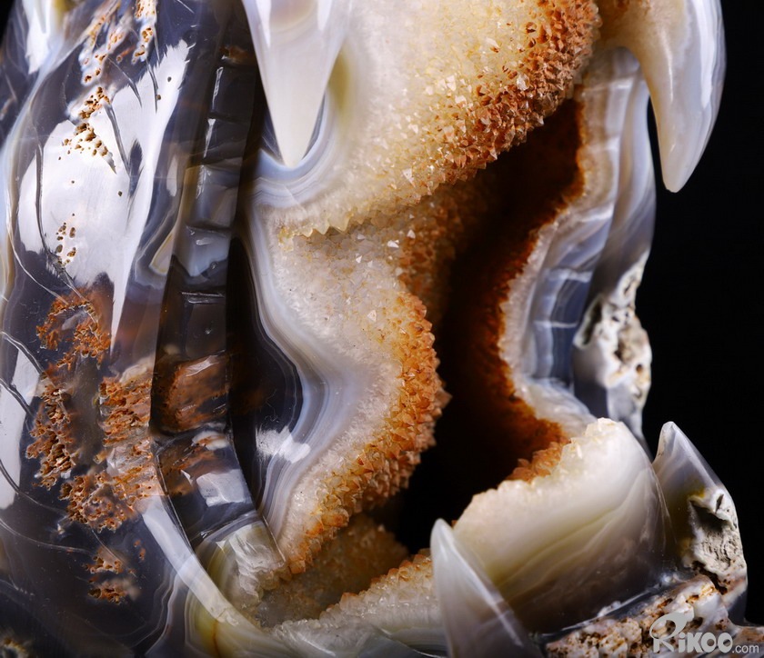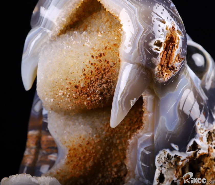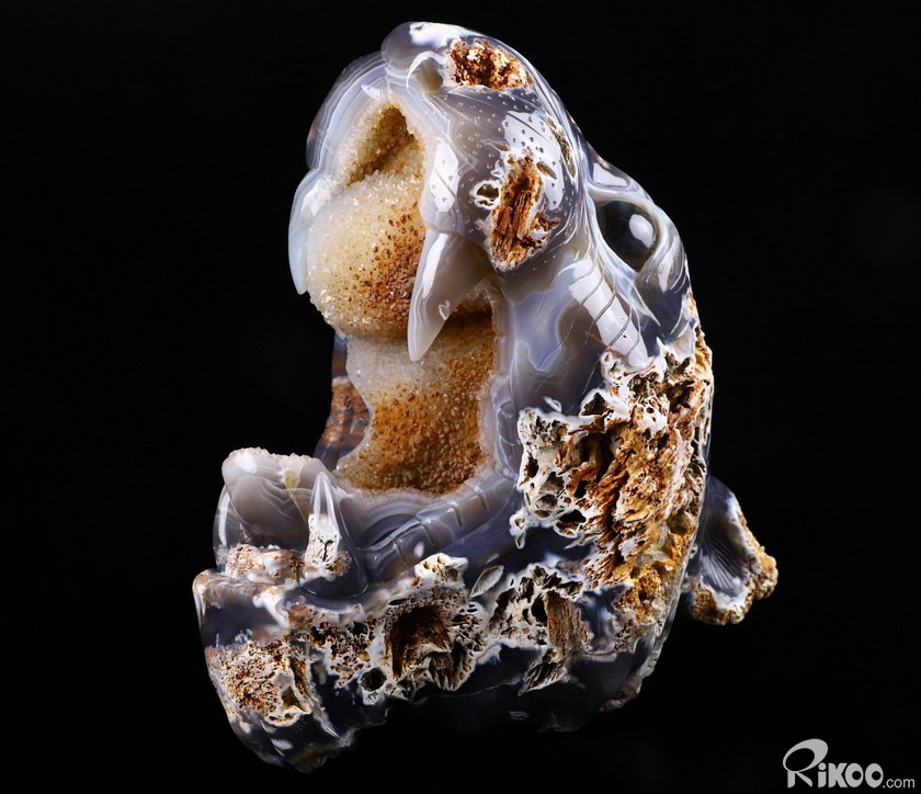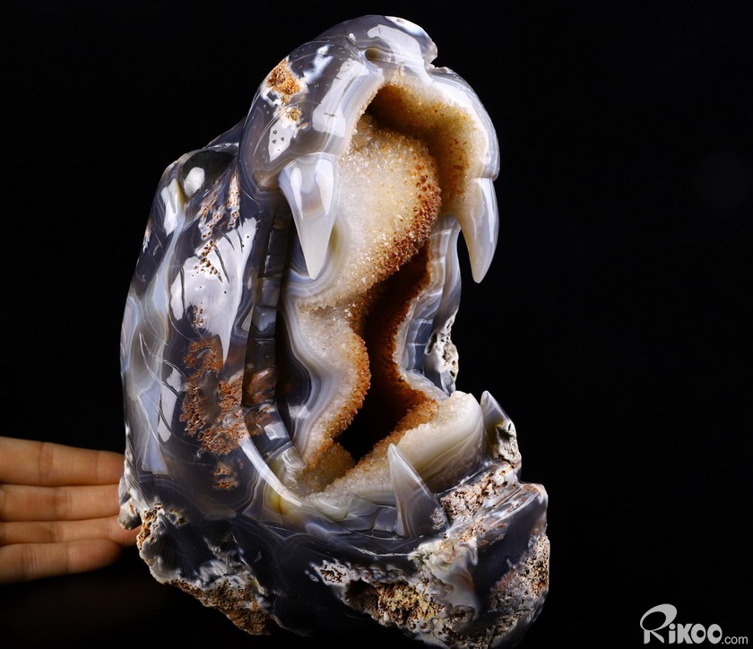 You are looking at a Agate geode skull. The skull is 8.7 inches long from front to back.