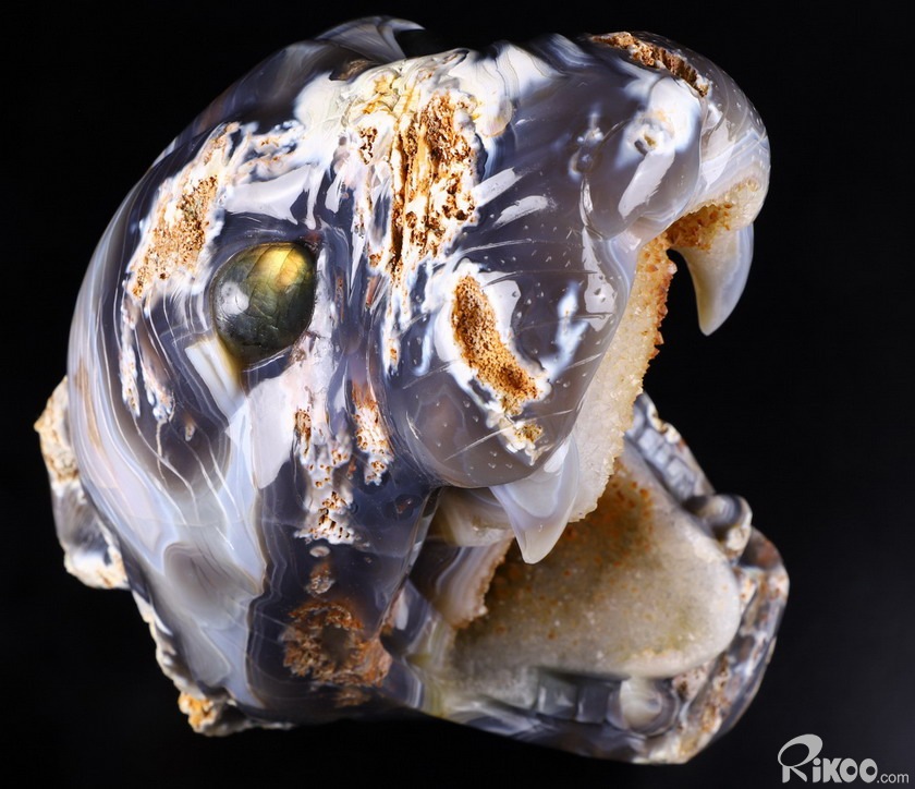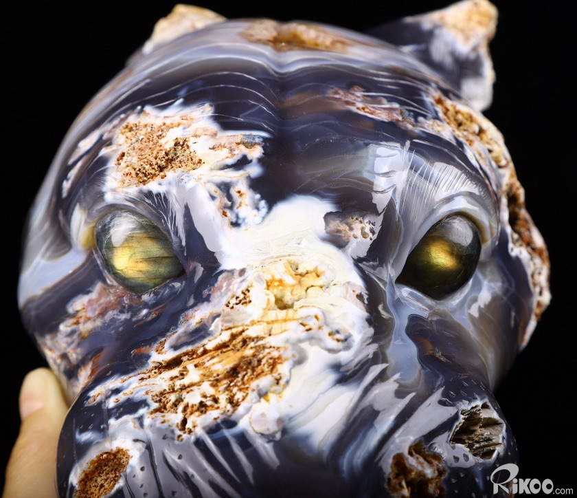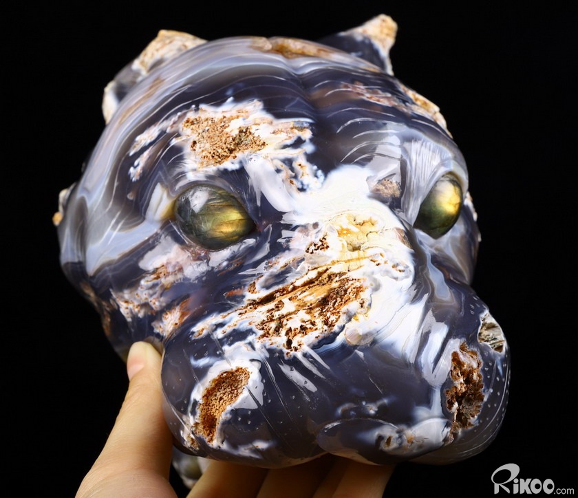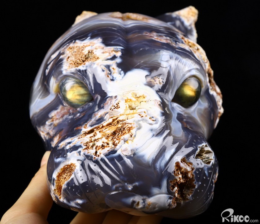 Huge 7.0" Agate geode Crystal Leopard Head Sculpture, Labradorite Eyes
