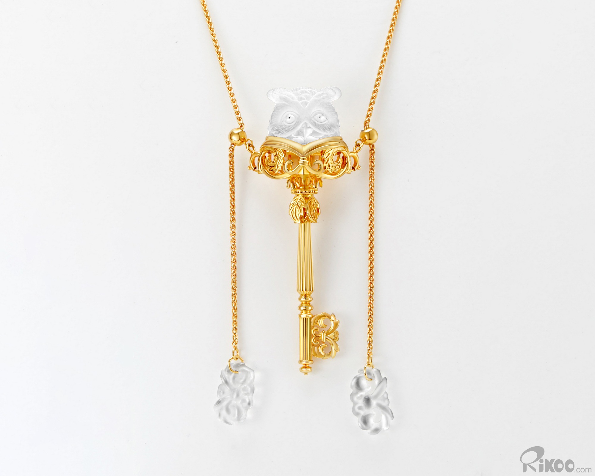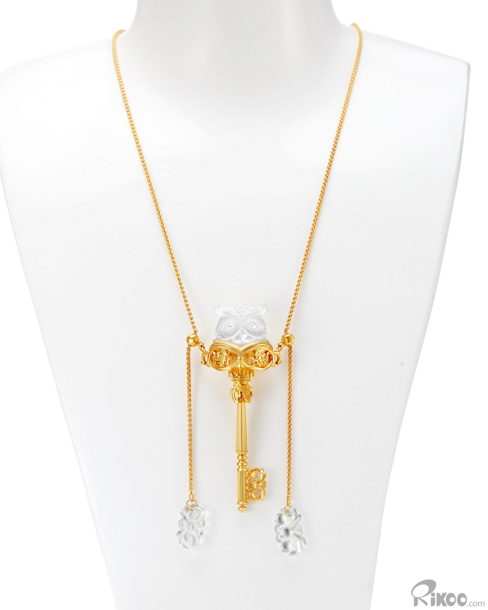 Necklace of 3.1" Frosted Quartz Hand Carved Crystal Owl Pendant, 18K Gold-Plated 925 Sterling Silver