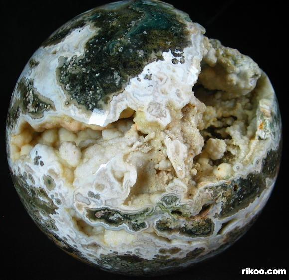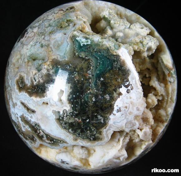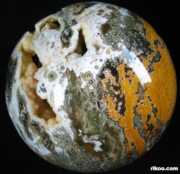 Another exceptional quality of Ocean Jasper is translucency. Many specimens are opaque and still very beautiful while others, when held in front of a strong light source, display what can only be described as another world! When viewed in front of a bright light the translucent, clear, or just foggy background illuminates and displays the contrasting solid perfect circles –the orbs- which then reveal exactly why Ocean Jasper is sometimes called "Fish Eye Jasper". These solid, soft looking spheres appear suspended in the illuminated quartz, and they can make one tempted to reach in and try to touch them!