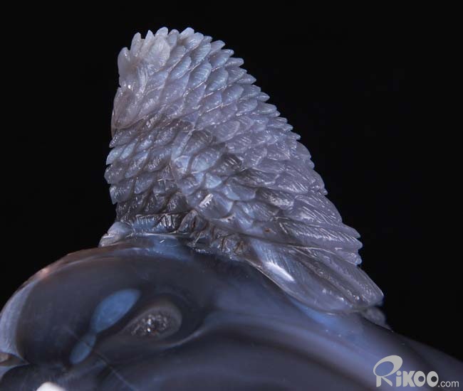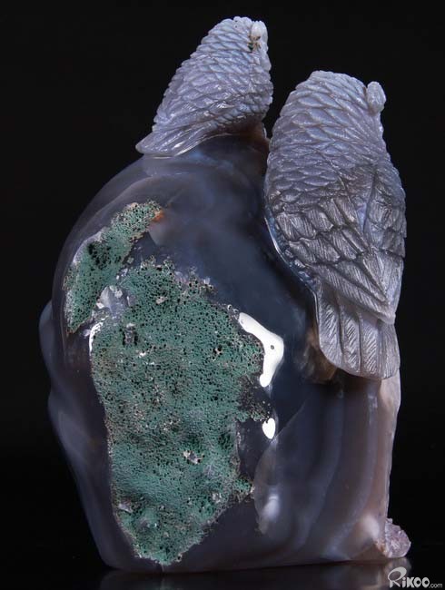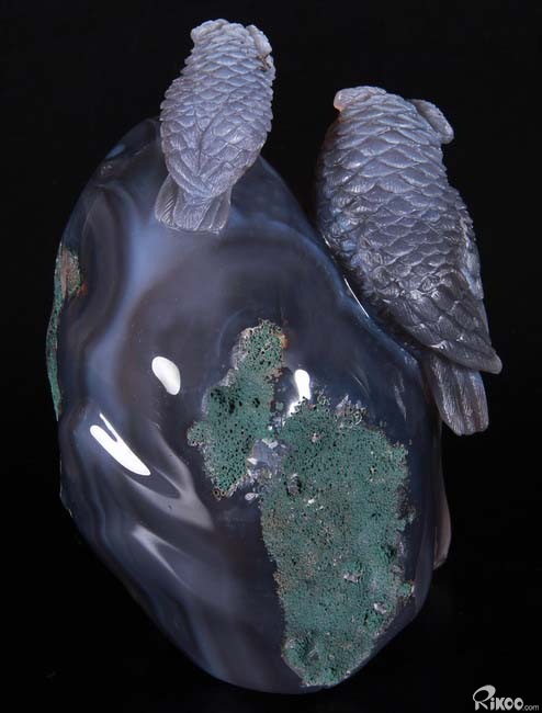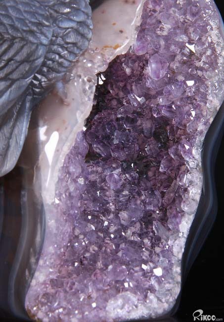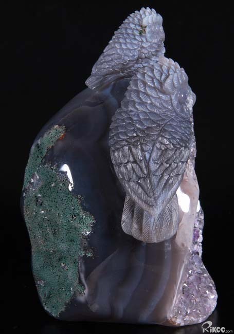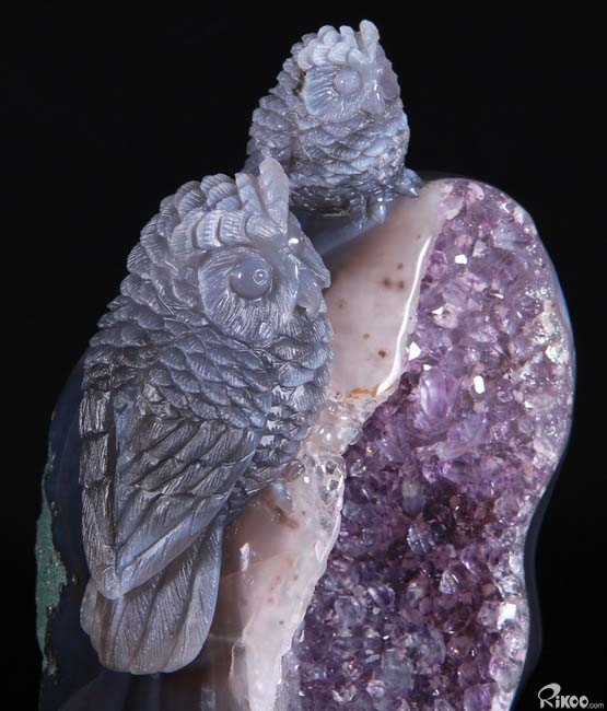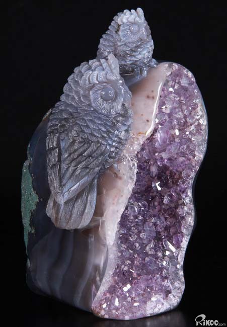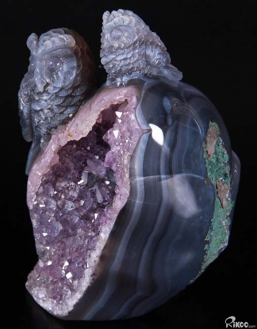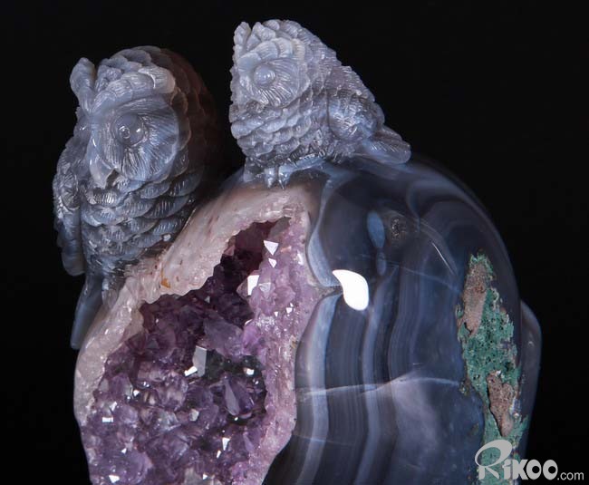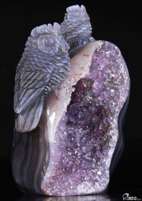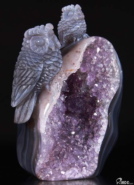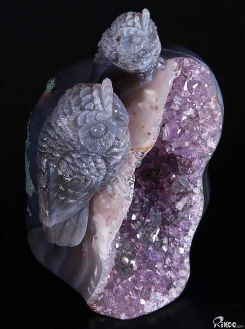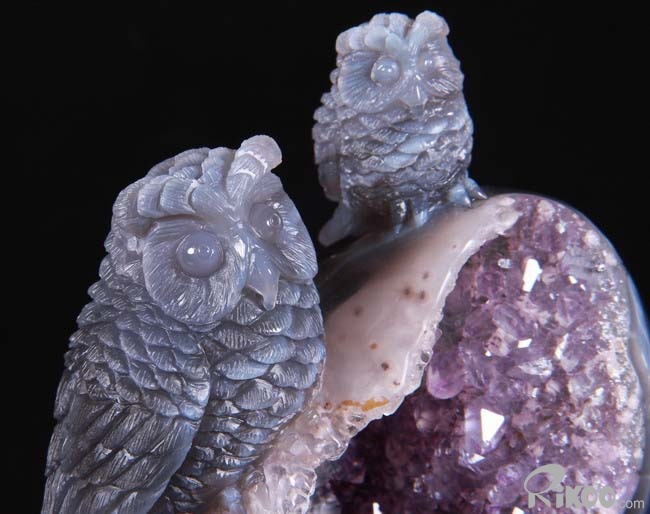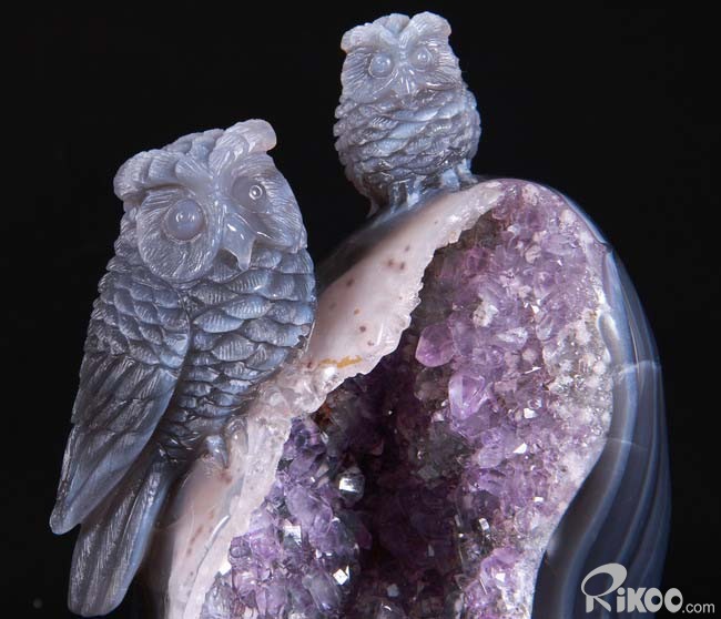 Stunning, 5.5" Agate Amethyst Geode, Druse Crystal Owls Carving Sculpture
