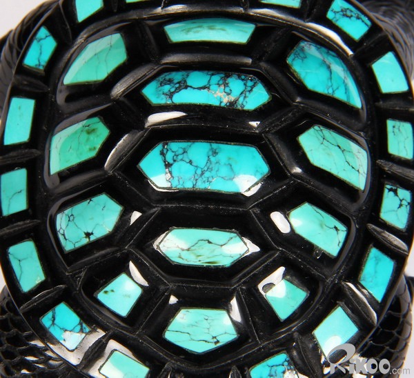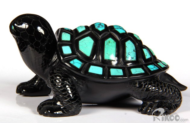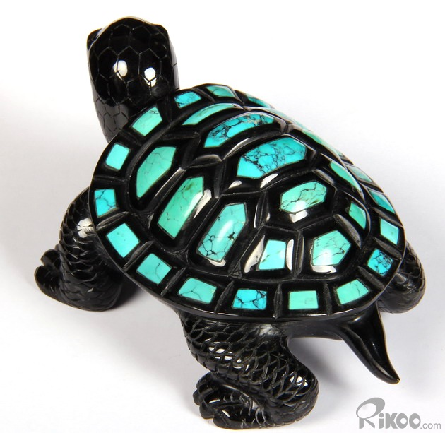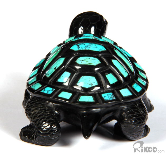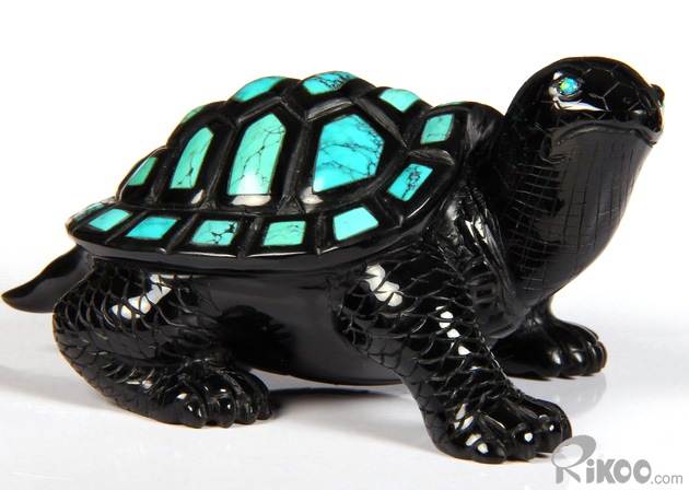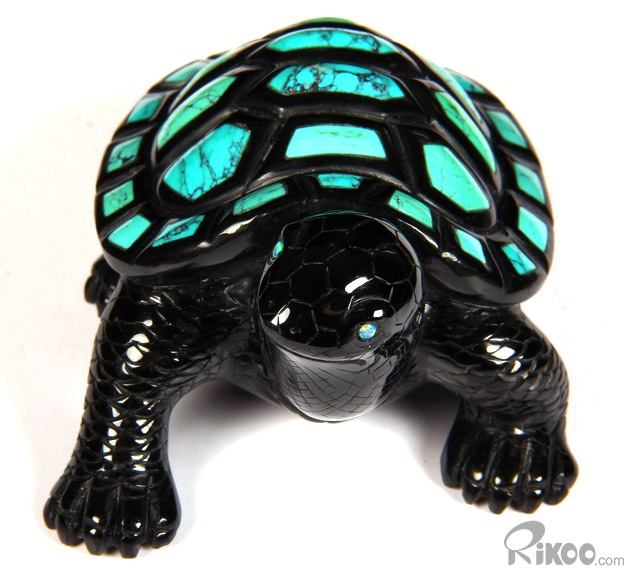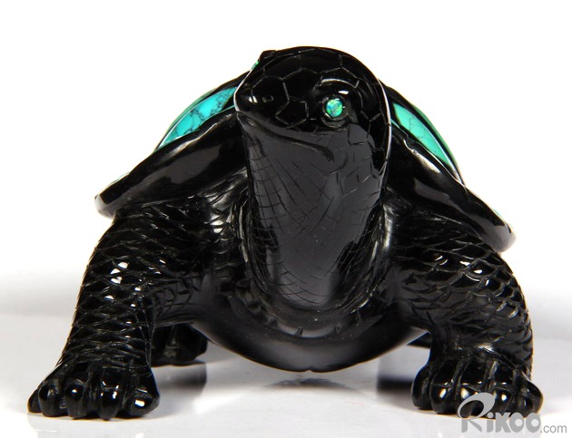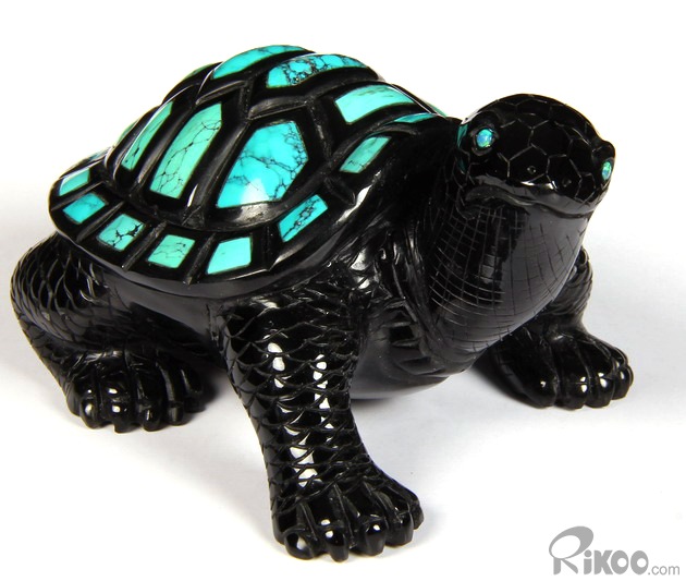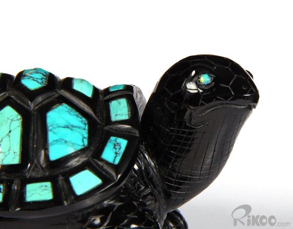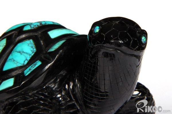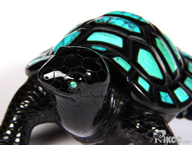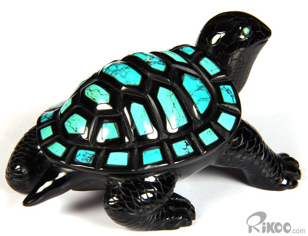 Stunning Opal Eyes 4.4" Turquoise & Black Obsidian Carved Crystal Turtle