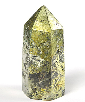 One of the most grounding stones in use today. Conducting, Energizing, Increases Wealth. Used for focus, practicality, logic, memory, clearing fuzzy thinking/scatteredness etc. like Hematite. Helps Yellow Chakra: Stomach, intestines, ulcers; sulfur and mineral assimilation, circulation, body acidity imbalances, depression, illusions/lack of clarity about situations/people. Great for grounding spiciness after meditation/psychic readings. Represents Sun's golden energy. A mineralized crystal that forms in clusters of metallic like cubes. Color varies from a bright gold or brass to shades of copper or green. Found in most of North America as well as in Chile and Peru. "Fool's Gold". Beneficial to the respiratory and circulatory systems. Connected to the transfer of oxygen from the lungs to the bloodstream. Helps the skin protect itself from the elements, and also aids the digestive tract, lessening irritation by ingested toxins. The most important gift of Pyrite, though, is its ability to aid mental capacity. Helps to balance creative and intuitive impulses with scientific and practical ones. communication skills can also improve with the help of Pyrite, which eases anxiety and frustration. Strongly suggested for people who tackle large conceptual ideas in business, the arts, or education. Effective in attracting money to its owner. The stimulation of the mind can be enhanced by using Pyrite in conjunction with Fluorite and Calcite.